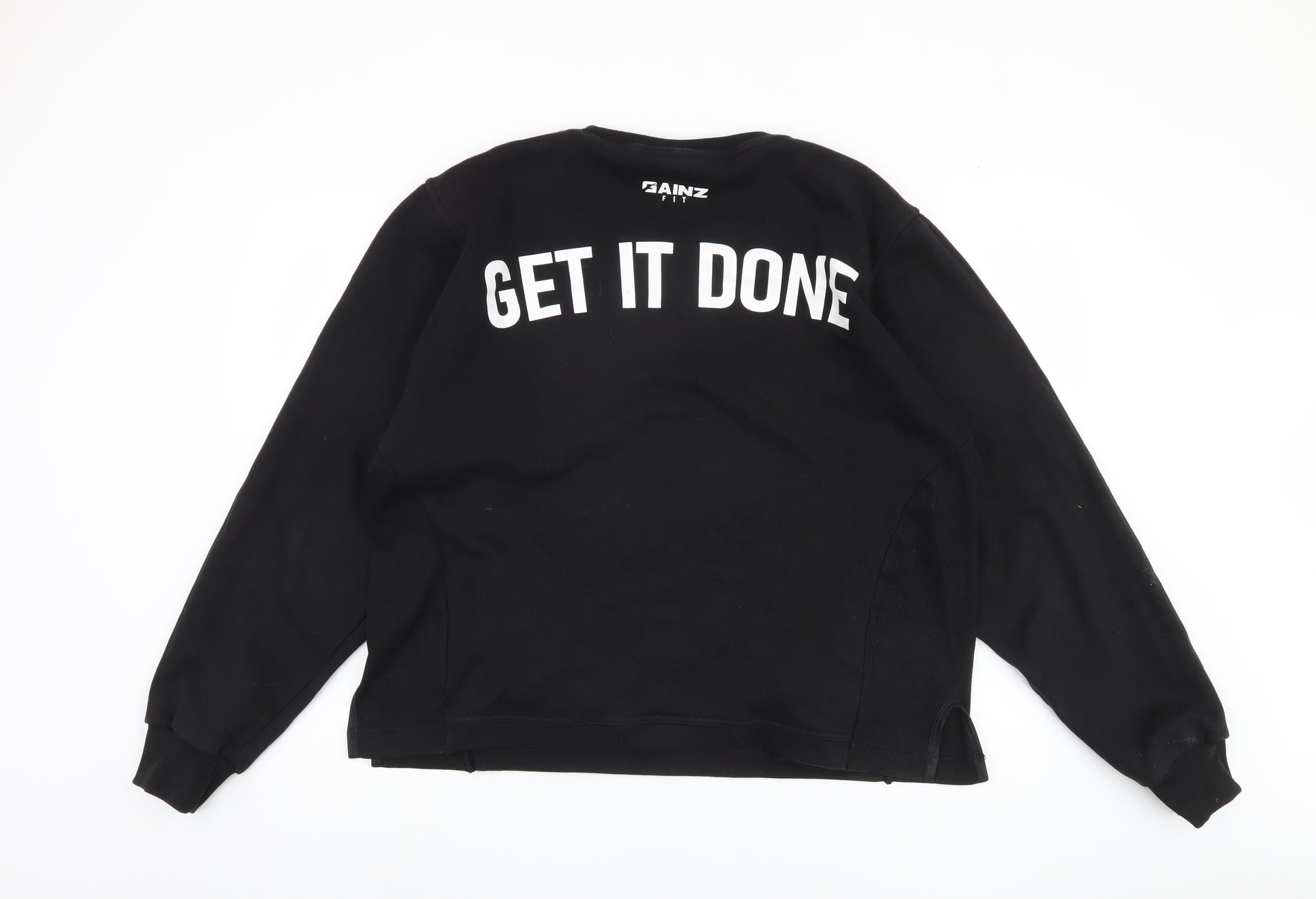 Step up your fitness wardrobe with the GAINZ FIT Men's Black Pullover Sweatshirt. Perfect for gym-goers and fitness enthusiasts, this sweatshirt combines comfort and style in one versatile piece. With its sleek black colour and bold logo accents, it's designed for those who love to make a statement while staying active.Crafted in a relaxed fit, this sweatshirt ensures you have full mobility during your workouts. The crew neck and long sleeves offer a classic style, suitable for layering in cooler temperatures or wearing alone during intense sessions. Its graphic print design at the back, showcasing the motivational 'GET IT DONE' slogan, adds a unique touch to inspire you through every rep and set.Ideal for an active lifestyle, this sweatshirt is tailored for gym and training activities. Whether you're lifting weights, running, or enjoying a group class, it moves with you, providing comfort and breathability. Designed for all seasons, it ensures you're always prepared, no matter the weather.Even beyond the gym, its contemporary design and versatile appeal make it perfect for casual outings and leisurewear. Constructed with quality fabric, this GAINZ FIT sweatshirt offers durability you'd expect from a trusted brand, maintaining its look and feel over time.With no visible signs of wear, this piece remains in excellent condition, ready to become a staple in your collection. Embrace the modern athletic aesthetic with this essential wardrobe addition, offering not just style but a reminder to always 'GET IT DONE'.