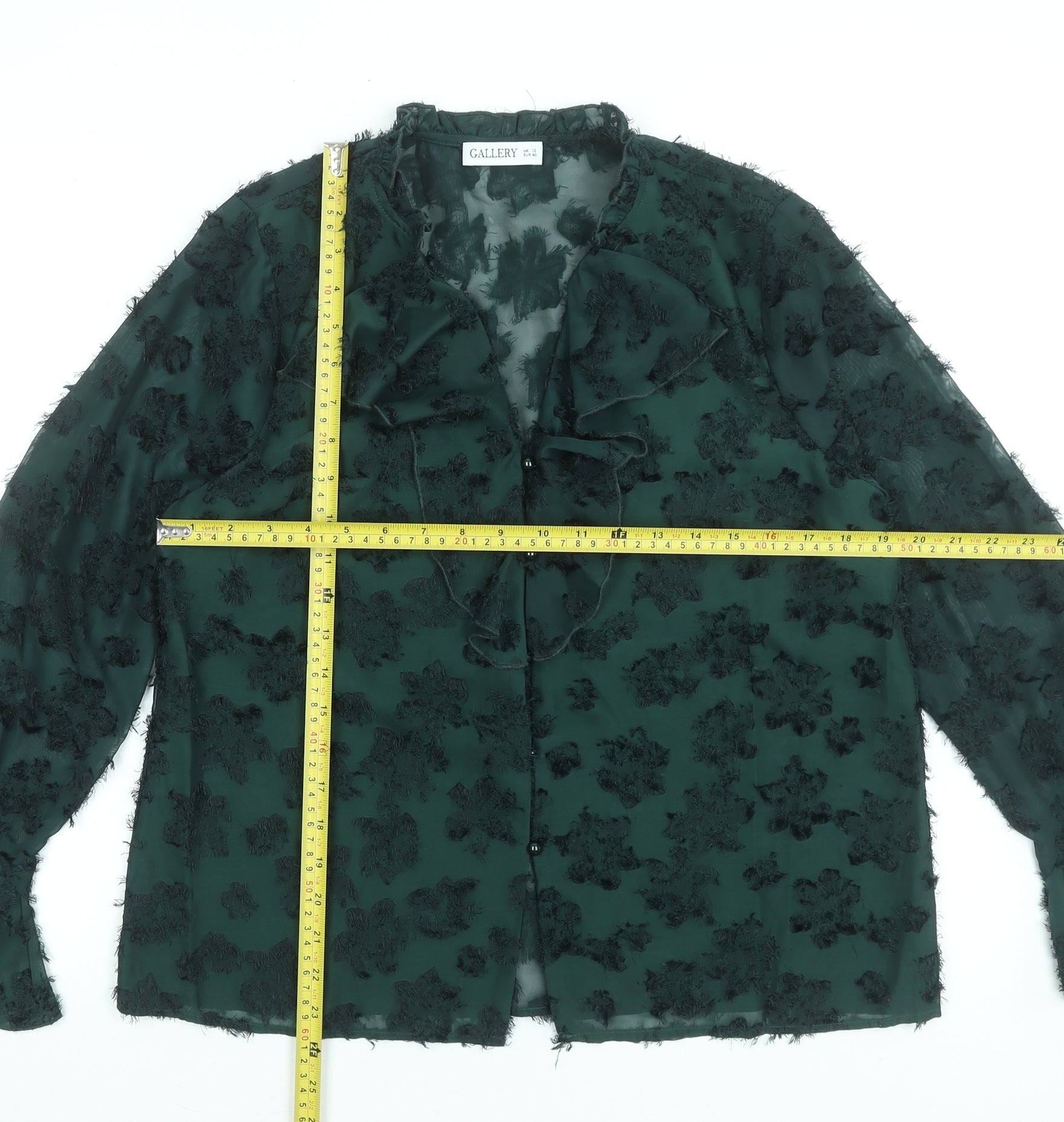 Step out in timeless elegance with this beautiful green floral blouse by Gallery. Designed for women who appreciate both style and comfort, this piece offers a feminine silhouette with its delicate chiffon fabric and textured floral pattern. The blouse features long, flared sleeves that add a graceful flow, while ruffled detailing around the neckline introduces a touch of classic charm. Crafted from lightweight polyester, the material feels airy and soft, making it perfect for layering across multiple seasons. The sheer finish is delicately lined for added coverage, offering a refined look that balances sophistication with wearability. Ideal for workwear, evening outings or special occasions, the V-neckline frames the face attractively while the gentle button fastenings provide subtle functionality. Its easy-care, machine-washable fabric means easy maintenance without compromising elegance. The flattering regular fit ensures all-day comfort, and its chic floral pattern instantly elevates any outfit. Whether styled with tailored trousers for a polished office ensemble or paired with jeans and heels for a night out, this blouse transitions effortlessly from day to night. Finished in a deep green hue with soft textural details, the Gallery floral blouse embodies understated luxury, suitable for spring, summer or autumn wear. Perfect for those looking to add an elegant yet versatile piece to their wardrobe, this is a top that stands out without overwhelming your style. Add a touch of effortless sophistication to your collection today – a must-have for the modern, fashion-conscious woman.