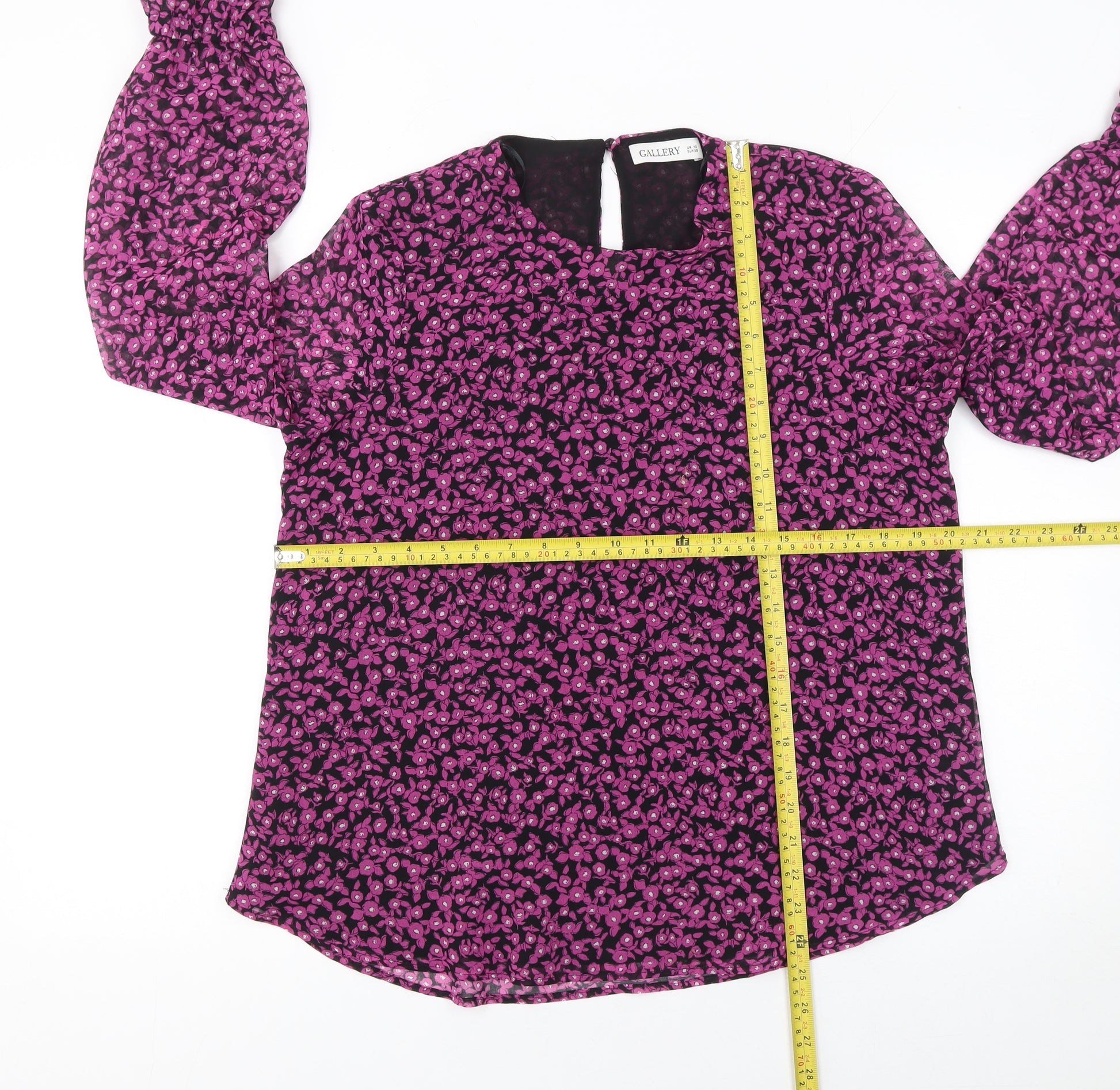 Add a touch of feminine charm to your wardrobe with this beautiful Gallery women’s tunic blouse in a delightful pink floral print. Designed in a flowing chiffon fabric, this elegant top combines lightweight comfort with sophisticated styling. The blouse features long sleeves with soft ruffle cuffs, giving it a graceful silhouette perfect for both work and casual outings. Made from 100% polyester, it offers a sheer and airy texture while maintaining durability and ease of care. The crew neckline gives it a clean, timeless look that can be effortlessly paired with smart trousers or jeans. With its regular fit, the top drapes naturally on the body, enhancing movement and breathability. Lined for comfort and modesty, this floral blouse is ideal for spring and summer wear, allowing a polished yet relaxed appearance. A discreet button closure at the back adds a refined finish. Whether styled for workwear or everyday use, this piece brings a pop of colour and personality to any outfit. Pair it with tailored skirts, slim-fit jeans, or chic accessories to create a versatile and stylish ensemble. Perfect for those who appreciate elegant simplicity with a modern twist, this Gallery blouse blends classic charm with a fresh, contemporary appeal — a must-have addition to your seasonal wardrobe.