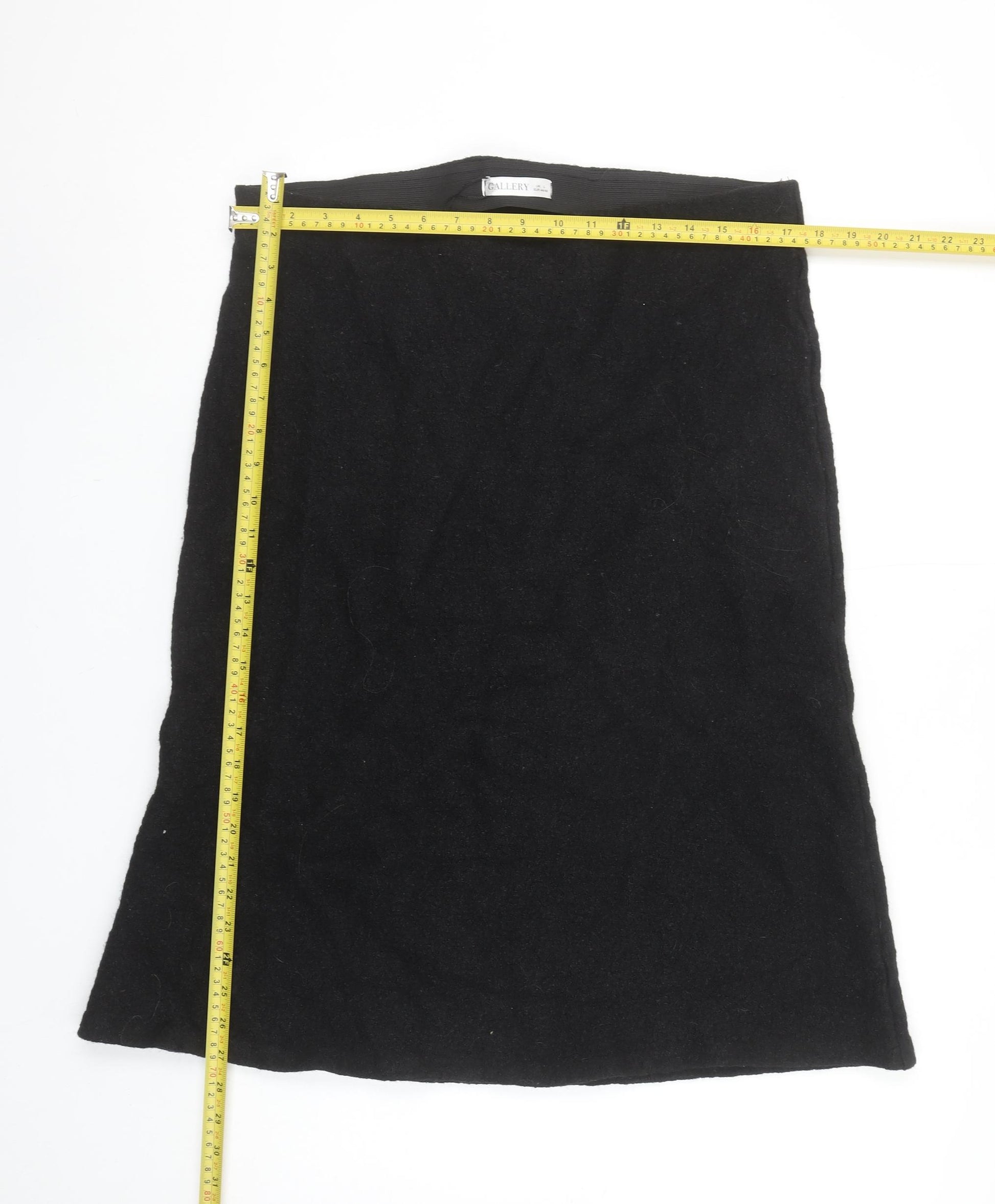 Enhance your classic wardrobe with this versatile black wool skirt from Gallery. Designed for a flattering, tailored silhouette, this knee-length pencil skirt offers timeless sophistication and comfort in equal measure. Crafted from 100% wool, it provides warmth and durability while maintaining a refined and elegant appearance. The fine wool material ensures a smooth drape, making it perfect for pairing with crisp blouses, silk tops, or chunky knits depending on the season. The fully lined design adds comfort and a polished feel, ideal for business meetings, professional settings, or smart-casual outings. This high-quality skirt in size L (UK L / EUR 44/46) sits comfortably at the mid-rise, giving a sleek shape that elongates the figure. Its minimalist design and absence of embellishment highlight its timeless versatility, easily transitioning from office wear to evening sophistication. Perfect for autumn and winter styling, this piece keeps you cosy while retaining a professional and chic look. The black colourway makes it an essential base for endless outfit combinations. Whether you’re styling it with a tailored blazer for workwear or a soft sweater for a relaxed day out, this Gallery skirt will become a dependable favourite in your collection. Combine practicality, style, and comfort with this beautifully made wool skirt – a wardrobe staple that embodies understated elegance. Conditioned in very good shape with minimal lint from previous wear, it has been well maintained and remains ready for many stylish outings. A must-have staple for those who appreciate sophistication and quality finish in classic women’s fashion.