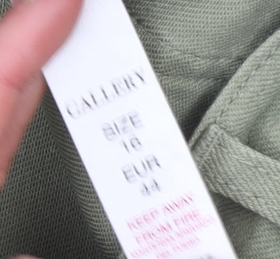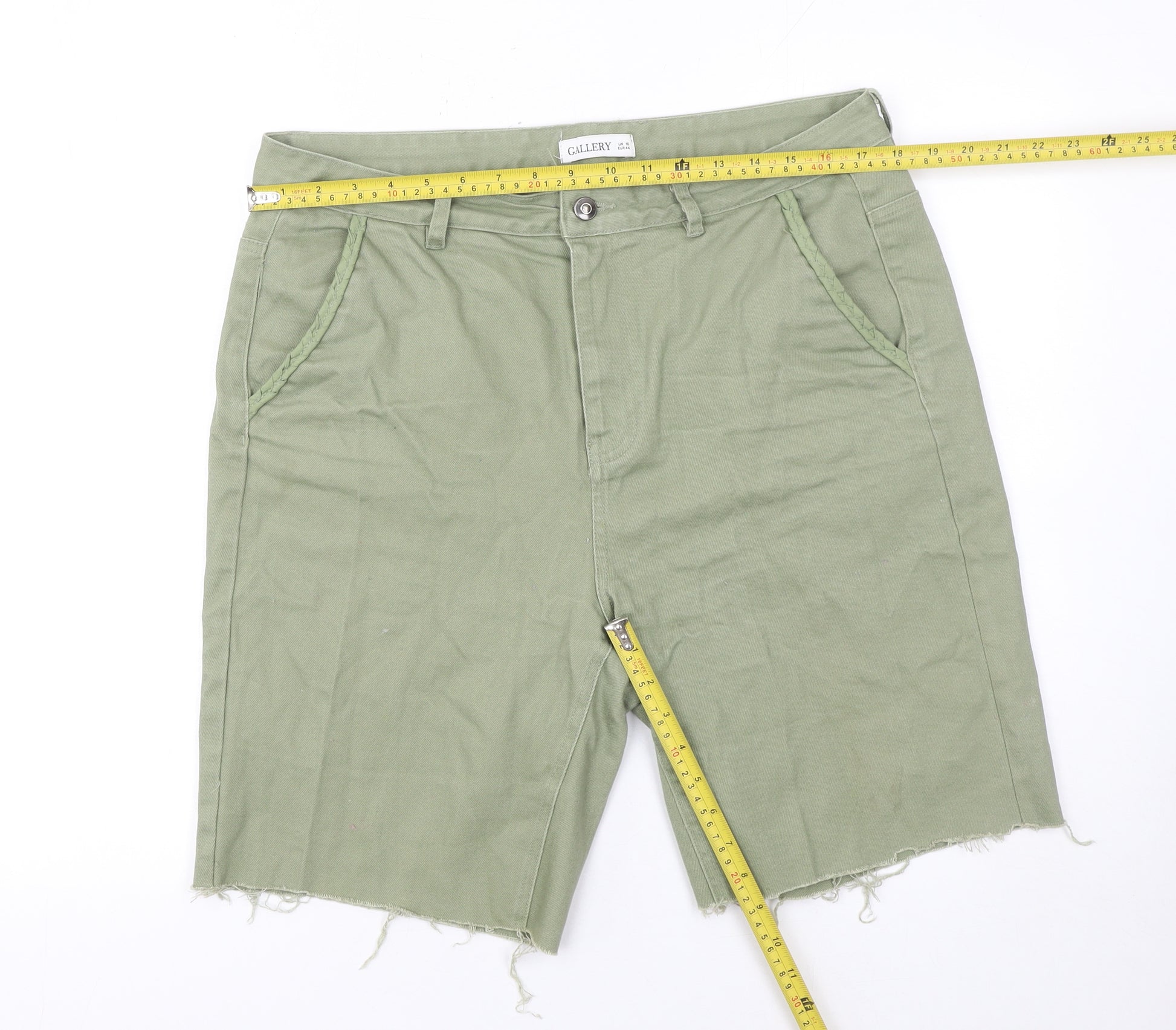 A stylish pair of women’s cut-off shorts from Gallery, these soft green twill shorts offer an effortlessly casual yet refined look. Crafted from 100% cotton, they provide a breathable and lightweight feel that makes them ideal for warm-weather wear. The shorts feature a mid-rise fit with a flat front and a clean silhouette that complements a range of casual outfits. The understated green hue is easy to pair with both neutral and bold colours, giving you flexibility for everyday styling. The design includes practical slash front pockets and back patch pockets that add functionality and structure. Finished with a zip and button fastening, the shorts are durable and neatly tailored around the waistband with belt loops for added versatility. The hem has a trendy frayed, cut-off edge that gives them a relaxed, worn-in feel, perfect for weekend dressing, holidays, or laid-back afternoons. The cotton twill fabric ensures a soft yet sturdy finish that promises long-lasting wear and comfort. These Gallery shorts are designed in a regular fit, flattering the natural shape without clinging too tightly, while providing ease of movement. The green tone makes them a great addition to a spring or summer wardrobe, bringing a subtle pop of colour to any look. Pair them with a crisp white tee and trainers for an easy daytime outfit or dress them up slightly with a tucked-in blouse and sandals for a more polished appearance. In excellent pre-owned condition, showing only light signs of wear and a naturally frayed hem that enhances their casual charm, these shorts are perfectly suited for everyday use. Machine washable for easy care, they offer both practicality and style. Comfortable, versatile, and timeless, these Gallery cotton shorts are a must-have wardrobe piece for any woman looking for effortless chic in warmer weather.