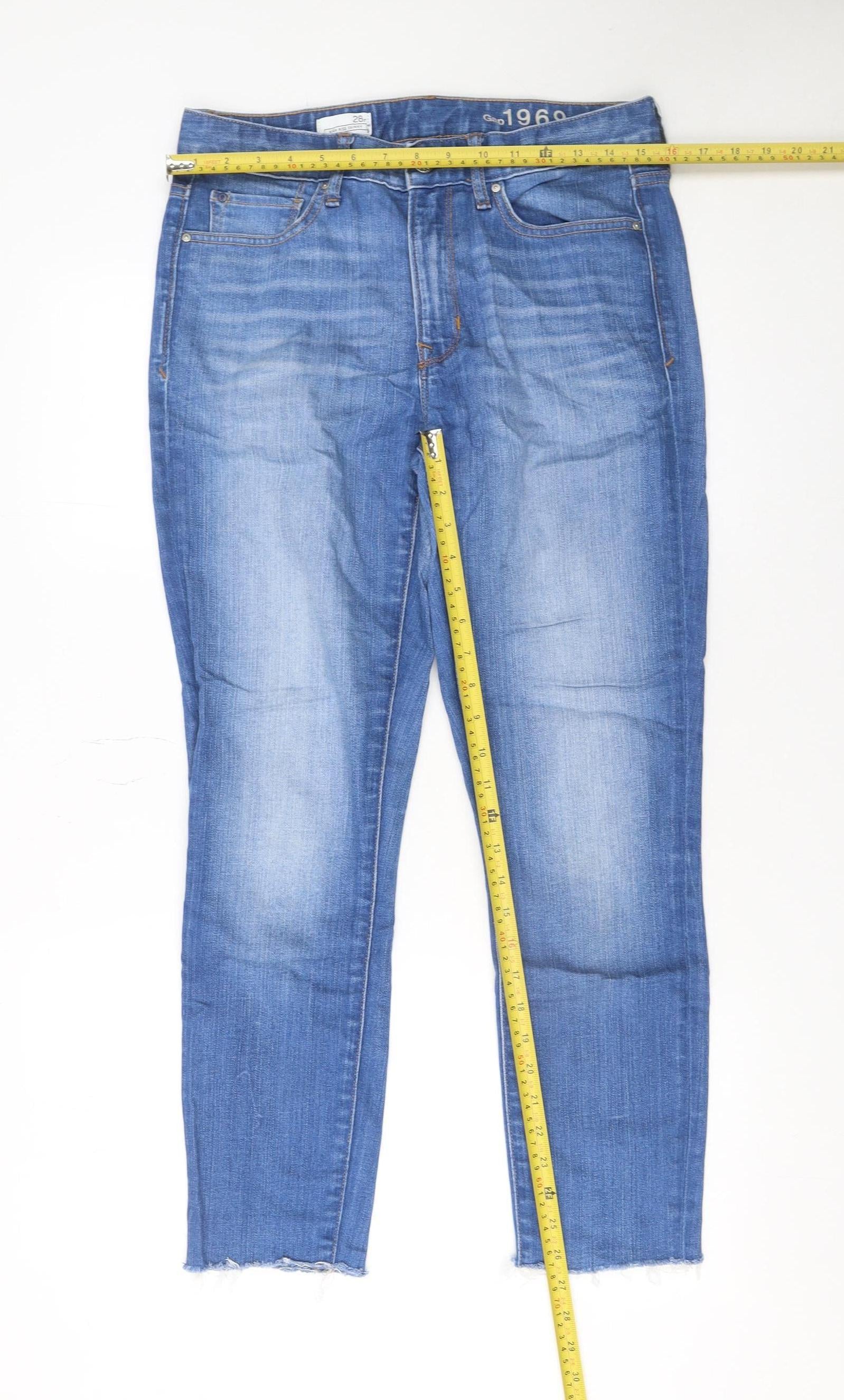 These Gap 1969 women’s blue skinny jeans are the perfect blend of comfort and casual style. Designed in a slim fit with a mid-rise waist, they offer a flattering silhouette that complements everyday outfits. The jeans are crafted from a quality stretch denim blend of cotton, polyester, and elastane, ensuring flexibility and softness that moves with you throughout the day. The medium wash tone gives them a classic and versatile appeal, while subtle whiskering and fading at the front add a lived-in look without compromising sophistication.Featuring the iconic five-pocket design, these jeans provide both functionality and style. The button and zip closure secure the fit, and the durable denim fabric ensures long-lasting wear. The frayed raw hem detail at the ankle makes the jeans trendy and modern, perfect for pairing with ankle boots, trainers, or sandals depending on the season. Whether you’re heading out for casual errands, brunch with friends, or a day at the office, these jeans transition seamlessly from day to evening looks.Made with 86% cotton, 12% polyester, and 2% elastane, they combine the breathability of cotton with the durability of polyester and the comfortable stretch of elastane. The jeans are machine washable for easy care, and their medium denim wash works well with a wide range of tops and jackets. Suitable for all seasons, they’re a wardrobe essential for any woman seeking versatile, relaxed everyday jeans.In excellent condition with only minimal signs of previous use, these jeans offer great quality and timeless Gap craftsmanship at an affordable price. Perfect for women who appreciate classic American design with modern comfort, they represent both practicality and contemporary style in one piece.