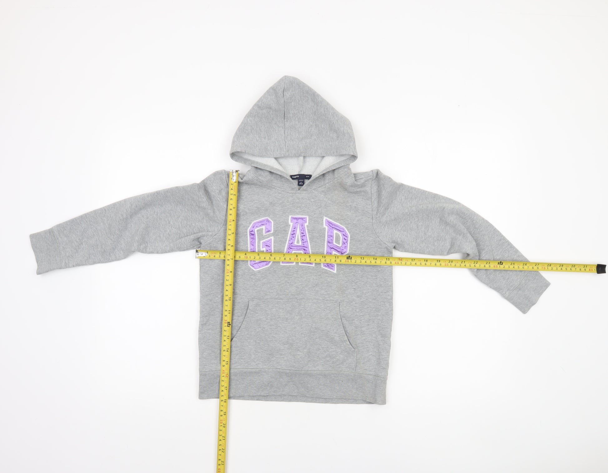 Add a touch of cosy style to your child’s wardrobe with this classic GAP Girls Grey Logo Pullover Hoodie in size 10-11 Years. Designed for everyday comfort, this hoodie features the iconic GAP logo in purple across the chest, giving it a timeless and recognisable look any young fashion fan will love. Crafted from a soft cotton blend (80% cotton, 15% polyester, 5% elastane), the fabric offers breathability, flexibility, and durability for both play and relaxation. Perfect for layering on cool days, the inside fleece lining provides extra warmth and softness against the skin. The regular fit and pullover design make it effortless to wear, while ribbed cuffs and hem add a snug touch, keeping warmth in and ensuring long-lasting shape retention.Ideal for multi-season use, this hoodie transitions easily from autumn to spring and even works as a layering piece during winter outings. The classic grey colour complements nearly any outfit combination, making it a versatile addition to her casual wardrobe. Whether worn with jeans, leggings, or joggers, it’s a go-to piece for school days, weekends, or relaxed family occasions. The hood offers added protection against chilly weather, while the roomy front pocket gives a practical place to keep hands warm or store small items.As a pre-loved piece in excellent condition, it shows minimal signs of wear with no stains or damage. While it no longer includes original retail tags, it has been well cared for and maintained, ready to bring continued comfort and quality style to its next owner. Easy to care for and machine washable, it’s designed for active, everyday living with ease of maintenance in mind. For an affordable and reliable wardrobe essential, this GAP Girls Grey Pullover Hoodie is a perfect choice that offers both comfort and timeless appeal at a great value.