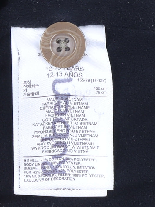 Keep your young one warm and comfortable during the cooler months with this stylish Gap Kids boys' hooded puffer jacket. Designed in a versatile green tone, it offers both practicality and timeless appeal. The mid-length cut provides excellent coverage, while the quilted design ensures enhanced warmth without being bulky. Made from a durable blend of 70% cotton and 30% polyester, the jacket is built for everyday wear with a soft, woven texture that withstands outdoor activities. It's fully lined with polyester fleece for added insulation, perfect for autumn and winter seasons. Featuring a zip and button closure for a secure fit, two large front pockets for storage, and additional chest pockets for convenience, this jacket blends functionality with style. The hood is ideal for keeping out cold winds, and the full-length sleeves ensure comfortable layering. The jacket's regular fit allows easy movement, making it great for school commutes, weekend adventures, or walks outdoors. Gap’s attention to quality is reflected in the stitching and reliable design, offering dependable warmth in chilly British weather. Although pre-owned, this jacket remains in good condition with only light signs of wear and minor surface marks that do not affect its performance or comfort. Perfect for parents seeking value and durability, this puffer coat is easy to care for as it’s machine washable. A practical and classic piece from Gap Kids’ winter collection, it’s a wardrobe must-have for boys aged 12–13 years looking for warmth, comfort, and everyday style.