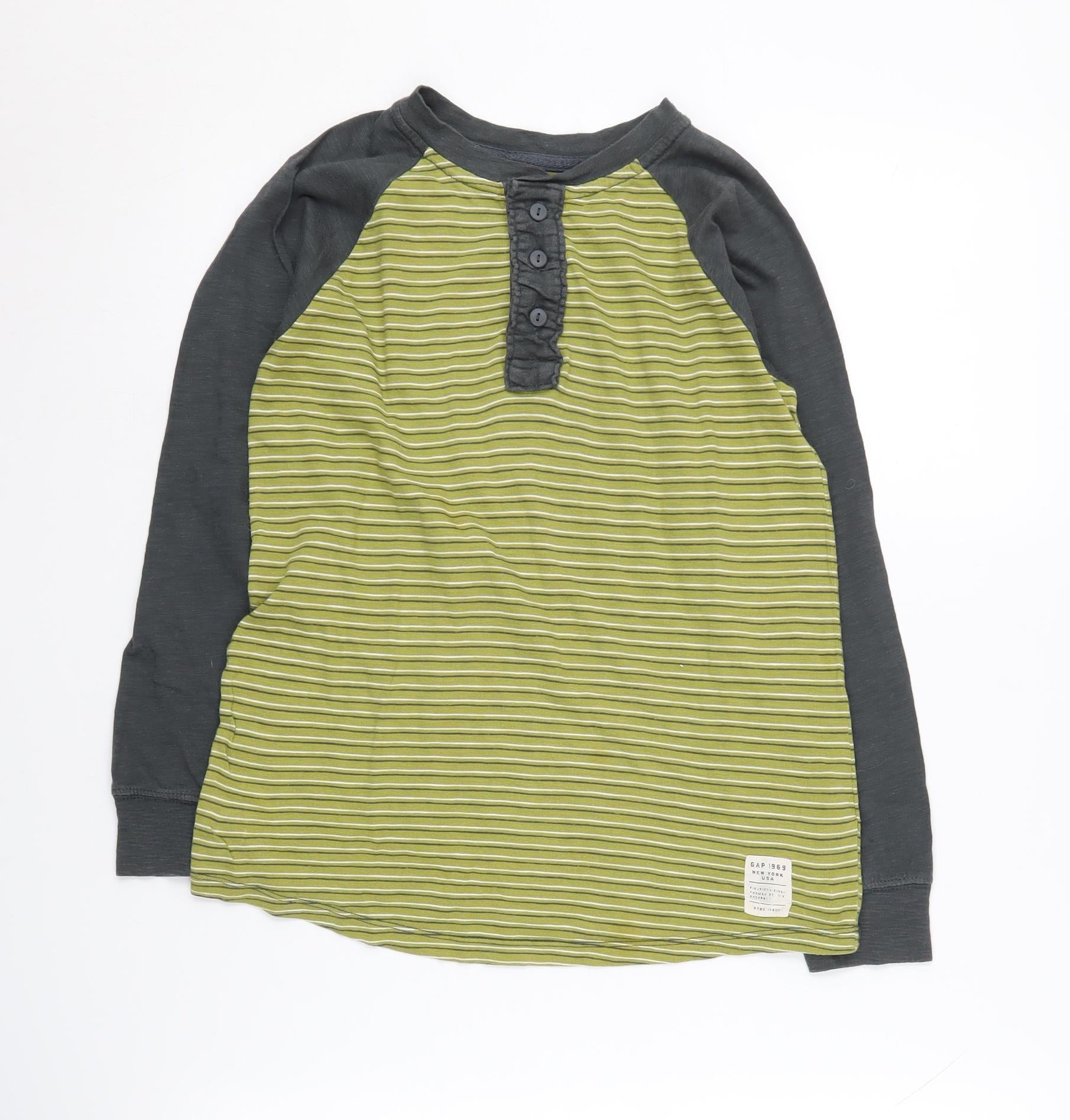 Explore casual comfort with this Gap Kids boys' T-shirt, designed to add a touch of style to everyday wear. Crafted from 100% cotton, this long sleeve Henley tee offers breathability and a soft touch, ideal for active youngsters. The striking green striped pattern adds a splash of colour to any wardrobe, sure to make your child stand out. Featuring a regular fit, it ensures both comfort and freedom of movement, making it perfect for casual outings and playdates alike.The Henley neckline, accented with buttons, brings a classic touch, while the long sleeves provide warmth during cooler days. Whether layered under a jacket or worn on its own, this versatile T-shirt is ideal for all seasons. Machine washable for easy care, it's a practical choice for busy families. Made in India with careful craftsmanship, it promises quality and durability.This T-shirt caters to young fashion enthusiasts aged 8-9 years, offering a stylish yet simple addition to their clothing collection. Ensure your child steps out in confidence and comfort with this charming Gap Kids tee, where traditional design meets modern appeal.
