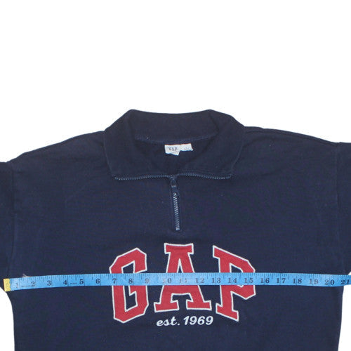 This authentic GAP men's blue sweatshirt captures the effortless casual style the brand is loved for. Crafted from a soft cotton and polyester blend fleece, this half zip pullover is lightweight yet warm, making it perfect for layering across seasons. The striking red and white embroidered GAP logo across the chest, with the iconic 'est. 1969' text beneath, pays homage to the label's heritage and adds a bold collegiate flair. The half zip neckline with a high collar offers comfort and adjustability, while the ribbed cuffs and hem ensure a secure, relaxed fit that keeps its shape wear after wear.Ideal for everyday wear, it’s a versatile piece for casual outings, gym warm-ups, or laid-back weekends. The breathable, soft-touch fleece ensures comfort whether worn over a T-shirt or under a jacket, making it suitable for autumn, winter and even cool spring days. Its classic fit flatters without being too tight or oversized, offering a timeless silhouette.This sweatshirt has been carefully inspected and remains in excellent pre-owned condition with only minimal signs of gentle wear and no visible flaws. Perfect for those who value comfort and easy style, it’s an essential addition to any wardrobe. Machine washable for simple care, this iconic GAP pullover pairs effortlessly with jeans, joggers, or casual trousers for a laid-back look.Whether you’re after a cosy mid-layer or a standalone statement piece, this navy blue GAP half zip sweatshirt delivers dependable quality and classic American style at an unbeatable value. Don’t miss out on adding this versatile, comfortable, and stylish piece to your collection today.