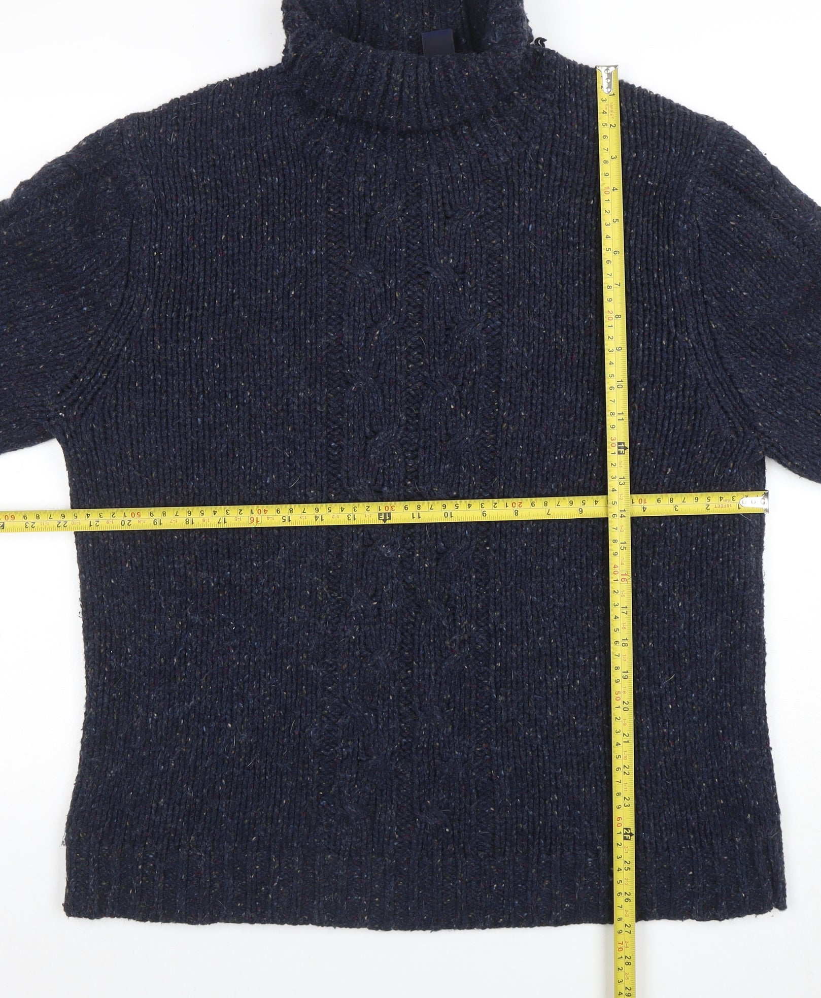 Step into timeless winter style with this GAP Men’s Blue Cable-Knit Roll Neck Jumper in size XL. Crafted from a premium wool blend of 55% cotton, 18% acrylic, 15% wool, and 12% nylon, this pullover offers both warmth and softness for cooler months. The traditional cable-knit texture enhances its classic appeal, while the roll neck provides extra comfort and protection from the chill. Its deep navy blue tone makes it highly versatile, pairing effortlessly with jeans for a casual outing or smart trousers for a refined, layered look.The jumper features long sleeves and ribbed cuffs and hem for a snug fit that retains shape. Designed in a heavyweight knit, it ensures excellent insulation, making it perfect for autumn and winter wear. The mix of materials brings both breathability and durability, offering long-lasting comfort and dependable style throughout the seasons. GAP’s signature quality craftsmanship is evident in every stitch, giving this jumper a reliable, well-made feel that fits naturally into any smart-casual wardrobe.In excellent pre-owned condition, the garment shows minimal signs of wear with no visible damage or stains, reflecting careful previous use and good upkeep. Ideal for relaxed weekend wear, office layering, or evening gatherings, this jumper stands out as a staple piece for the modern man who appreciates both function and fashion.Whether you’re dressing for a country walk, city weekend, or a cozy night in, this GAP Blue Cable-Knit Roll Neck Jumper will keep you stylishly warm. Its versatile design ensures it complements a range of outfits, making it a must-have knit for every discerning gentleman’s cold-weather wardrobe.