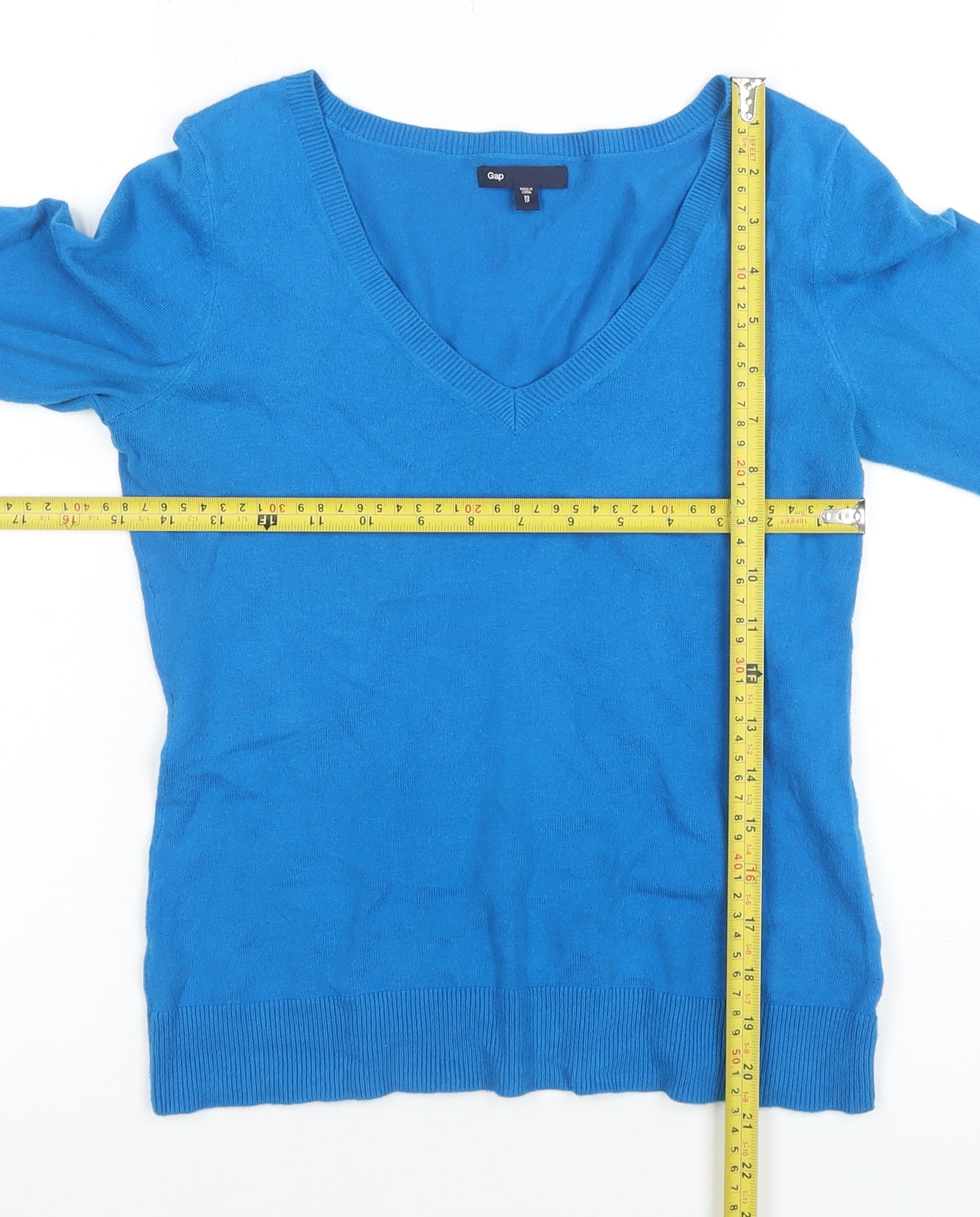 Add a pop of vibrant colour to your wardrobe with this Gap Women’s Blue V-Neck Top in size XS. Crafted from a soft and breathable cotton blend with a touch of elastane, this lightweight jersey fabric ensures both comfort and stretch for a flattering and easy fit. Designed in a simple, versatile style, this long sleeve top is ideal for layering or wearing on its own for a relaxed yet polished appearance. The pullover design with a softly ribbed V-neckline and hem adds a clean, classic finish suitable for everyday wear. Its solid blue colour complements a range of styles, pairing effortlessly with jeans, skirts, or tailored trousers. Perfect for casual outings, work-from-home ensembles, or relaxed weekends, this top offers timeless appeal and high-quality construction typical of the Gap brand. The fine knit jersey provides a smooth texture that feels gentle on the skin, while its midweight design makes it ideal for wearing through spring and autumn seasons. Despite light signs of gentle wear, this garment remains in excellent condition with no visible defects, ensuring continued style and comfort. A modern classic that fits effortlessly into any capsule wardrobe, this Gap top brings both simplicity and sophistication to your daily look. Machine washable for easy care, it lets you look fresh and feel confident all day long. Whether worn under a blazer for a polished smart-casual style or paired with relaxed denim for a laid-back look, this top offers flexibility and charm. Give your collection the boost it needs with this beautifully crafted Gap piece that perfectly balances practicality and effortless fashion.