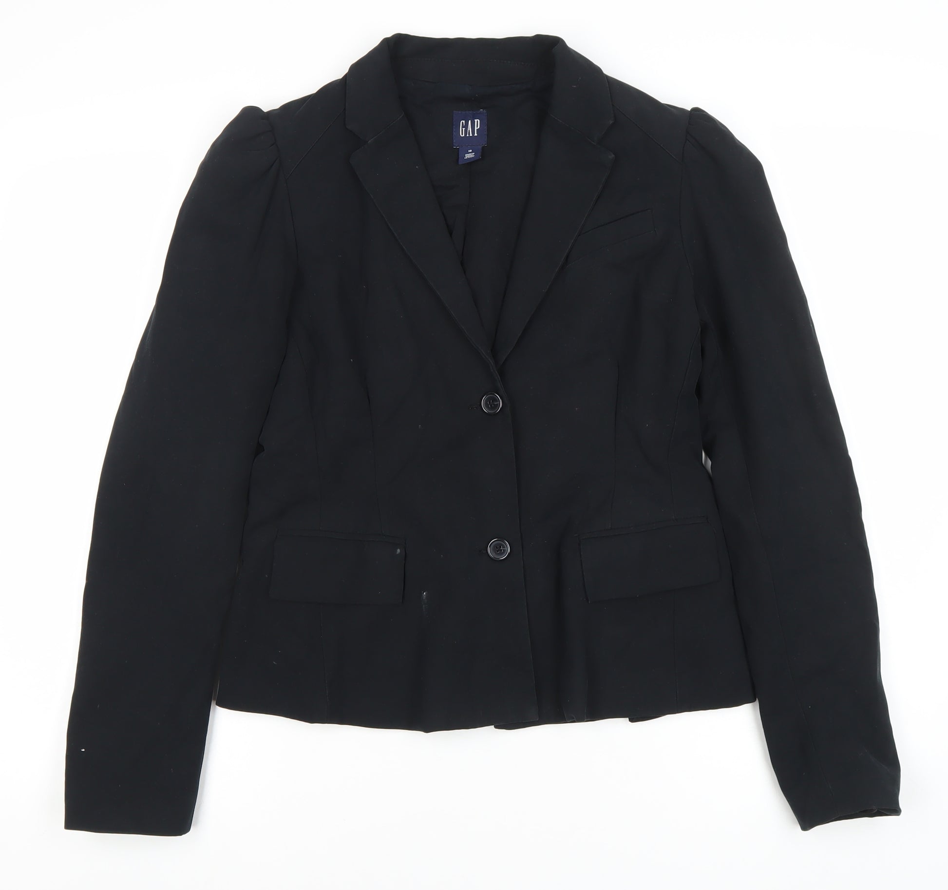 Elevate your wardrobe with this classic GAP Women's Blazer in a versatile black shade. Crafted for the modern woman, this stylish blazer is an absolute essential for any sophisticated ensemble. Made from a comfortable blend of cotton and elastane, the fabric allows for easy movement while maintaining its sleek contouring. The two-button fastening at the front and notch lapel style add a touch of elegance, making it suitable for both formal and casual settings. Designed as part of GAP's regular fit line, this single-breasted blazer showcases a timeless structure with long sleeves and a regular jacket length. Perfect for layering over blouses or knit tops, it brings a polished finish to any outfit. Whether accompanying you to a business meeting or a casual day out, this piece pairs effortlessly with trousers or skirts. In an excellent condition with minimal signs of wear, it promises to be a reliable and stylish component in your clothing collection. Enhance your fashion game with this classic GAP blazer - a must-have for every fashion-forward woman aiming for simplicity and elegance.
