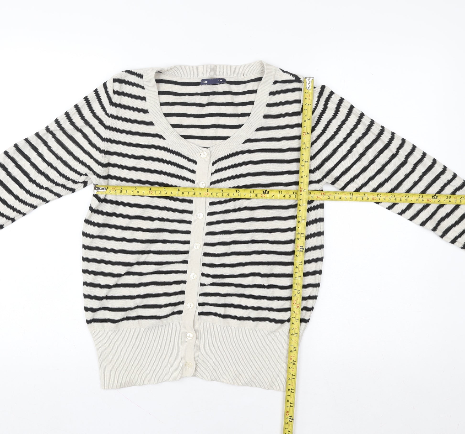 Update your everyday wardrobe with this beautifully classic Gap women's cardigan. Crafted from 100% cotton, the soft knit construction ensures both comfort and versatility for all seasons. The cardigan features a timeless black and white striped pattern that gives it a nautical yet sophisticated touch, perfect for layering over tank tops, blouses, or dresses. With a flattering scoop neckline and full button-down front, it’s ideal for relaxed casual settings or smart-casual offices alike. The long sleeves and ribbed hem and cuffs provide a secure, comfortable fit, while its lightweight, breathable cotton fabric makes it suitable for spring and autumn wear. Designed in a Regular fit and Medium size, it flatters the body comfortably without feeling too tight or loose. Effortlessly versatile, this cardigan pairs beautifully with jeans for a chic off-duty look or can be dressed up with a skirt and heels for a polished finish. The fine tight-knit texture ensures a soft touch and durability, maintaining both quality and style wear after wear. In excellent pre-loved condition with minimal signs of wear and no visible damage, it’s a piece that embodies Gap’s reputation for timeless, easy-to-style fashion. Perfect for daily wear, travel, or a casual office setting, this black stripe Gap cardigan is a must-have staple that brings comfort and effortless style to any wardrobe. Don’t miss out on adding a reliable, chic, and breathable layering piece that complements virtually any outfit combination.