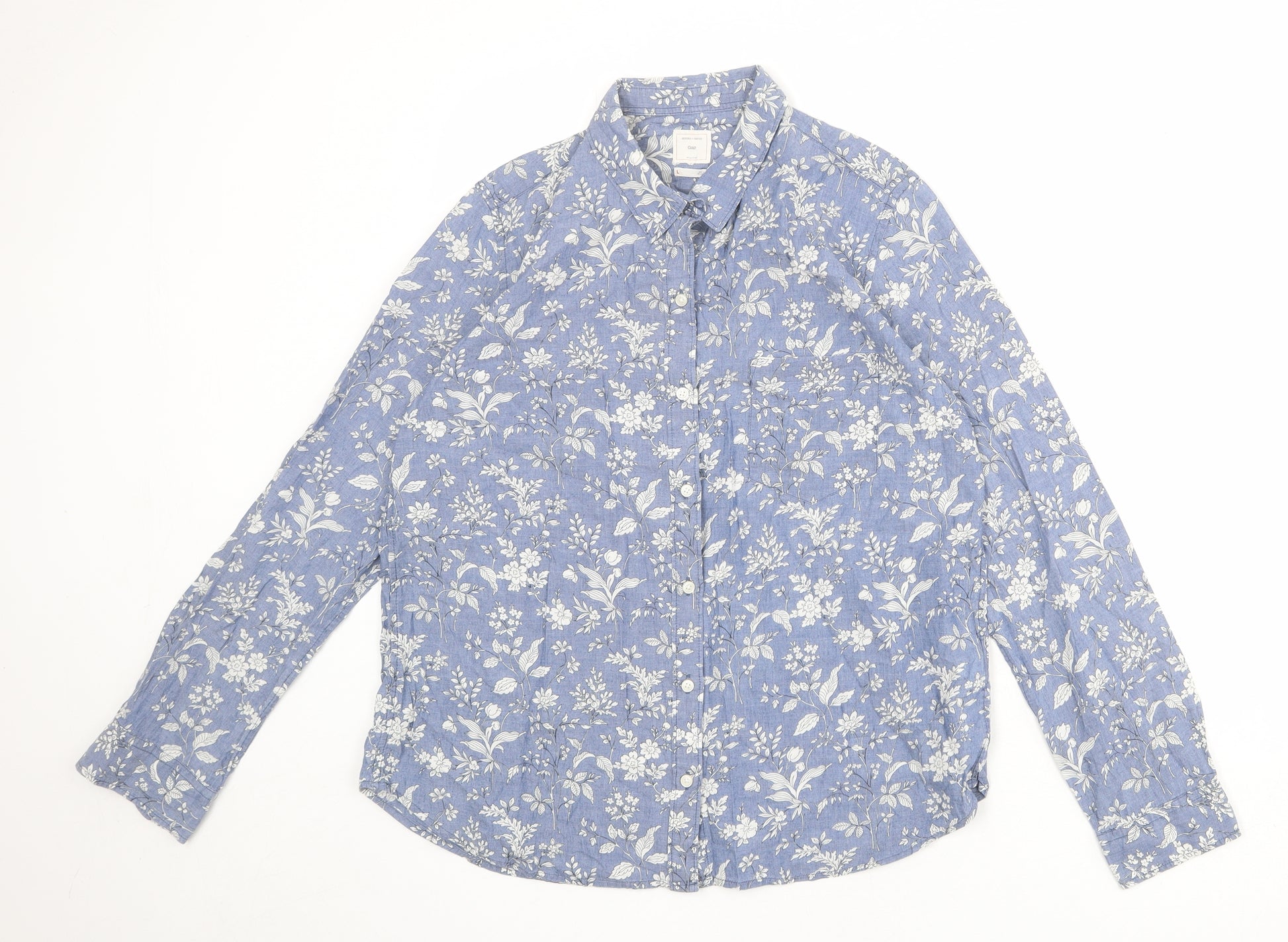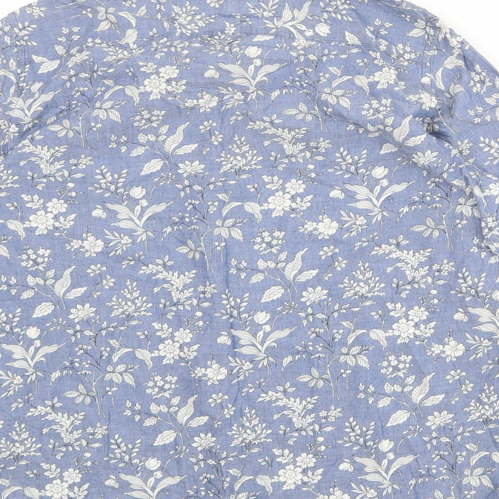 Womens Blue Floral 100% Cotton Basic Button-Up Size L Collared