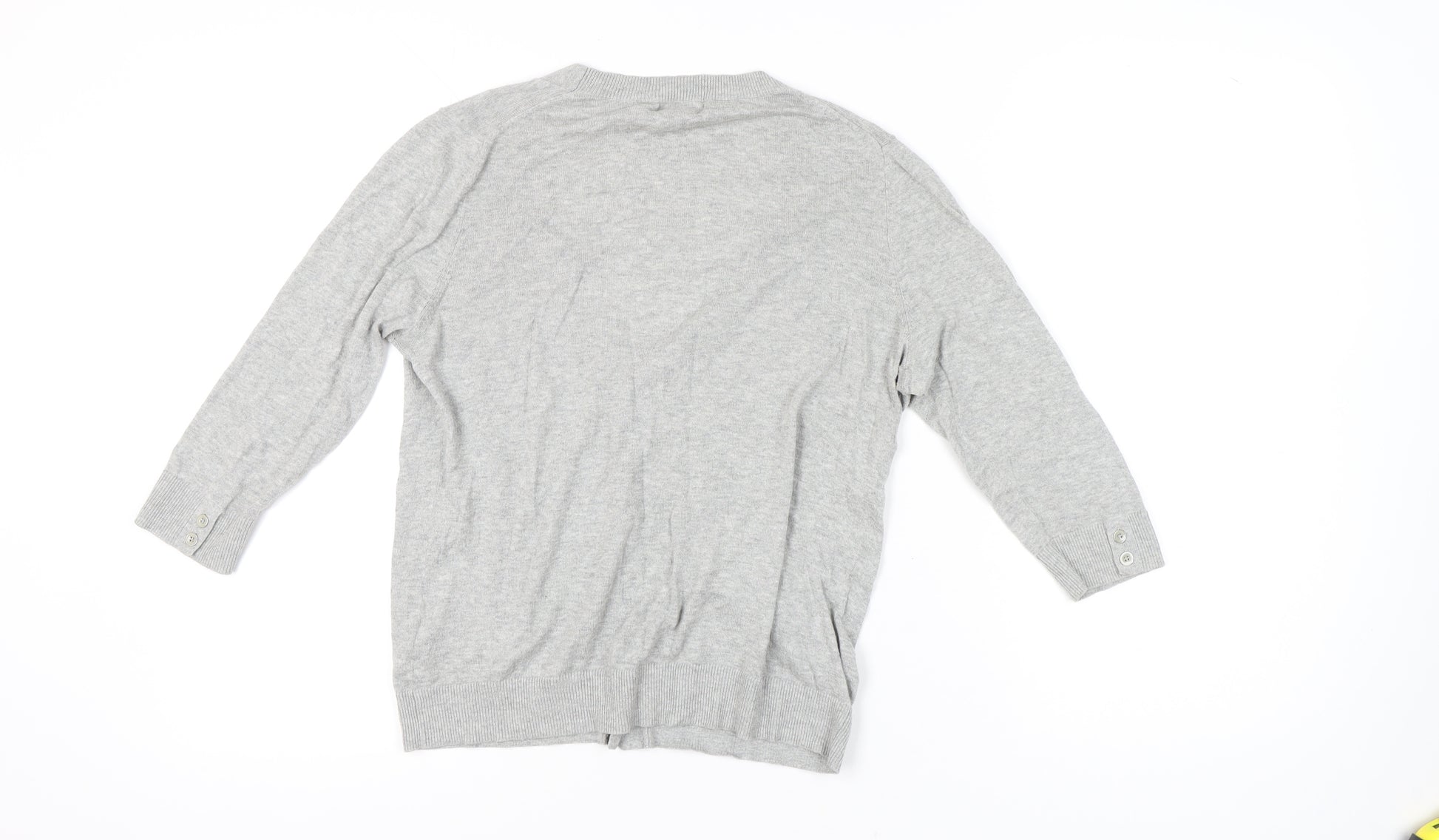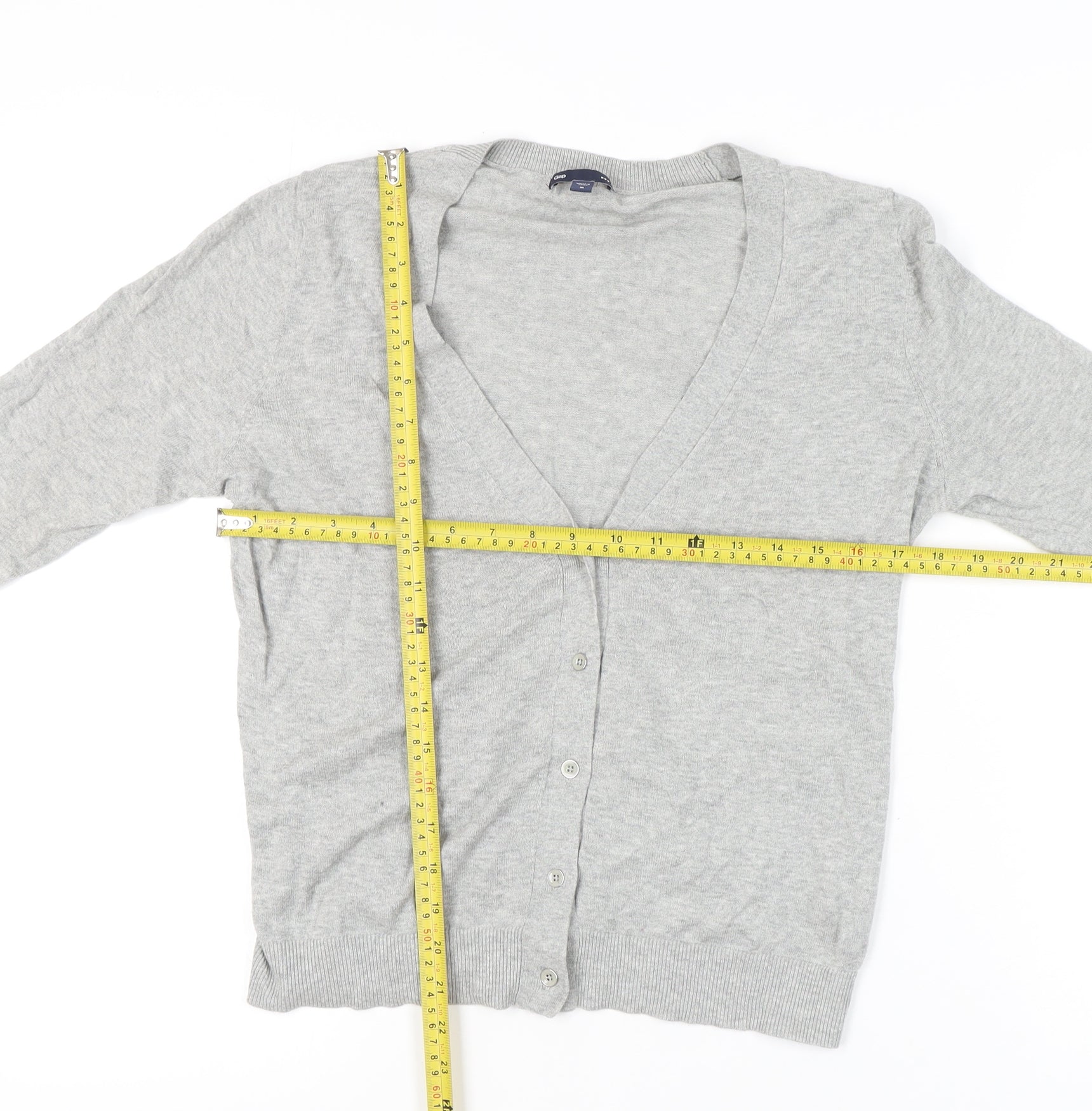 Experience timeless casual style with this Gap Women's Grey Cardigan. Crafted from 100% cotton, this knit cardigan provides a soft and comfortable feel, ideal for year-round wear. The V-neck design and button accents add a touch of classic sophistication, making it a versatile addition to any wardrobe. Its regular fit and long sleeves offer a relaxed feel, perfect for dressing up or down. Suitable for various occasions, from casual get-togethers to office wear, this cardigan pairs effortlessly with both jeans and skirts. Machine washable for easy care, it ensures a practical option for everyday fashion. Make this staple piece a go-to in your collection for both comfort and style.