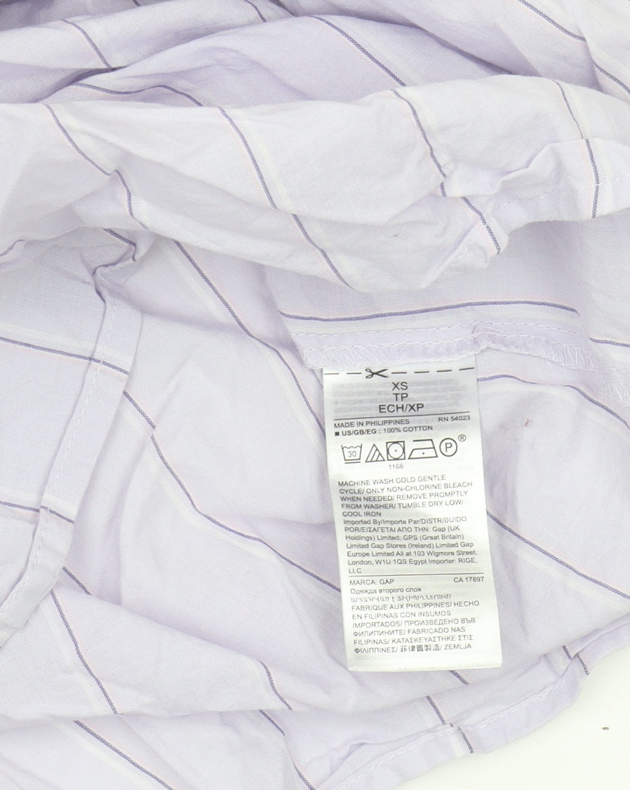 Add a touch of elegance to your wardrobe with this GAP women's purple striped blouse, a versatile piece perfect for casual wear. Crafted from 100% cotton, this blouse offers breathable comfort while showcasing a classic collared neckline and long sleeves. Its button accents and tailored fit add a sophisticated element, making it suitable for various occasions. The subtle purple hue with vertical stripes provides a timeless appeal, ideal for pairing with jeans or a skirt. Despite its excellent condition, minor wrinkles are present, reflecting its pre-loved nature. Priced at £10.25, this machine washable blouse is a must-have addition to any fashion enthusiast's collection.