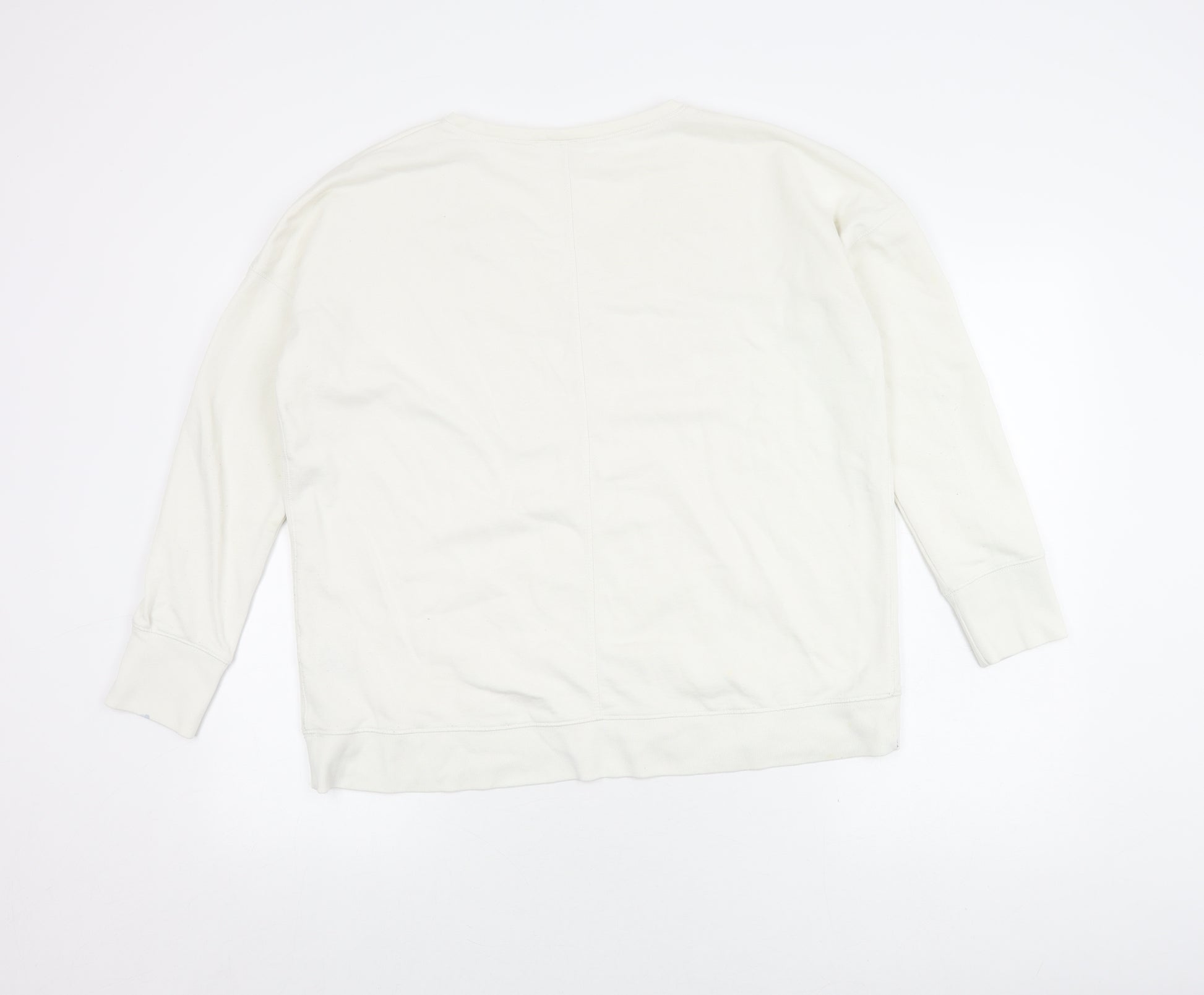 Elevate your casual wardrobe with this classic Gap Women's White V-Neck Pullover Jumper. Designed for comfort and style, this relaxed fit jumper is perfect for all seasons. Made from a soft blend of 60% cotton and 40% polyester, it ensures both durability and a lightweight feel. The crisp white colour complements any outfit, making it a versatile addition to your collection. Featuring a flattering V-neckline and long sleeves, this jumper is perfect for layering or wearing solo. Machine washable for easy care, it's ideal for everyday wear. Whether you're heading out for a casual lunch or just relaxing at home, this jumper offers both comfort and effortless style. Slight marks on the fabric add a touch of character, making each piece unique. Step into style and comfort with Gap's timeless design. Available in size M, it's an essential piece that seamlessly blends into any wardrobe. Don't miss the chance to own this wardrobe staple at a great price.