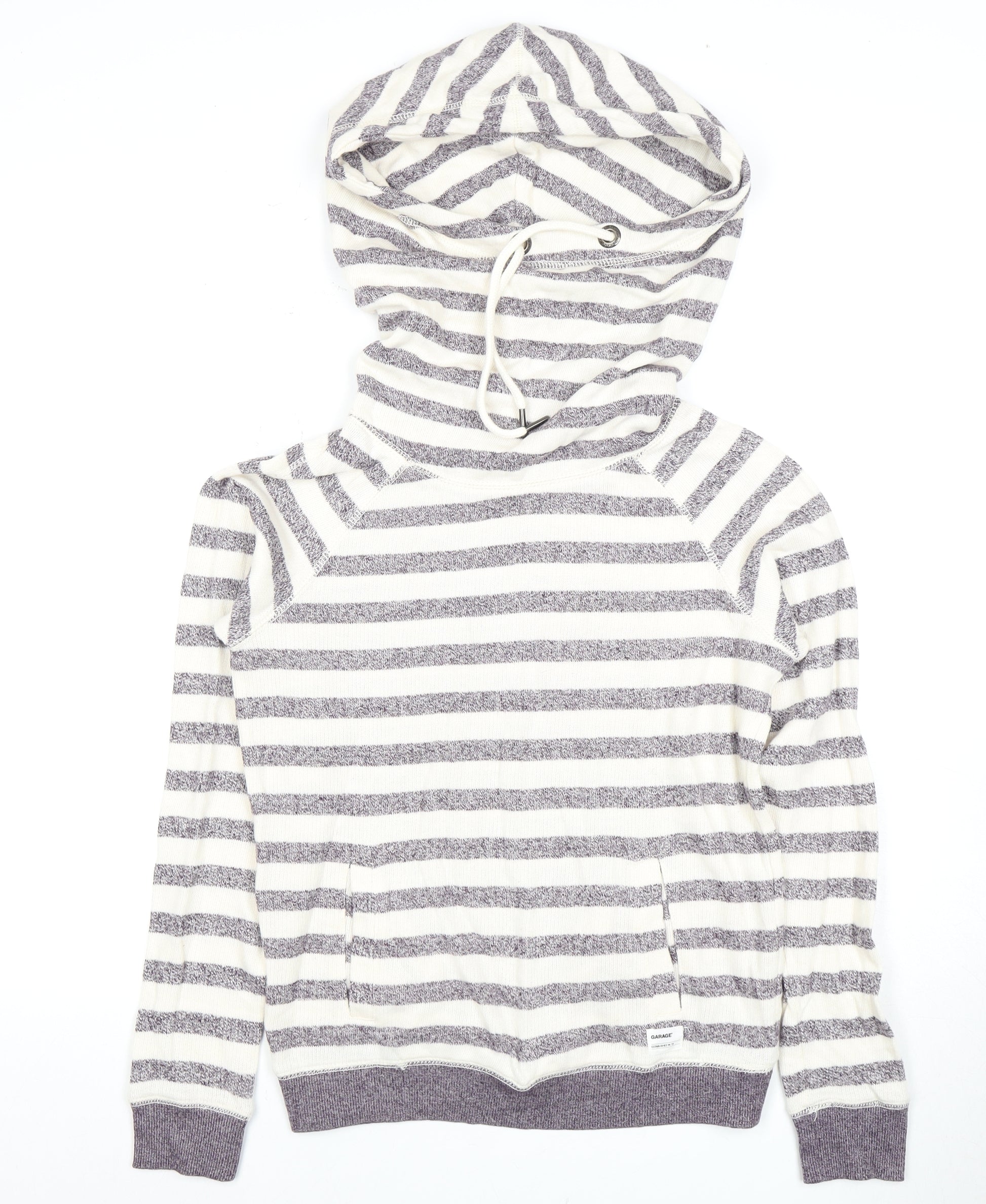 Dive into cosy style with this women's Garage pullover hoodie, designed in a classic stripe pattern. Crafted with comfort in mind, it boasts a relaxed fit perfect for casual outings or lounging at home. Made from a soft cotton and polyester knit blend, this hoodie offers both warmth and breathability. Equipped with a convenient drawstring hood and front pockets, it's a functional piece for any wardrobe. The long sleeves feature raglan styling for added mobility, making it ideal for all your everyday activities. Pair this grey hoodie with jeans or joggers for a laid-back look that never goes out of style.