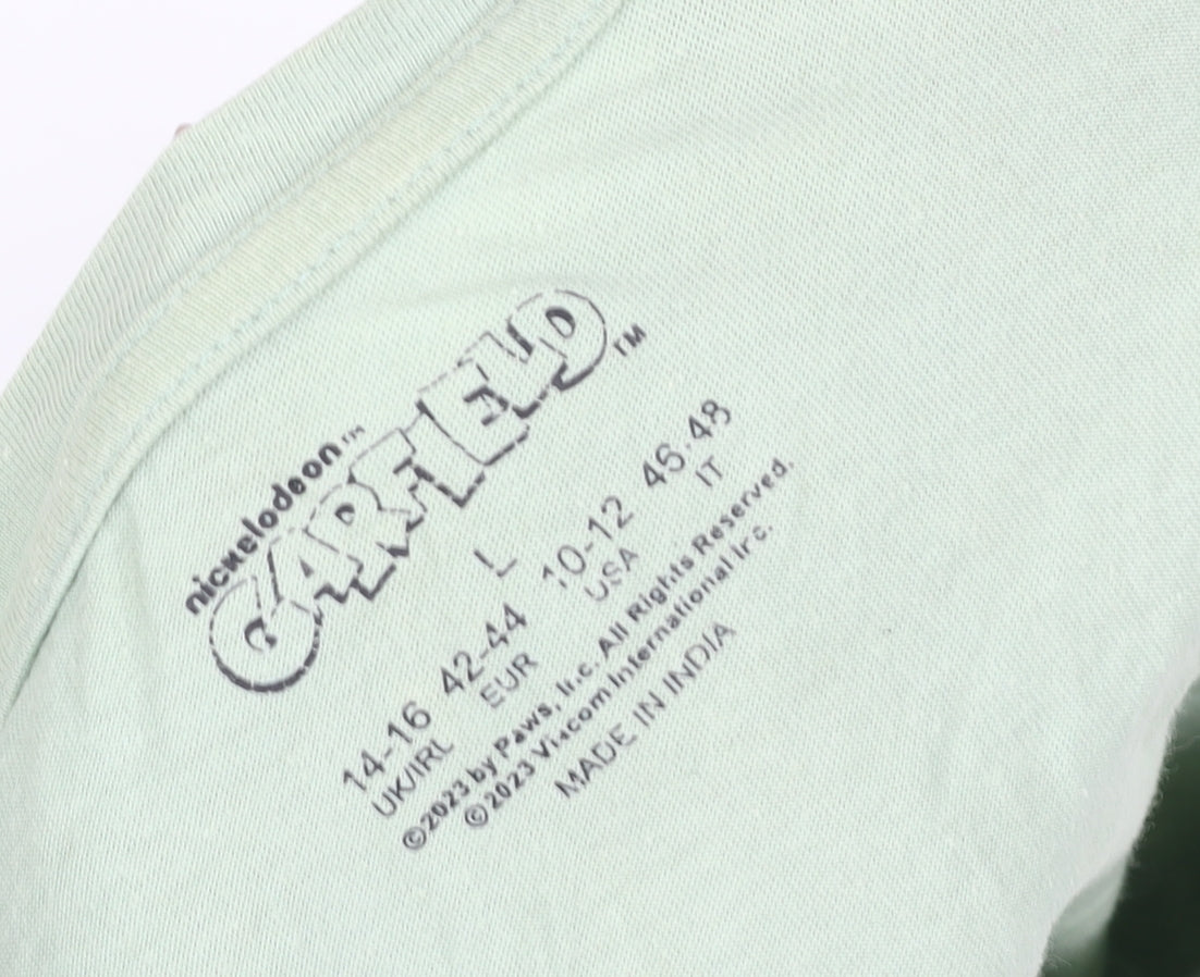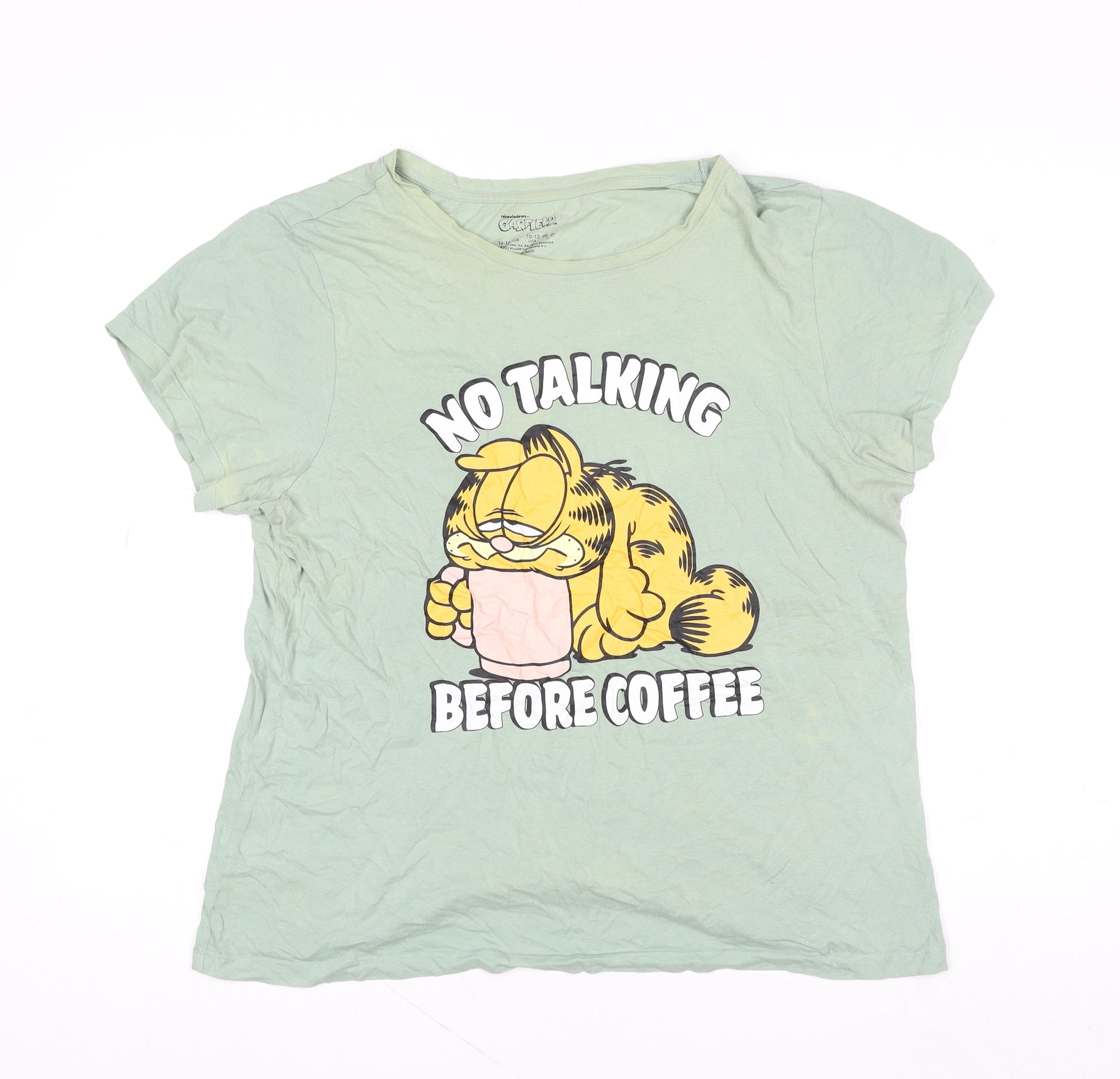 Enjoy lounging or sleeping in comfort and classic humour with this fun Garfield women's nightshirt. Made from 100% cotton jersey, it offers a soft, breathable, and lightweight feel ideal for warmer evenings. The cheerful green colour complements the famous cartoon cat, Garfield, pictured enjoying his morning coffee above the bold slogan 'No Talking Before Coffee', adding playfulness and nostalgia to your nightwear collection. This T-shirt style nightshirt provides a relaxed fit with short sleeves and a crew neckline, allowing freedom of movement and all-night comfort. The high-quality print has held its vibrancy well, showing only minimal signs of wear, making it a perfect pre-loved find for anyone who appreciates cosy, character-themed loungewear. Machine washable and easy to care for, this nightshirt keeps things simple while maintaining lasting softness, making it a practical choice for daily wear. Whether you’re settling in for a movie night, sipping coffee on a lazy morning, or gifting a Garfield fan, this piece is sure to bring a smile. With its humorous design and lightweight cotton fabric, it blends comfort, nostalgia, and light-hearted fun for effortless bedtime style. Available in women's size L (UK 14–16), it offers a relaxed and flattering fit that suits most body shapes. Perfect for spring and summer lounging, this nightshirt is a playful yet comfortable addition to your nightwear rotation.