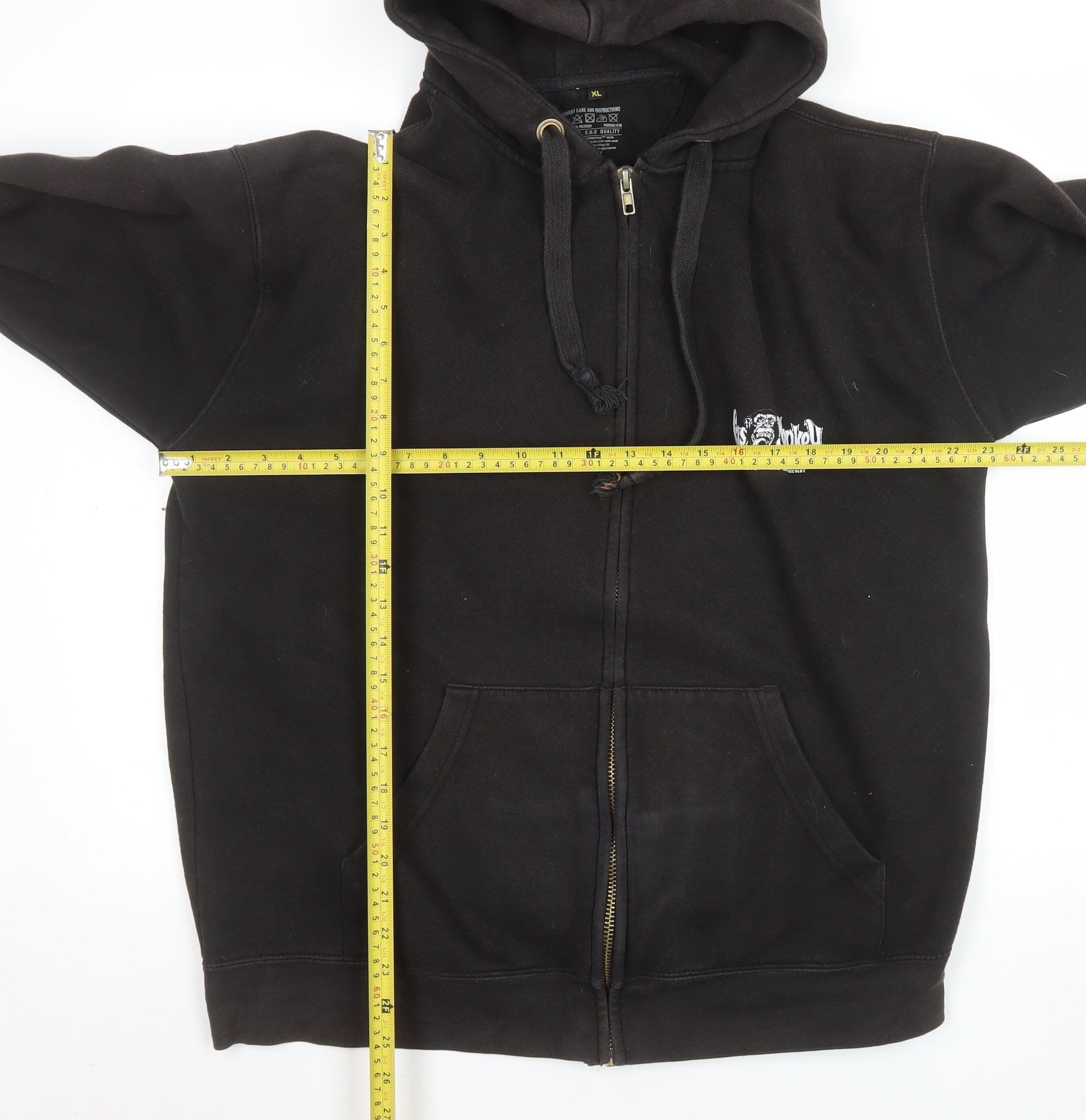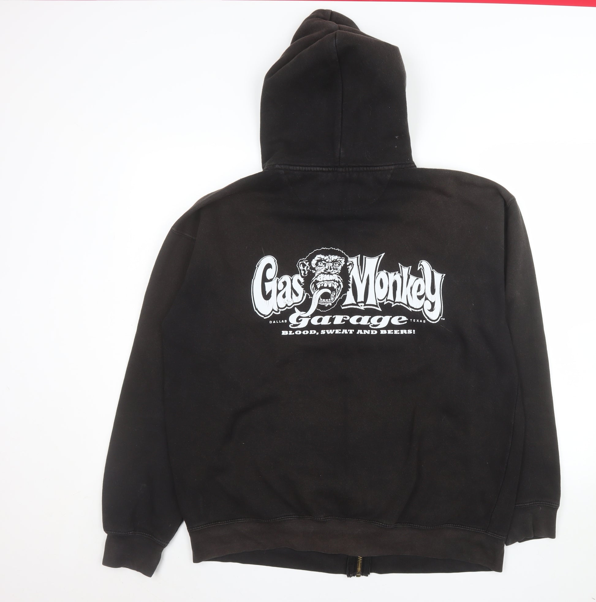 Show off your passion for automotive culture with this Gas Monkey Garage men's hooded full zip jacket. Crafted from a soft and durable cotton-polyester blend, this mid-weight layer offers comfort and style in equal measure. The deep black colour provides a bold, versatile foundation that pairs well with casual looks, while the striking Gas Monkey Garage logos on the front and back showcase unmistakable personality. Designed with practicality in mind, the jacket features a sturdy zip closure, drawstring-adjustable hood, and spacious kangaroo pockets to keep your hands warm or essentials handy. The inner lining is soft for all-day comfort, making it ideal for cooler spring, autumn, and winter days. Cut in a regular fit with ribbed cuffs and hem for a secure feel, it sits neatly at mid-length and layers easily over tees and shirts alike. Perfect for casual wear, weekend outings, or any relaxed setting, this piece combines streetwear attitude with everyday functionality. Its rugged yet comfortable design means it’s equally suited for car enthusiasts, bikers, and anyone with a love for classic garage style. Machine washable for easy care, it’s built to last and look great wear after wear. Light signs of wear reflect its well-kept used condition, ensuring excellent value while maintaining standout style. Step into effortless cool with this Gas Monkey Garage XL zipped hoodie – a great addition to any laid-back wardrobe that celebrates craftsmanship and automotive spirit.