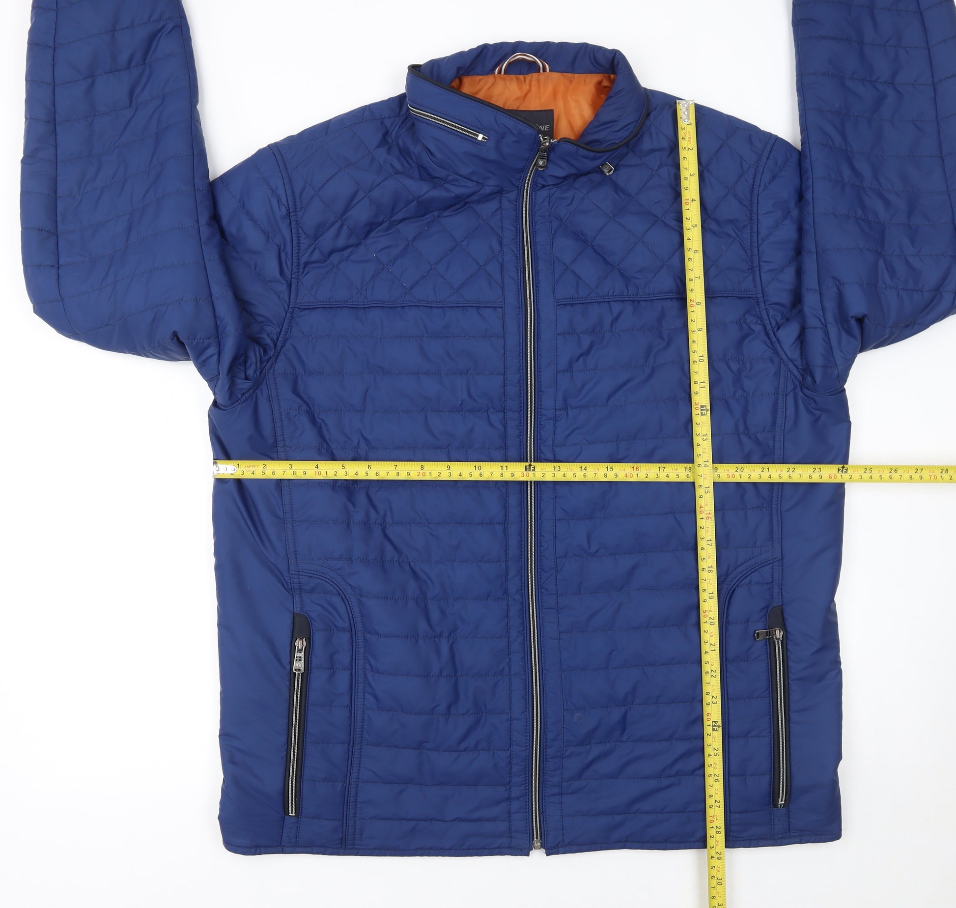 Step out in style and comfort with this Gate One men's blue quilted jacket, designed to offer both warmth and elegance throughout cooler seasons. Crafted from durable 100% polyester, this mid-length jacket provides a lightweight yet insulated layer, ideal for transitional weather. The quilted stitching detail not only enhances its visual appeal but also improves insulation, ensuring a warm and comfortable fit whether you're commuting, travelling, or enjoying the outdoors. The jacket’s full zip fastening gives convenience and flexibility, allowing you to adapt easily to changing temperatures. It features zipped side pockets for secure storage of your essentials, along with a sleek stand-up collar for a modern finish. Both the outer shell and the internal lining are made from polyester, ensuring durability and easy garment care — simply machine washable for everyday practicality. The vivid blue colour and minimalist design make it versatile enough to pair with jeans, chinos, or smart casual trousers, creating a timeless look suited to a range of occasions from casual outings to travel wear. With a regular fit and softshell structure, it ensures ease of movement and comfort without compromising on shape or quality. Perfect for spring, autumn, and winter, this jacket bridges the gap between casual comfort and smart utility. The Gate One logo accent on the arm adds a subtle brand touch without overwhelming the clean design. In excellent pre-owned condition with light signs of gentle wear, this jacket retains its premium look and feel. Ideal for men seeking a functional yet stylish outerwear piece, this blue quilted jacket represents exceptional value and understated refinement for everyday use.