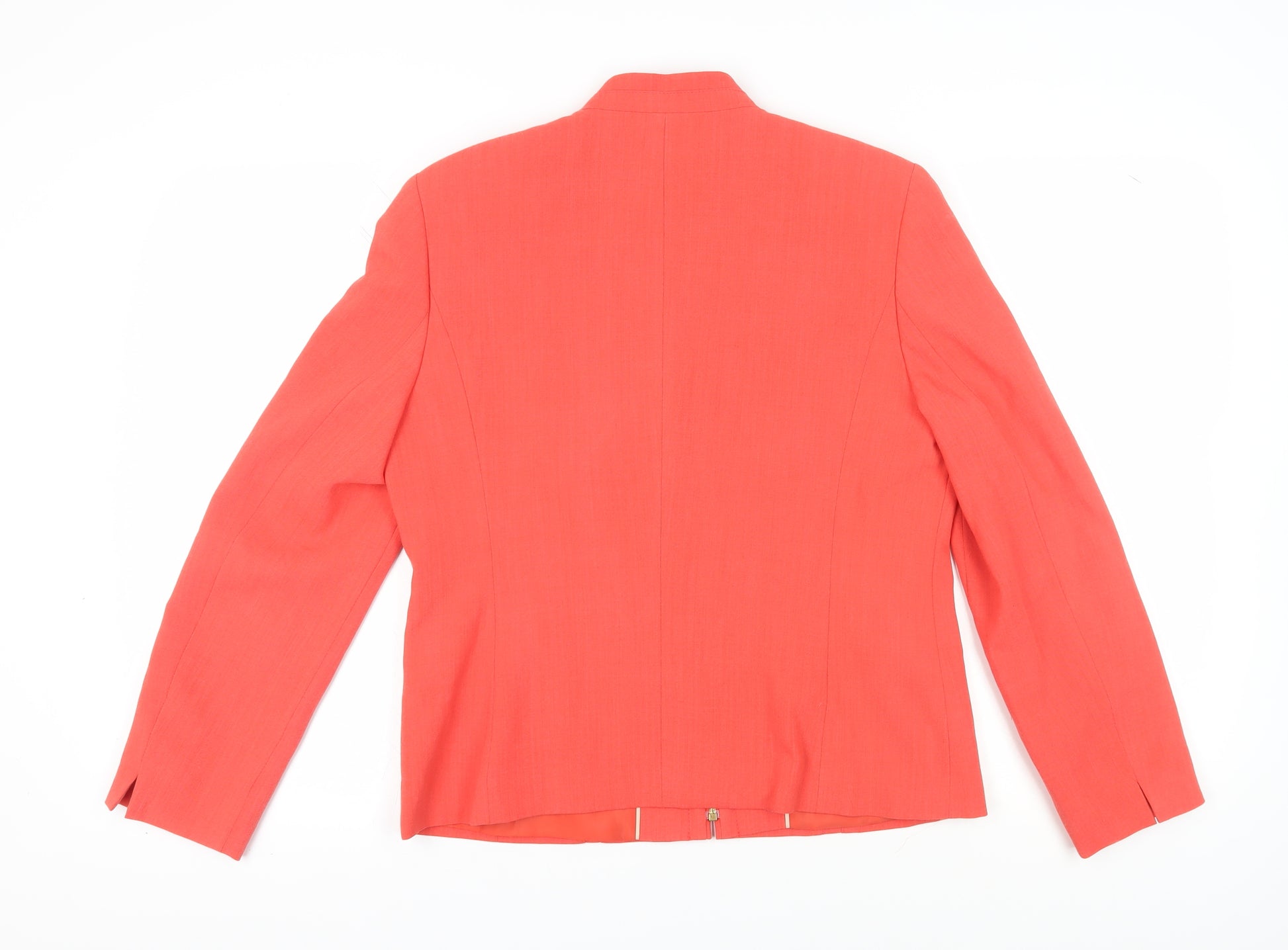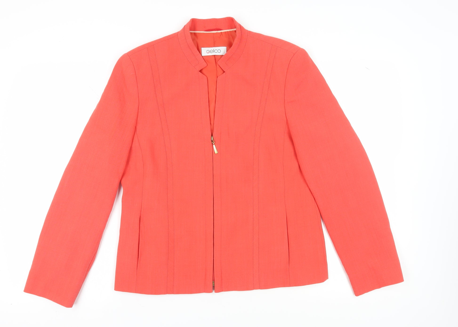Elevate your wardrobe with this elegant Gelco Women's Blazer in a striking orange shade, perfect for bringing a pop of colour to your ensemble. Designed for women seeking both style and comfort, this blazer is crafted from a blend of polyester, wool, and elastane, providing a durable yet flexible fit. With its machine washable fabric and no-button front design, this regular-length blazer ensures easy maintenance and a sleek, modern silhouette. Whether you're heading to the office or a casual gathering, its long sleeves and high-quality polyester lining make it a versatile addition to any outfit. Despite missing original sales tags, this piece is in excellent condition with no visible flaws. Available in a UK size 12, it's a must-have for those who appreciate well-crafted fashion. Don't miss out on this opportunity to add a touch of luxury to your collection at an affordable price.