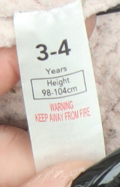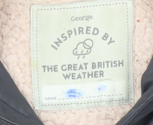 Keep your little one dry and stylish with this charming George Girls Grey Polka Dot Hooded Rain Coat, designed for ages 3-4 years. Crafted with a durable polyurethane outer shell and soft polyester lining, this mid-length coat offers reliable protection against the elements while ensuring comfort and flexibility for everyday adventures. The practical hood, waterproof finish, and secure zip and snap closure provide excellent coverage for rainy days, keeping your child snug on the way to school or outdoor play. Adorned with a subtle glossy polka dot pattern, the design adds a fun and playful touch without being overwhelming. Two front flap pockets offer extra storage for little treasures, while the cosy lining ensures warmth on cooler mornings. Perfect for autumn, spring, and even mild winter weather, this piece is both functional and fashionable. In very good condition, it shows minimal signs of previous wear with a lightly marked name label, but remains in great shape overall. Easy to care for and machine washable, this coat combines practicality with a delightful design parents will love. Ideal for daily wear, school days, park trips, and family outings, this lovely waterproof coat brings together style, comfort, and reliability inspired by the great British weather. Give your little one the perfect outerwear companion for changing seasons with this versatile and well-made George raincoat.