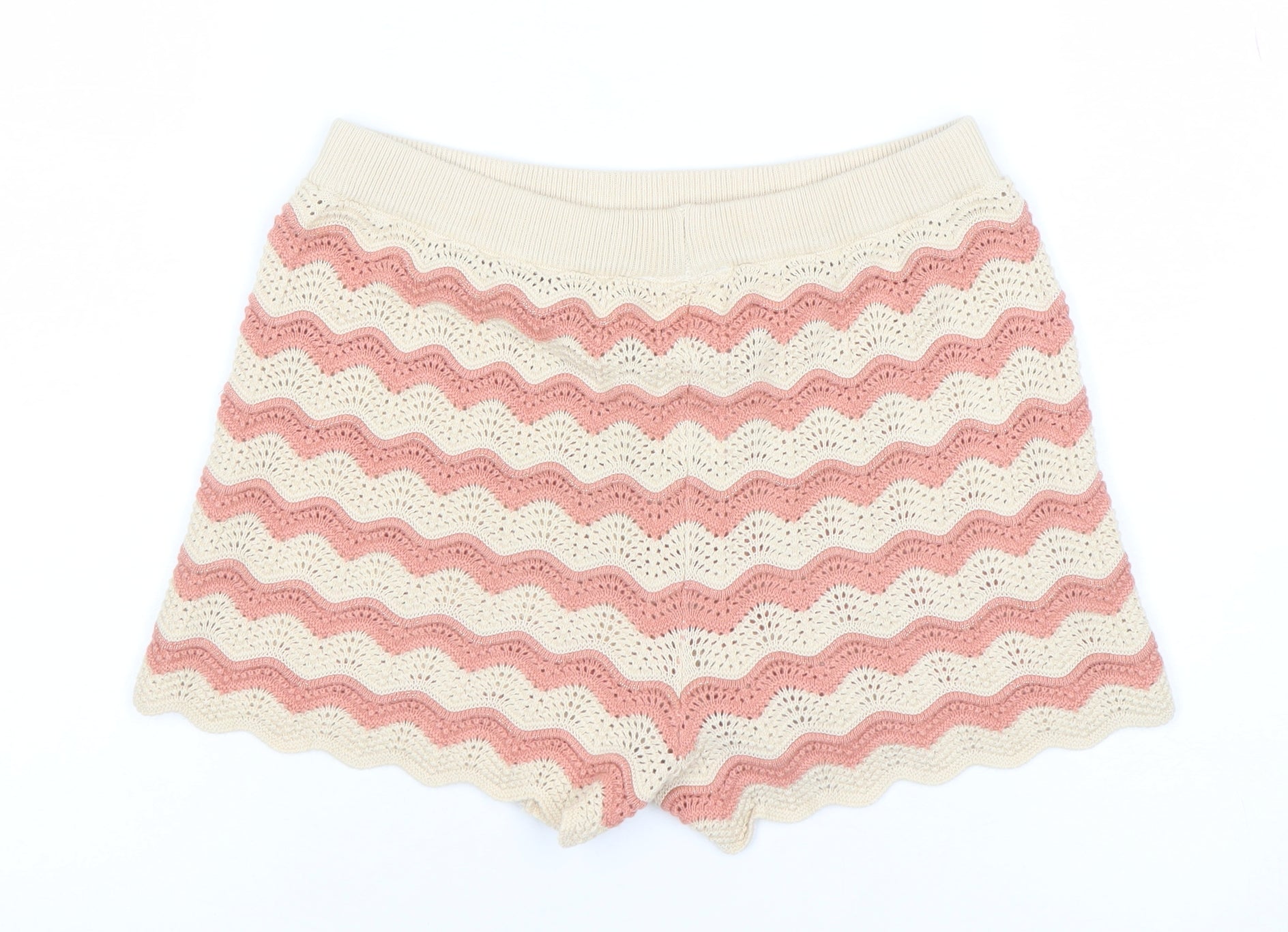 Brighten up your little one's summer wardrobe with these adorable knit shorts from George. Designed in a soft and breathable cotton blend, they feature a playful chevron stripe pattern in cream and pink hues, giving them a stylish and cheerful look that’s perfect for warm days. These shorts are crafted for comfort with an elasticated waistband that ensures a secure yet flexible fit, allowing freedom of movement while playing or relaxing. The lightweight knitted construction makes them comfortable against the skin and ideal for everyday wear, whether she’s heading to the park, beach, or a family picnic. The combination of 95% cotton, 4% polyester and 1% metallic fibre adds softness, subtle sheen and durability to withstand regular washing and active use. With their delicate scalloped hems and airy open-knit detailing, they bring a touch of vintage-inspired charm to casual dressing. Perfect for pairing with a simple T-shirt, tank top or lightweight summer jumper, these shorts are an easy and versatile piece for fun-filled summer days. The high-quality craftsmanship from George ensures long-lasting wear, and the excellent condition means they still look bright and fresh. These pink and beige striped knit shorts are sure to become a favourite in any girl’s wardrobe — a delightful blend of comfort, quality, and style that parents can trust and kids will love to wear. Add them to her outfit rotation for an effortlessly cute and comfortable look all season long.
