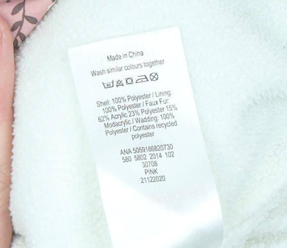 Keep little ones snug and stylish through the cold season with this charming pink floral puffer coat from George. Designed for girls aged 2-3 years, this mid-length padded coat blends practical warmth with an adorable touch of everyday fashion. The outer shell is crafted from durable, woven polyester, providing excellent protection against chilly breezes. Soft faux fur trim decorates the hood, adding a cozy and cute finish, while the inner lining is made from plush polyester for warmth and comfort.Fitted with a full front zip and button fastening, the coat is easy for little hands to manage, ensuring quick dressing for busy mornings. Its padded and quilted design gives an insulating feel without being too bulky, perfect for playground adventures or winter walks. Ribbed cuffs help lock in warmth, and two handy front pockets are ideal for keeping small hands toasty or carrying treasures.The floral pattern in soft pink tones makes this jacket a delightful addition to any little girl’s wardrobe, pairing effortlessly with jeans, leggings, or cosy knitwear. Designed for autumn and winter use, it balances durability and charm, making it both functional and fashionable.Ideal for everyday wear, nursery days, or family outings, this George puffer jacket offers unbeatable value for quality. With no signs of wear, stains, or repairs, it's rated in excellent pre-owned condition. The faux fur trim adds a sweet final touch, enhancing both warmth and style. Snuggle-ready and machine washable for easy care, this jacket promises to keep your child comfortably warm and on-trend all season long.