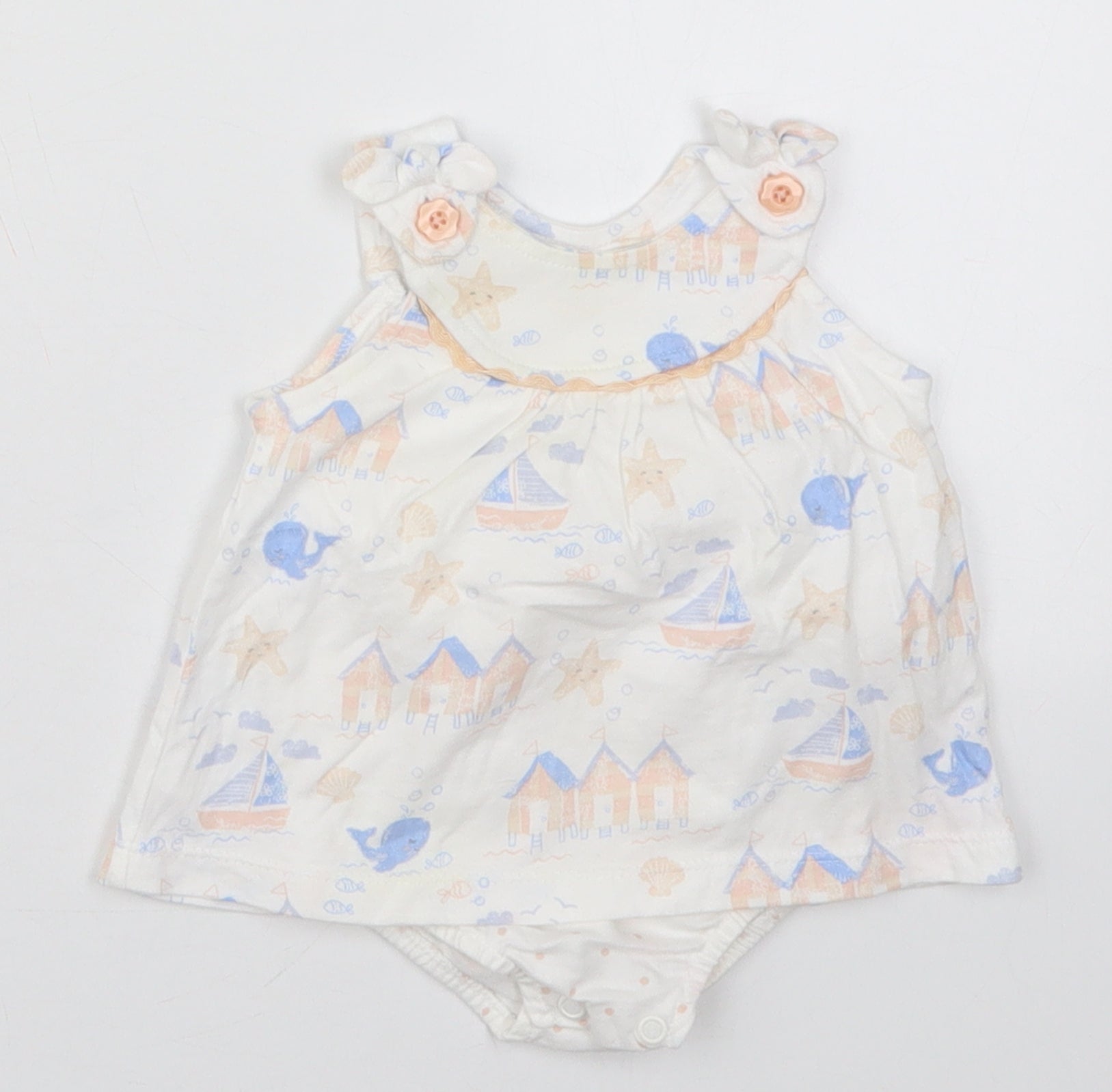 Girls White Cotton Babygrow One-Piece Size Newborn Button - Sailboats Whales