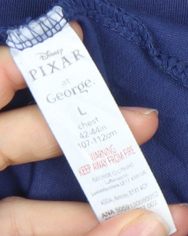 Show off your playful side with this officially licensed Disney Pixar Toy Story 'The Chosen One' T-shirt from George. Designed in a striking navy blue shade, the tee features the iconic three-eyed aliens from Toy Story, printed in bright green and blue with a fun graphic that captures nostalgic charm. Crafted from 100% cotton, the material offers a soft and breathable feel ideal for everyday wear while maintaining shape and comfort throughout the seasons. The classic crew neckline and short sleeves create a timeless silhouette, making it easy to pair with jeans, shorts, or joggers for a laid-back style. This men’s large T-shirt is designed to fit a chest size of 42–44 inches (107–112 cm), offering a relaxed yet flattering fit. The jersey fabric ensures a lightweight, easy-care garment that is machine washable for fuss-free maintenance. Featuring a durable graphic print, it’s perfect for fans of Toy Story who appreciate subtle humour and vintage-inspired movie designs. Despite gentle previous use, this T-shirt is in excellent condition with no visible flaws and retains its colour and softness. Ideal for casual days, weekend outings, or movie nights, this T-shirt makes a great addition to any wardrobe or a thoughtful gift for fans of Pixar classics. Whether worn under a jacket or on its own, it brings a touch of fun nostalgia to any outfit. Brighten your everyday style with this comfortable and characterful piece that celebrates one of the most beloved animated franchises in modern cinema.