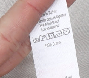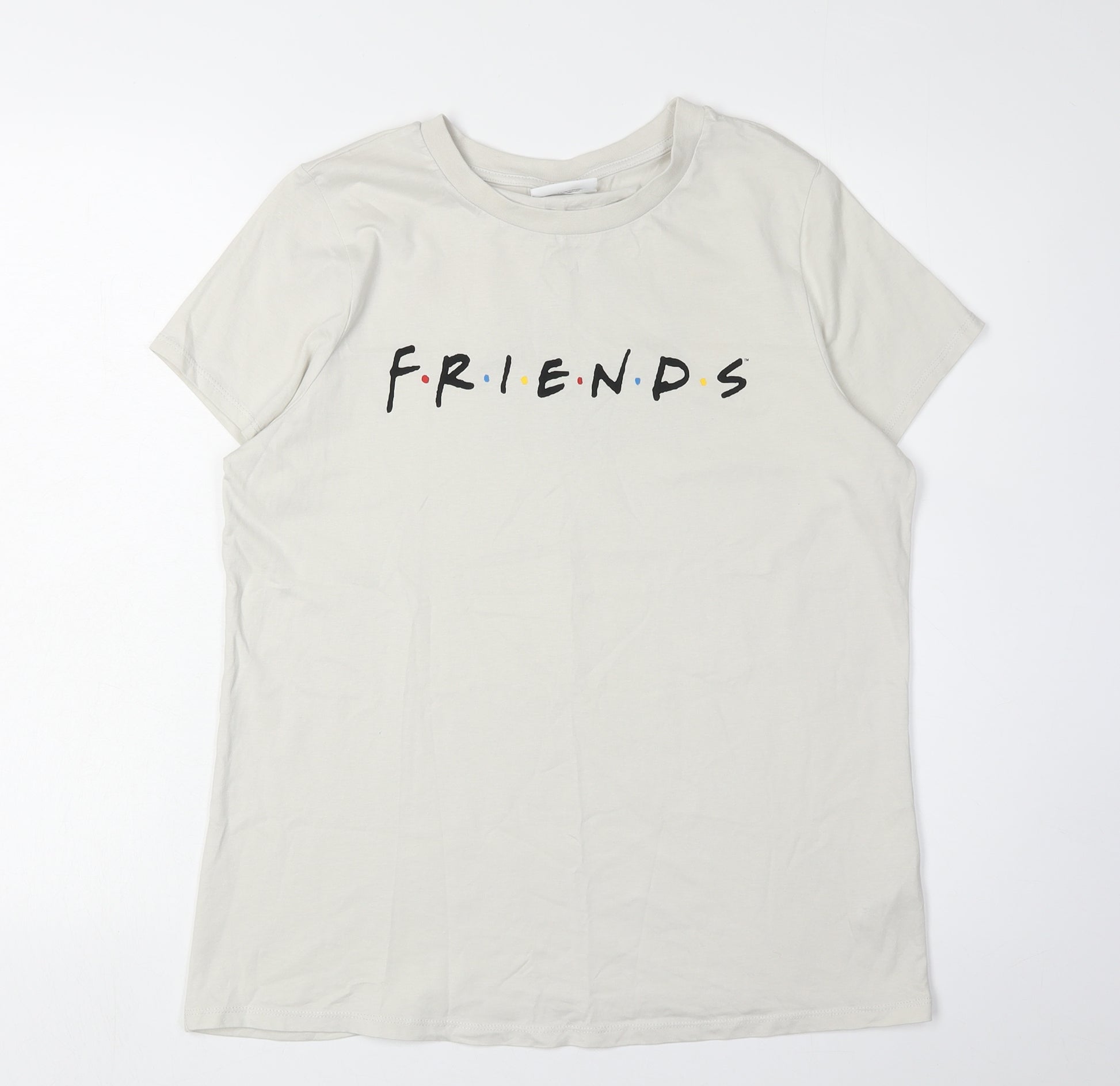 Embrace nostalgia with this charming beige Friends T-shirt from George, perfectly crafted for women who adore iconic 90s TV culture. This regular-sized tee in UK 12 offers a comfortable and relaxed fit, ideal for everyday wear or casual outings. Designed with a crew neck and classic short sleeves, it presents a simple yet stylish silhouette that pairs effortlessly with jeans or skirts. The shirt features a bold print of the beloved Friends logo, capturing the essence of the timeless sitcom, making it a must-have for fans. Made from 100% cotton, this jersey fabric ensures breathability and softness on the skin, promising all-day comfort. Its solid beige hue adds a versatile touch, allowing it to complement various outfits while providing a canvas for the Friends print to stand out. Machine washable for easy care, this tee is a practical addition to any wardrobe. Despite a slightly wrinkled appearance, it maintains excellent condition, ready for new adventures with its next owner. Whether lounging at home, enjoying a casual day out, or re-watching your favorite episodes, this shirt certainly makes a delightful addition to your collection. Affordable and stylish, it's an enticing piece that embodies both comfort and pop culture charm. Don't miss the chance to showcase your love for Friends with this standout T-shirt, a quick reminder of the laughter and friendship that defined a generation.