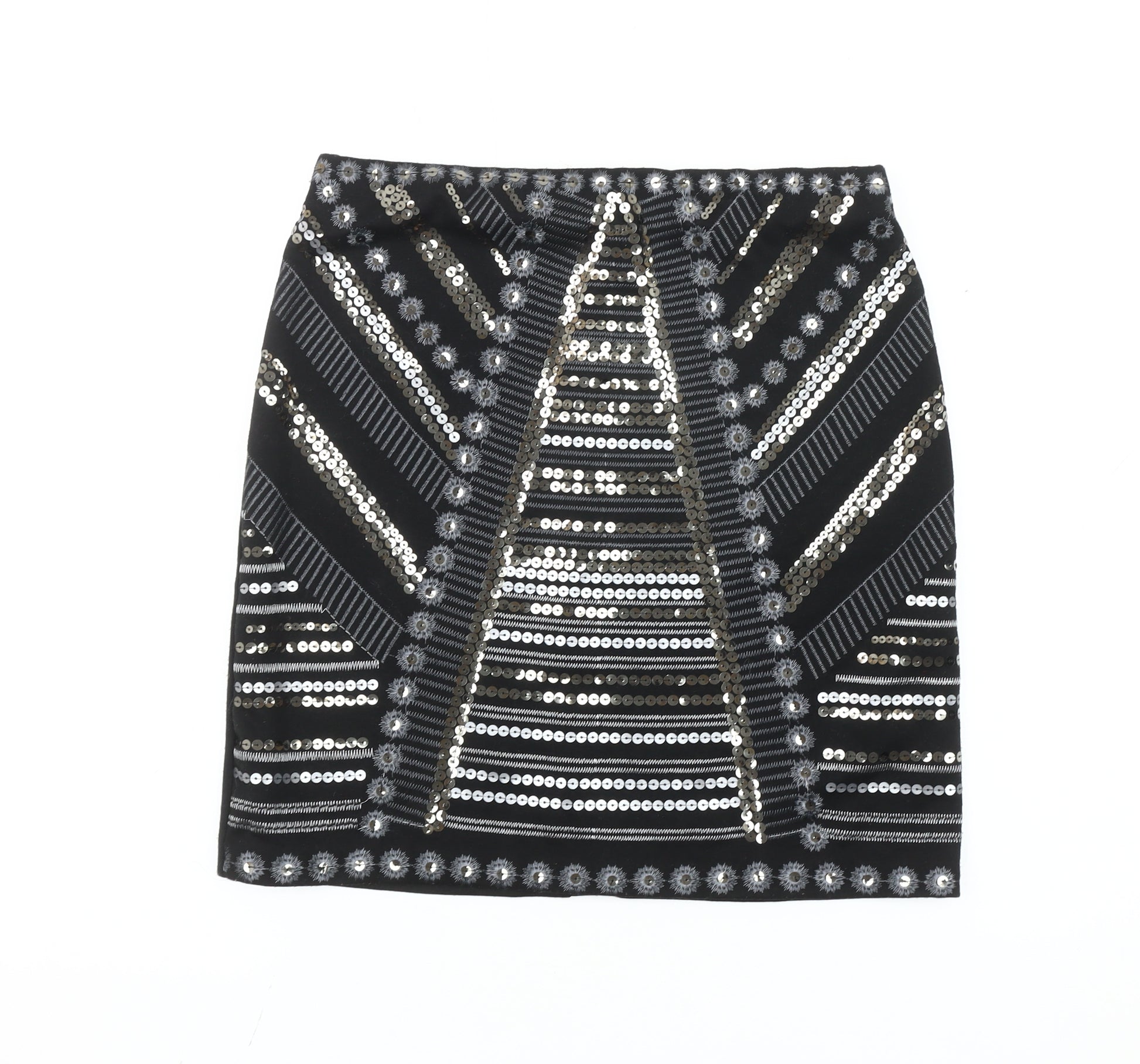 Step into the spotlight with this stunning black sequin pencil skirt from George, designed to make a statement at any party or cocktail event. This women’s size 8 short skirt boasts a sleek, figure-flattering straight and pencil silhouette, enhanced with a striking geometric sequin design in silver and metallic tones. Made from a comfortable knit fabric blend of 97% polyester and 3% elastane, it offers a slight stretch that ensures ease of movement while maintaining its chic, structured shape. Ideal for all seasons, this high-rise skirt features a zip closure for a secure fit and can be styled effortlessly with a tailored top or a chic blouse. Its versatile yet eye-catching design makes it perfect for special occasions where glamour is a must. In excellent condition with only light signs of previous wear, this skirt provides fantastic value for anyone seeking a stylish, high-impact piece without paying full retail prices. Whether you’re dancing the night away, attending a sophisticated evening gathering, or simply want to inject some sparkle into your wardrobe, this George party skirt is a must-have. Pair it with heels and a clutch for a bold evening look, or tone it down with opaque tights and ankle boots for a more subtle but equally stylish outfit. A great addition to your collection if you love fashion that stands out in a crowd, this skirt will keep you looking confident and polished wherever you go.