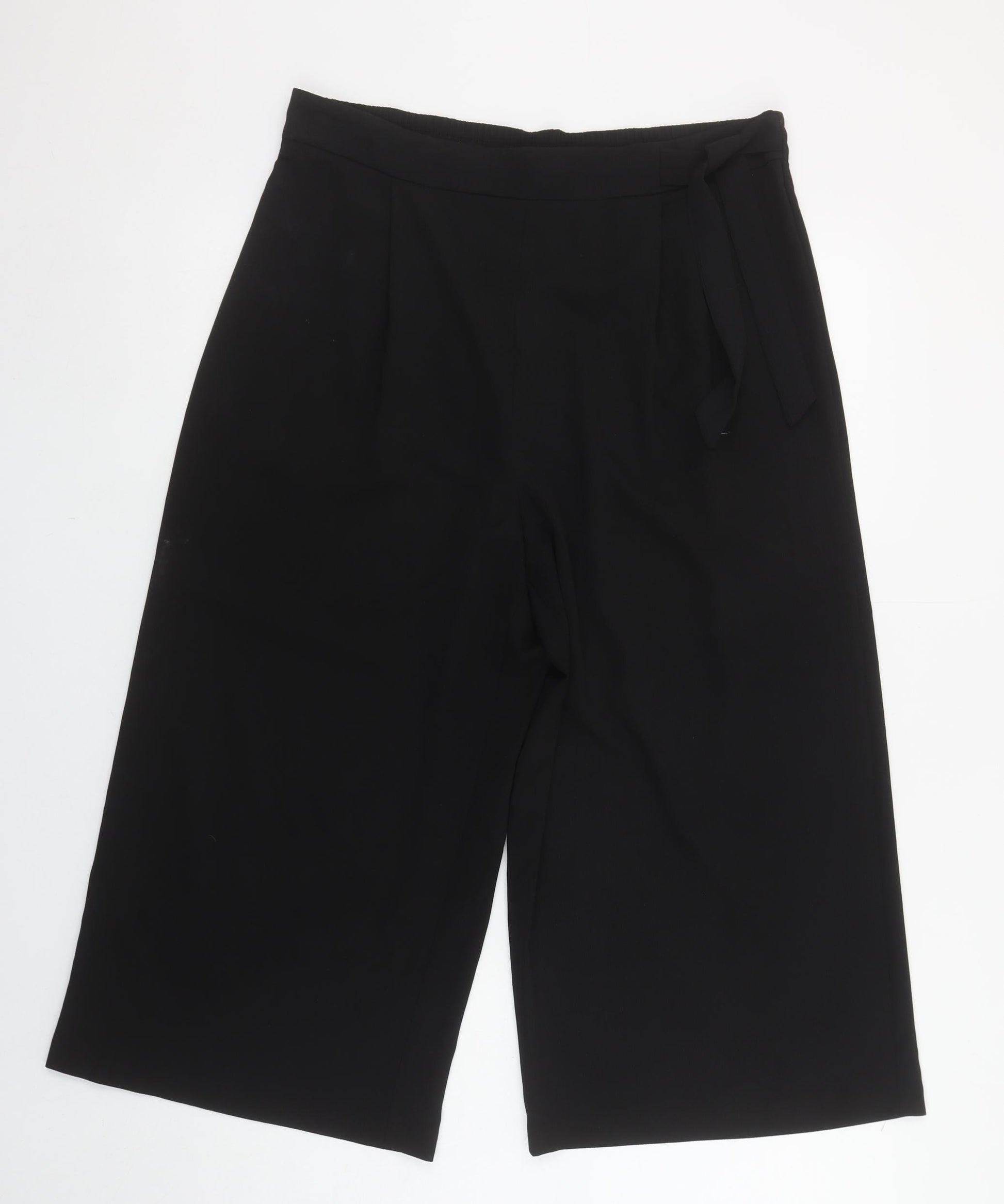 These chic cropped trousers from George combine effortless style with every day practicality. Tailored in a versatile black hue, they feature a wide-leg design that provides ease of movement and a flattering silhouette. The mid-rise waist and elastic back ensure a comfortable, secure fit suitable for all-day wear, while the soft twill fabric blend of polyester and elastane offers slight stretch and durability. With simple front pleats, a self-tie belt accent, and a clean flat front, these cropped trousers deliver understated sophistication that works beautifully for both casual and business settings. Perfect for pairing with blouses, vests, or tailored shirts, they can easily transition from daywear to evening smart-casual. Lightweight and comfortable, they make an ideal choice for warmer seasons such as spring, summer, and early autumn. The easy-care, machine washable material makes them a fuss-free wardrobe staple. These trousers are in very good pre-owned condition with only slight lint marks visible, which do not distract from their overall refined look. A practical yet stylish choice for modern women who value comfort and effortless elegance — perfect for office days, casual outings, or travel. The cropped cut and airy drape bring an easy, relaxed sophistication that makes these trousers a wardrobe essential for style-conscious women.