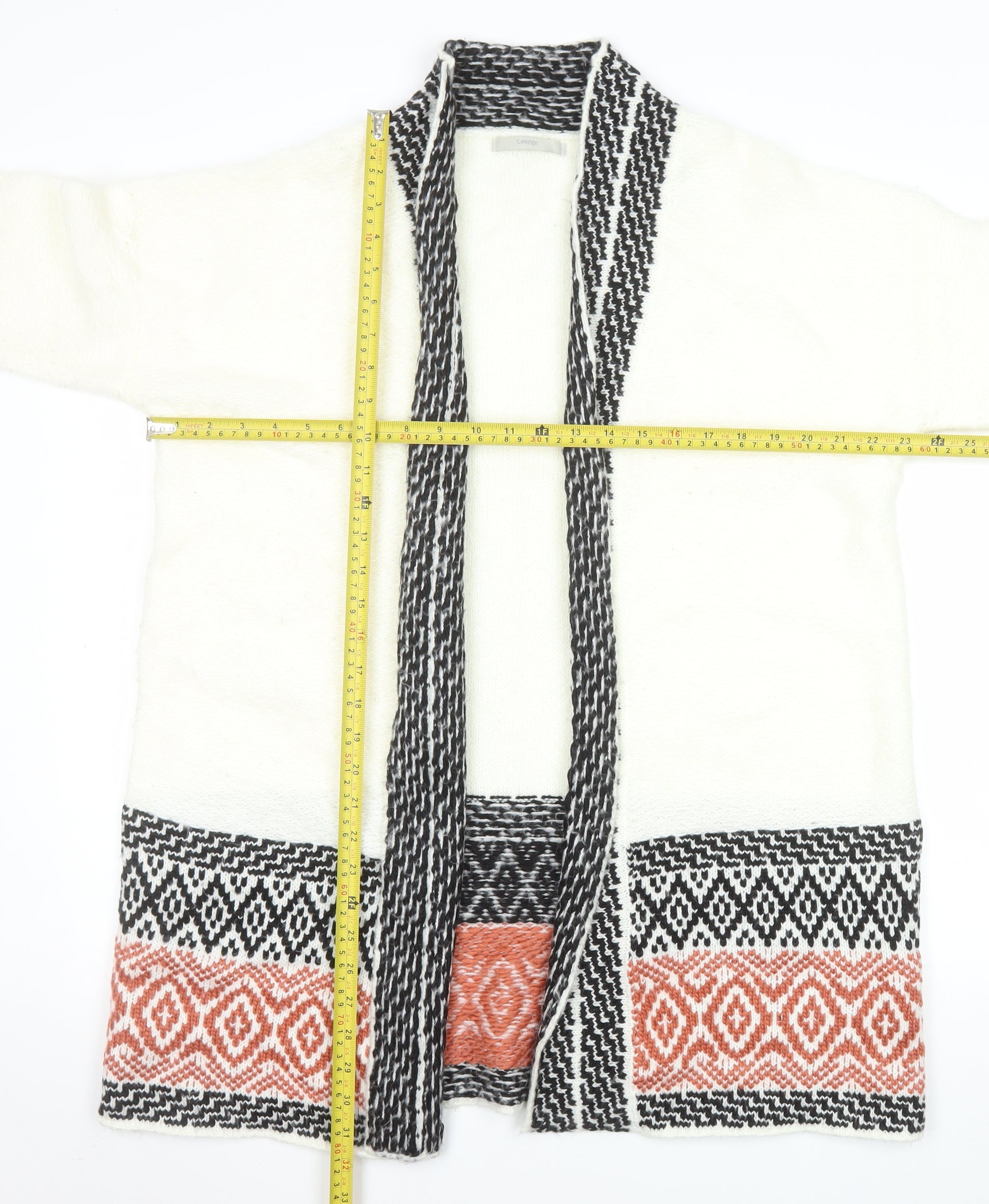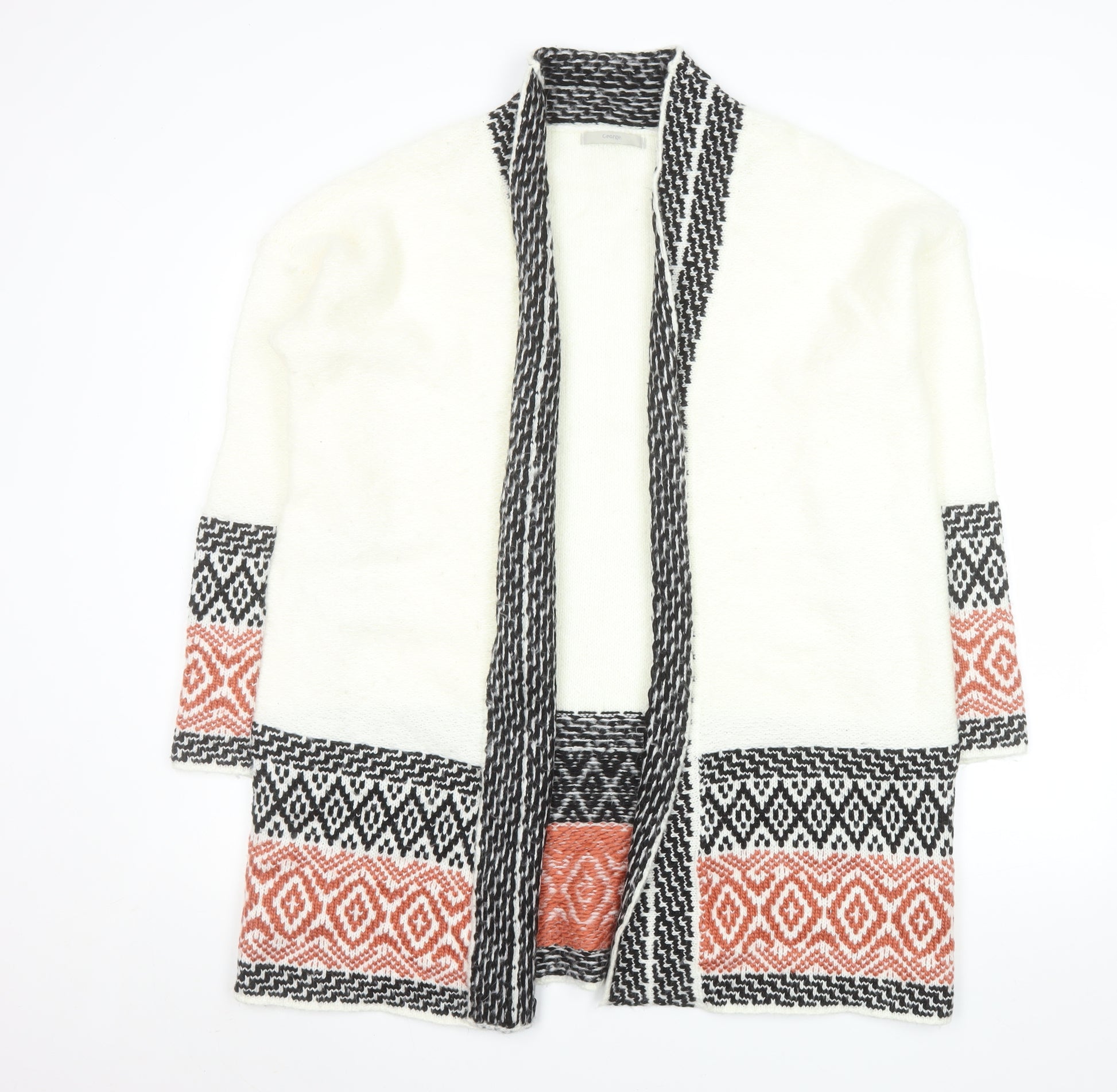 Add a touch of warmth and modern bohemian charm to your wardrobe with this stunning George Women’s Ivory Aztec Knit Cardigan in size 18. Crafted from a soft blend of 85% acrylic and 15% polyamide, this cardigan offers both comfort and style for cooler seasons. The chunky-knit texture gives a cosy feel, while the open front design allows for easy layering over tops, shirts, or dresses. Featuring an eye-catching geometric Aztec-inspired pattern in contrasting black and rust tones, this cardigan exudes a relaxed yet chic aesthetic perfect for casual days or cosy evenings. The long sleeves and lightweight knit make it an ideal option for autumn and winter wear, keeping you warm without feeling bulky. Designed for a relaxed fit, it drapes beautifully over your silhouette, effortlessly blending practicality and fashion. The high-quality knit provides durability and a smooth finish, ensuring it stays a favourite in your wardrobe for many seasons. Effortless to care for, this piece is machine washable, making it convenient for everyday use. Pair it with jeans and boots for a casual daytime look, or layer it over a dress for an effortlessly stylish outfit. Whether lounging at home or heading out for a weekend stroll, this George cardigan delivers comfortable sophistication. Light signs of previous wear are present but do not detract from its excellent overall condition. With its beautiful texture, eye-catching pattern, and versatile styling, this cardigan is a perfect combination of fashion and function, ready to elevate your knitwear collection.
