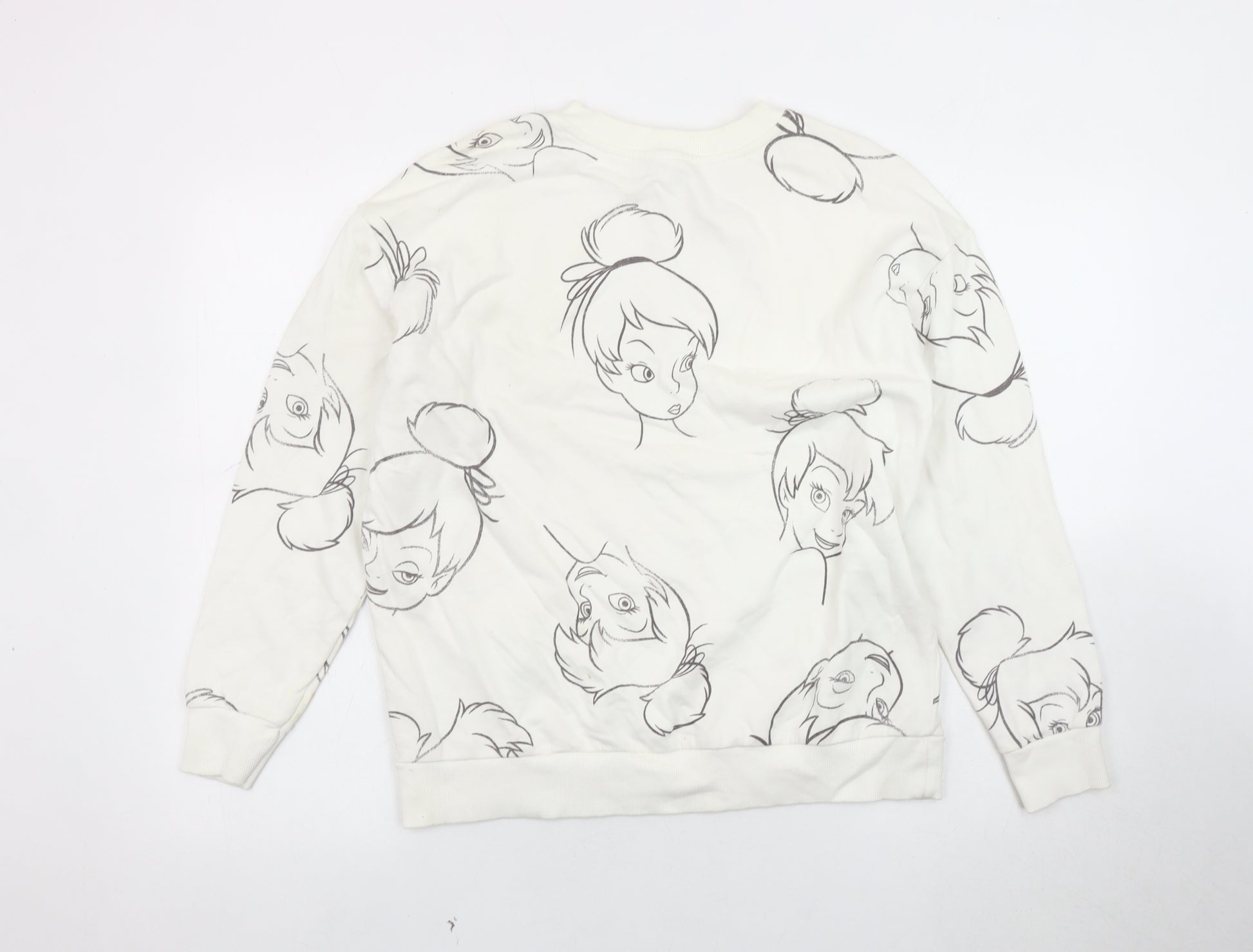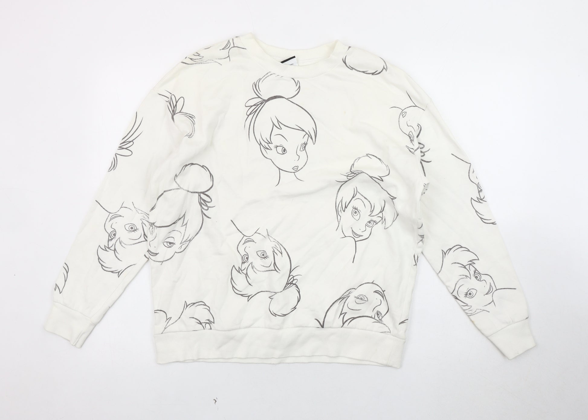 Indulge in the whimsical charm of this enchanting Disney-themed sweatshirt by George. This pullover style sweatshirt offers a graphic print of classic Disney characters, perfect for adding a playful touch to your casual wardrobe. The soft fleece fabric, a blend of cotton and polyamide, ensures comfort and warmth, ideal for any season. The white colour lends a clean, versatile look that effortlessly complements various outfits. Designed for women, it features a regular fit, long sleeves, and a cosy crew neckline. Perfect for casual outings or lounging, this sweatshirt is a delightful addition for any Disney fan. Despite slight wear on the cuffs, it remains in excellent condition, ready to bring a smile to your day.
