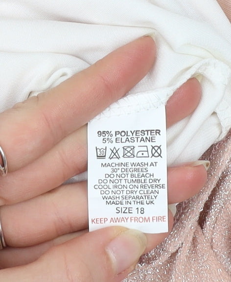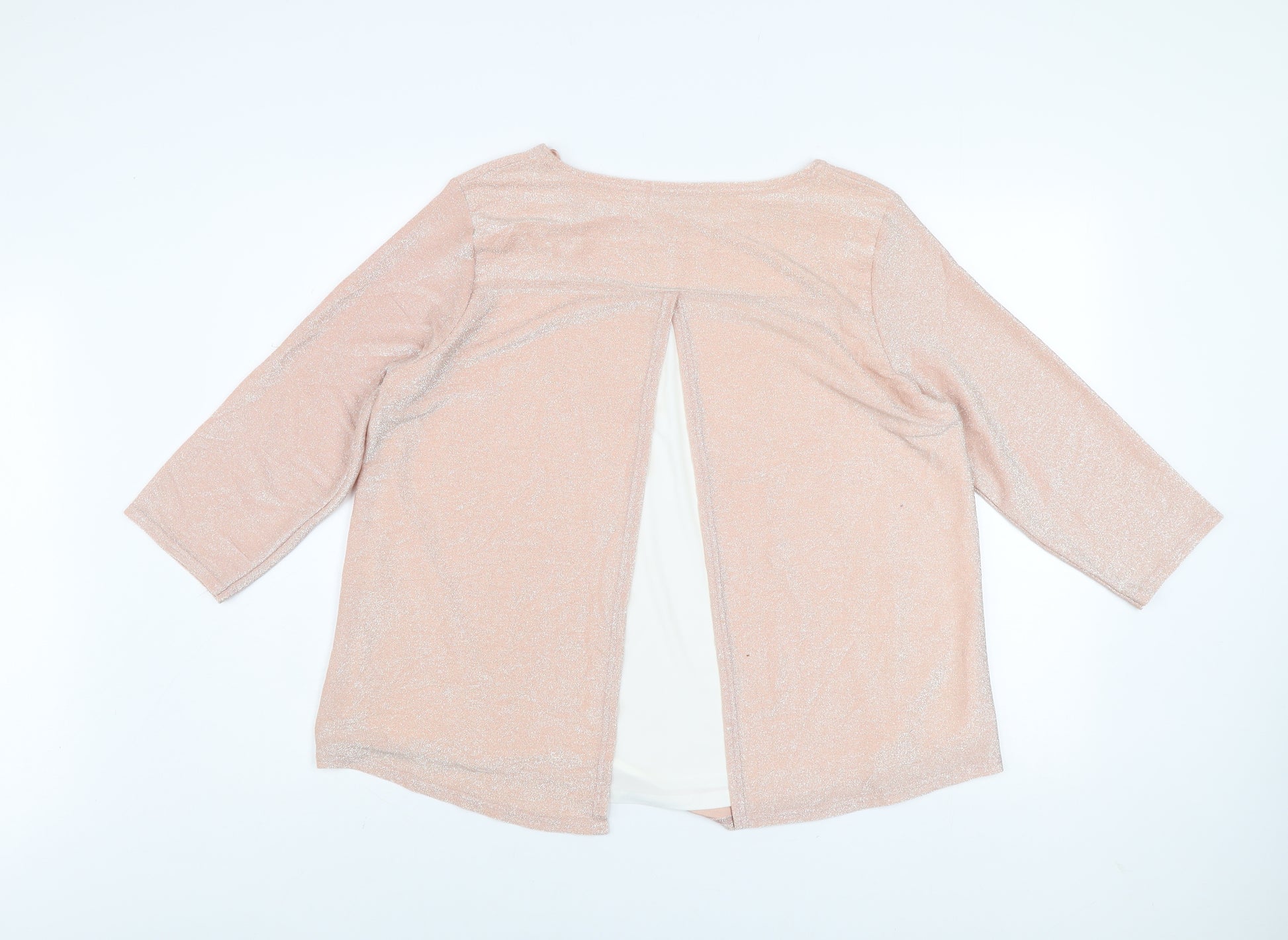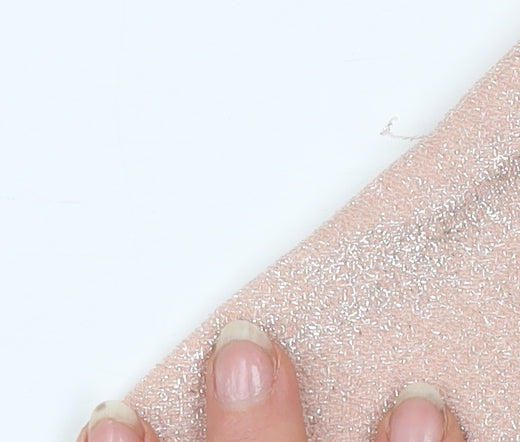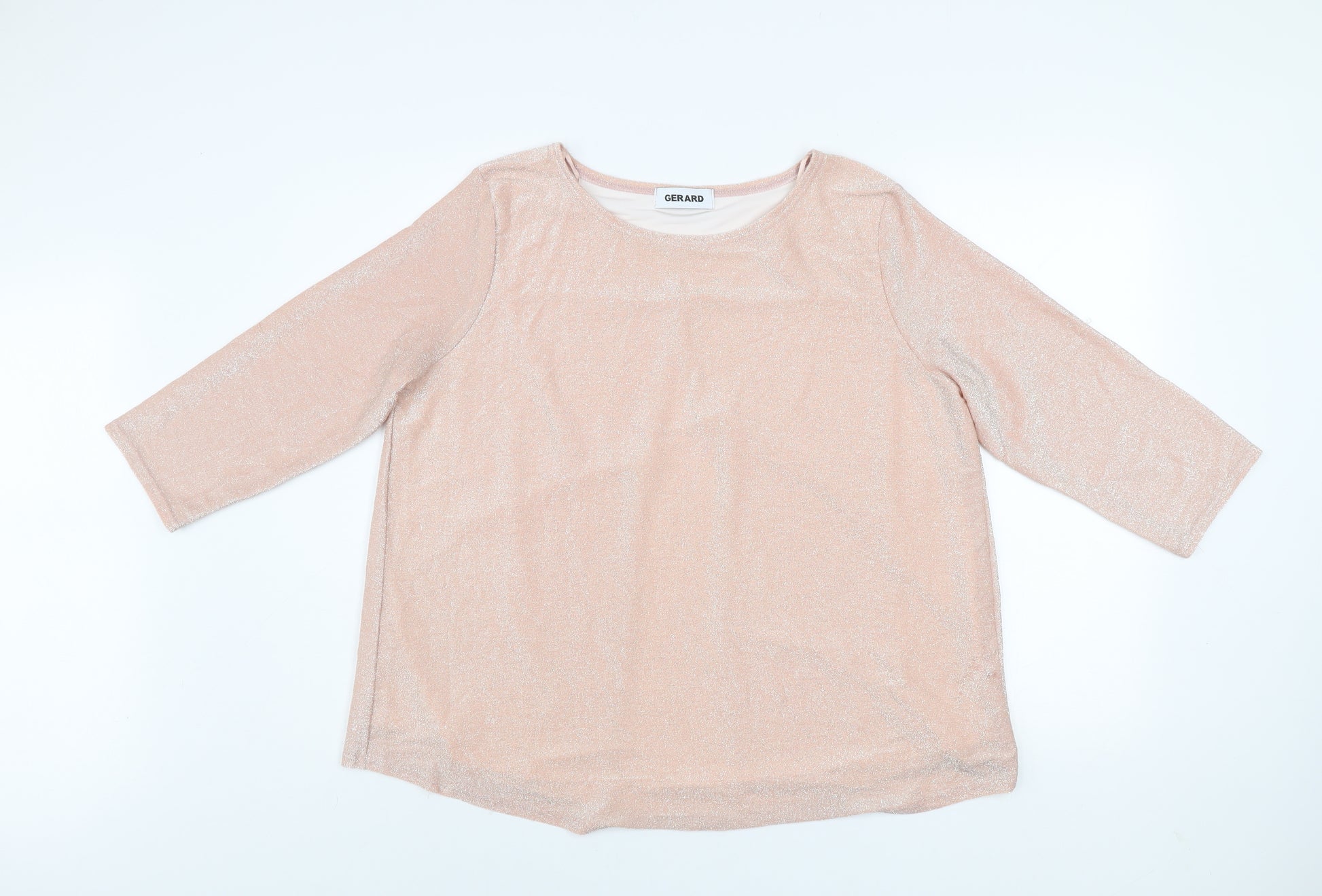 Add a touch of subtle sparkle to your wardrobe with this elegant women's blouse from Gerard. Designed in a soft blush pink shade accented with a shimmering glitter finish, this top brings understated glamour that's perfect for both casual and dressy occasions. The classic round neckline and 3/4 length sleeves create a timeless silhouette, while the lightweight jersey fabric crafted from 95% polyester and 5% elastane ensures both comfort and flexibility. The material has a soft inner feel and a gently shimmering outer layer that catches the light beautifully, making it ideal for spring and summer evenings or festive gatherings. The blouse features a small back vent which adds a flattering shape and enhances breathability. Its pullover design makes it easy to wear, and the breathable stretch fabric keeps you comfortable throughout the day. The solid but glittered finish gives the top a chic, versatile aesthetic that pairs effortlessly with black trousers, jeans or a pencil skirt. Whether you're heading to a relaxed daytime event or a party, this blouse transitions seamlessly. Machine washable and easy to care for, it's a low-maintenance wardrobe essential that doesn't compromise on style. This blouse is pre-owned in excellent condition, showing minimal signs of wear with no marks or damage visible. Priced affordably for its quality and brand, it's a stunning find for any fashion-savvy woman looking to add a hint of sparkle to her everyday wardrobe. Make this Gerard women's pink glitter blouse yours for an effortlessly chic and comfortable outfit option that exudes sophistication in every setting.