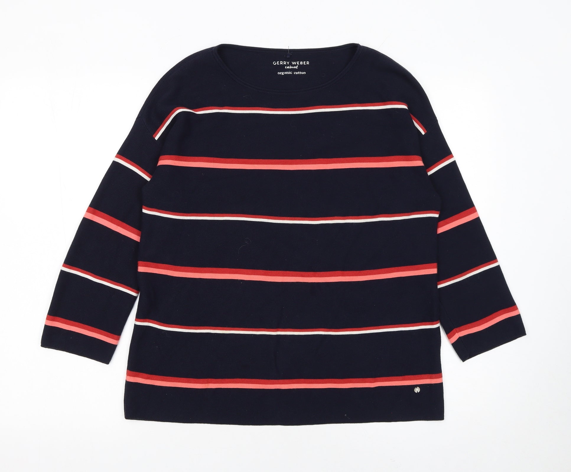 Add a touch of smart-casual elegance to your wardrobe with this beautifully made Gerry Weber women’s striped pullover jumper. Crafted from 100% organic cotton, this piece offers both comfort and breathability, making it an ideal choice for all-day wear through the changing seasons. The soft knitted fabric ensures a lightweight, cosy feel, while the high-quality construction speaks to Gerry Weber’s reputation for timeless, refined style. The jumper features a classic navy blue base enhanced with red and white horizontal stripes for a nautical-inspired look that’s both flattering and effortlessly chic. Its boat neckline and regular fit create a sleek silhouette that pairs perfectly with jeans, chinos, or skirts for a versatile outfit option. The long sleeves and tight-knit style offer warmth without heaviness, perfect for layering under a jacket in cooler months or wearing on its own for relaxed days. Finished with subtle detailing, this piece exemplifies understated sophistication, ideal for the modern woman who appreciates simple yet elegant fashion. Designed in Germany, the craftsmanship reflects thoughtful design and quality materials, ensuring long-lasting wear. Perfect for casual outings, brunch dates, or laid-back office settings, this striped knit jumper merges style and practicality. The versatile blue colour palette complements various wardrobe pieces, allowing easy coordination with neutral tones or pops of colour. A true everyday essential, this Gerry Weber jumper offers easy care with a machine-washable finish, maintaining its shape and softness after each wear. With its excellent condition and luxurious feel, this pullover represents both value and style for the discerning dresser looking for elevated comfort. Whether layered or worn solo, it’s a staple piece that enhances your wardrobe with its timeless appeal and premium cotton comfort.