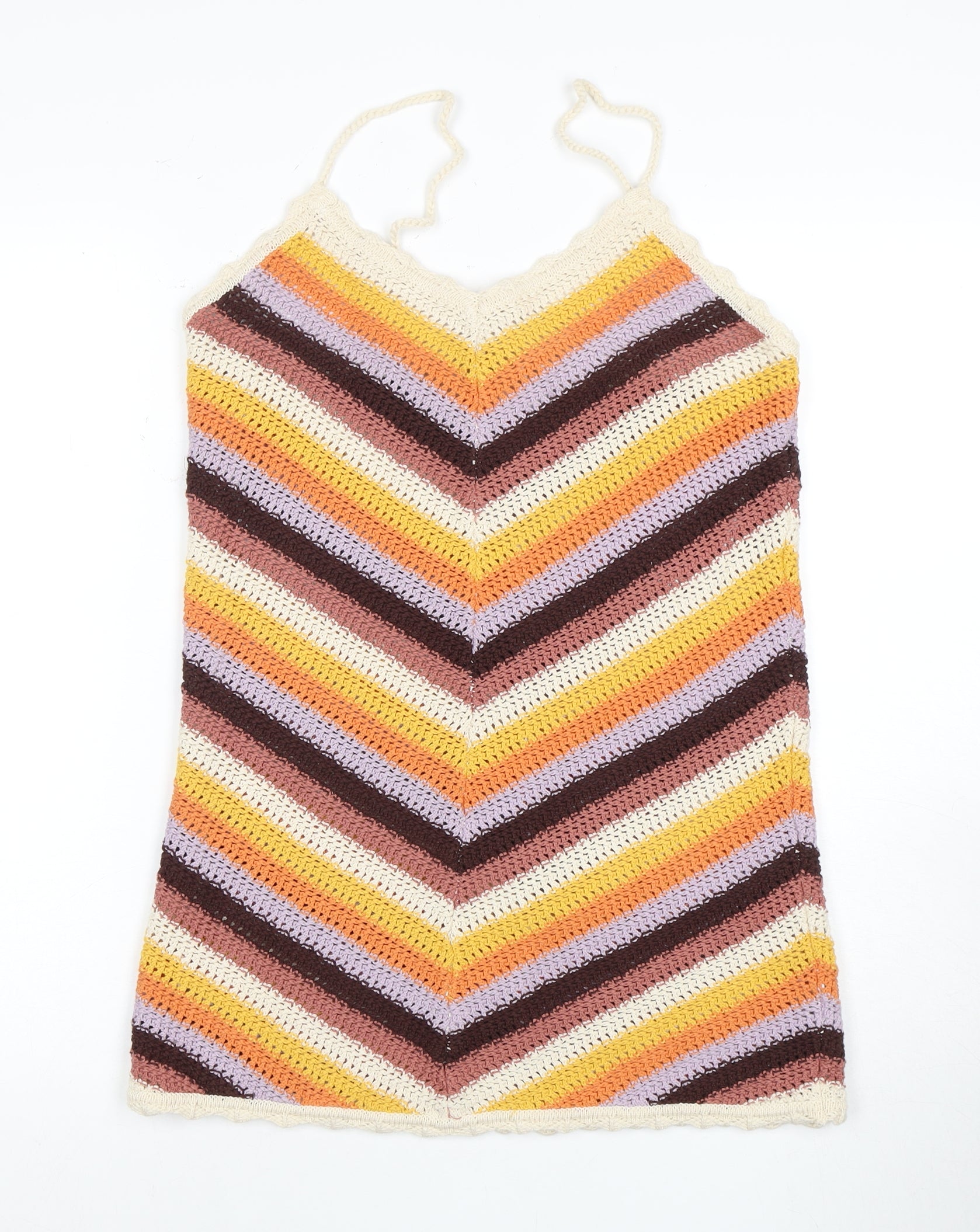 Introducing a vibrant multicoloured mini slip dress from Ghanda, perfect for adding a splash of colour to your summer wardrobe. Crafted from 100% soft cotton in a classic crochet style, this dress promises both comfort and a chic bohemian vibe. Designed for women, its V-neckline and sleeveless strappy design make it ideal for casual outings in warmer weather. The eye-catching chevron pattern adds a trendy touch, while the pullover closure ensures ease of wear. Lightweight and breathable, this dress is a go-to for holiday packing or a relaxed day out. Pair it with sandals or sneakers for an effortless look. In excellent condition with no visible damages, this dress is a perfect choice for anyone looking to refresh their usual style with a pop of colour and pattern. Experience the signature softness of Ghanda's meticulous design, ensuring you feel stylish and comfortable all day long.