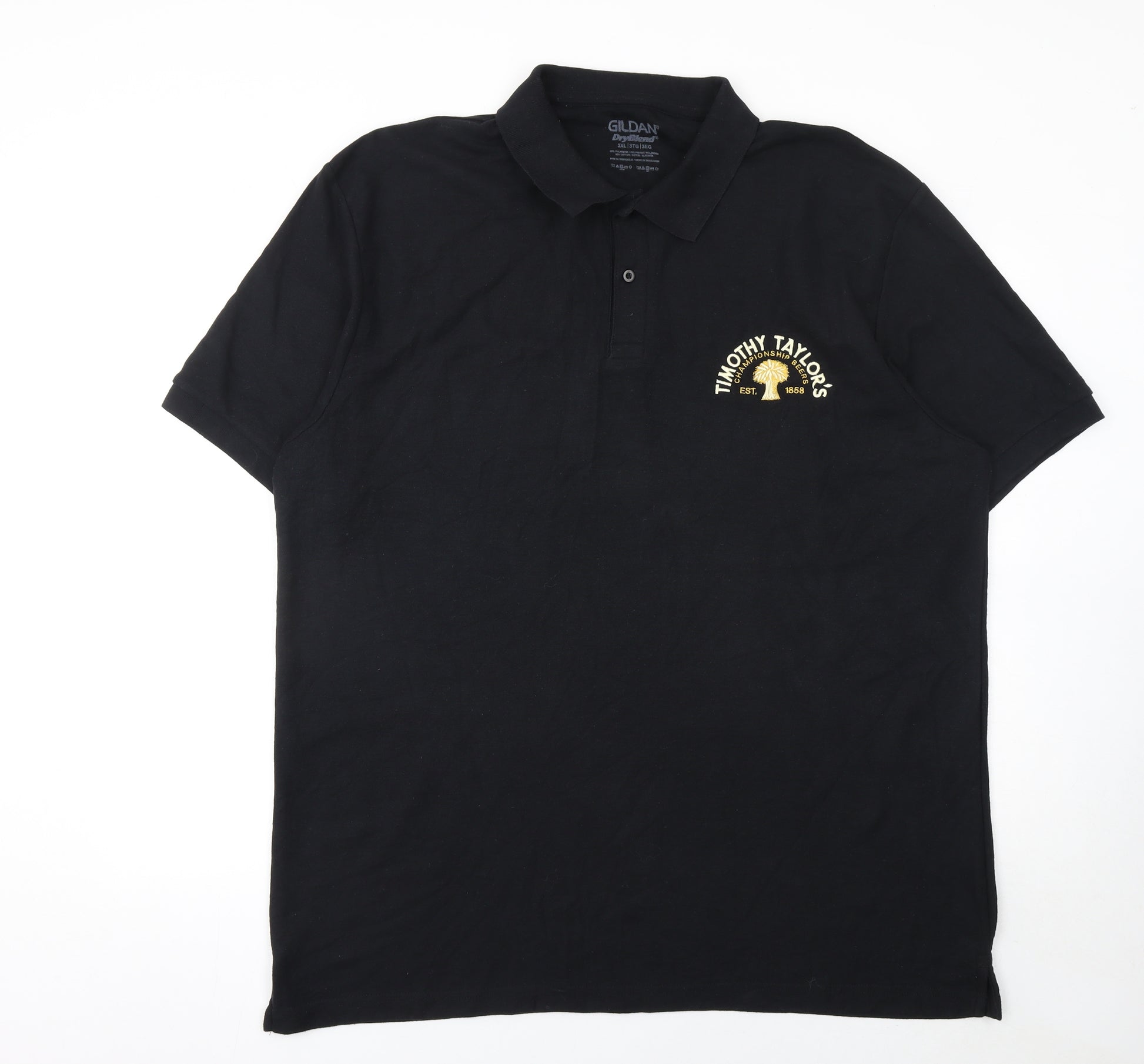 This Gildan men’s polo shirt in size 3XL offers a classic and comfortable look with a touch of personality. Made from a soft and breathable mix of 65% polyester and 35% cotton, this black polo is designed with moisture-wicking properties that keep you cool and comfortable throughout the day. The collared neckline and short sleeves provide a timeless silhouette suitable for both casual and workwear settings. Featuring an embroidered Timothy Taylor’s Brewery logo on the chest, it adds a stylish branded touch that stands out subtly against the solid black fabric. The Regular Fit cut ensures ease of movement without feeling oversized, ideal for everyday wear, pub events, or relaxed corporate occasions. With a three-button placket closure, this shirt is simple to style and pairs well with jeans, chinos, or shorts. The durable fabric is machine washable and easy to care for, maintaining its appearance wash after wash. Lightweight yet durable, this polo is perfect for spring, summer, or autumn wear. Its breathable texture and moisture-control technology make it ideal for casual outings, light workwear, or strolling in comfort. In very good pre-owned condition with only slight signs of wear, it remains clean and ready for immediate use. The quality embroidery and reliable Gildan craftsmanship ensure this polo retains its shape and finish. A great choice for anyone seeking versatile, brand-inspired wardrobe essentials. Whether you’re a fan of Timothy Taylor’s or simply want a stylish and practical black polo, this piece delivers both branding appeal and everyday wearability. Add this Gildan DriBlend polo to your collection for effortless style that balances comfort, quality, and casual sophistication.