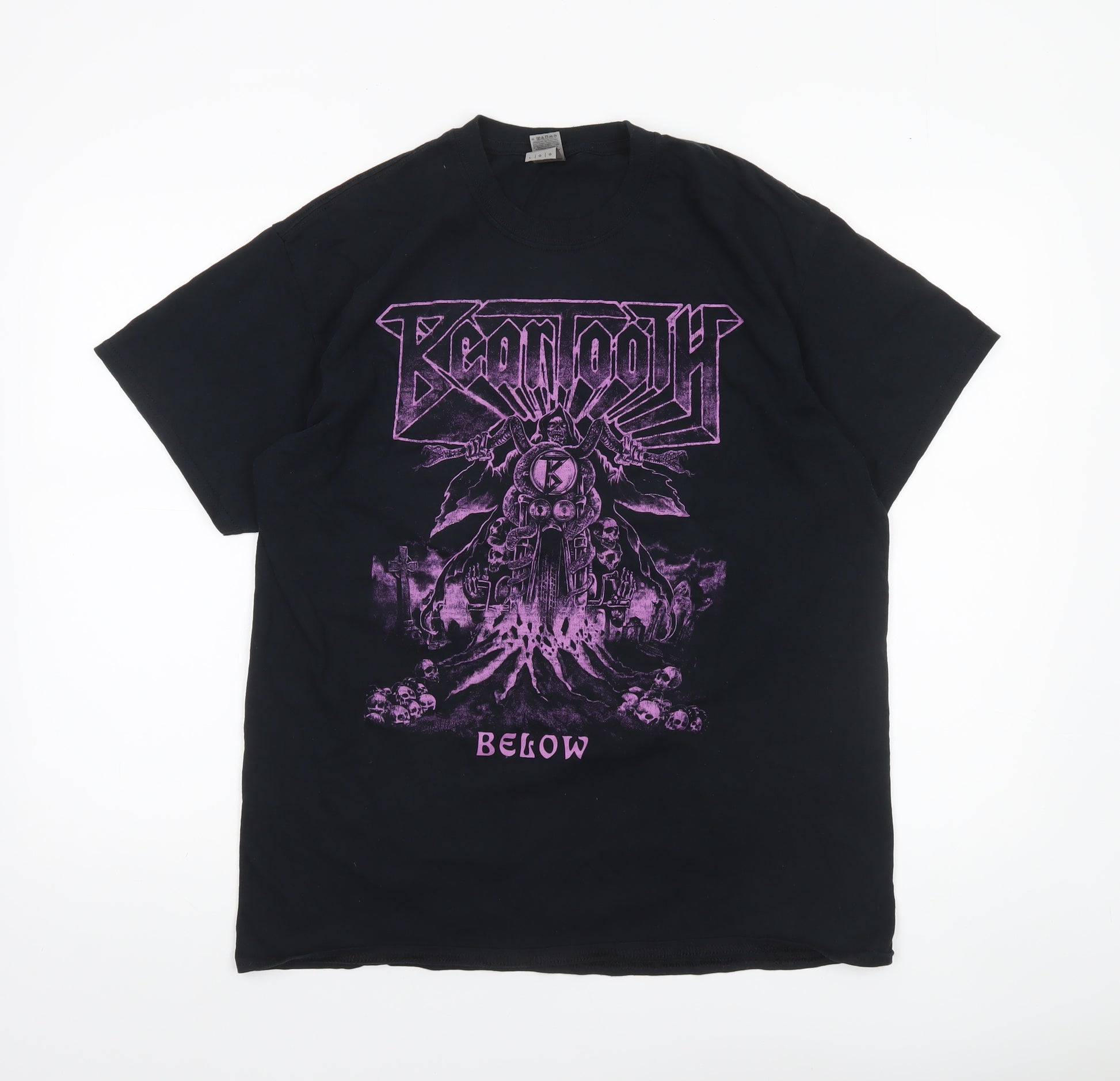 This Gildan Men's Black Band Graphic Heavy Cotton T-Shirt in size Large delivers the perfect mix of classic comfort and bold style. Made from 100% heavy cotton fabric, the jersey material ensures long-lasting durability with a soft, breathable feel, ideal for all-day wear. Featuring a standout purple print on a black base, the graphic design gives the shirt a distinctive rock and gothic-inspired aesthetic that fans of alternative or metal music will love. Designed with a regular fit and a classic crew neckline, this T-shirt pairs effortlessly with jeans, shorts, or casual trousers. The short sleeves and preshrunk heavyweight cotton make it suitable for all seasons, offering resilience in both casual outings and gig settings. Machine washable for easy care, the fabric retains its shape and bold colour wash after wash. This T-shirt exhibits only light signs of wear, with the print still vibrant and intact, making it an excellent condition pre-owned item. Perfect for anyone who appreciates band merchandise or unique statement fashion pieces, this Gildan Heavy Cotton tee captures both personality and practicality. Whether you're heading to a concert, casual get-together, or adding to your collection of print tees, it’s a versatile addition to any wardrobe. The heavyweight fabric gives a premium feel while providing comfort and structure, ensuring that the shirt hangs well with a flattering silhouette. With its distinctive purple artwork and reliable Gildan quality, this piece stands out as an affordable style choice for those looking to express individuality. A strong black base complements any outfit, making it easy to style while giving off a confident, edgy vibe that never goes out of fashion. Overall, this T-shirt is perfect for music fans or casualwear lovers seeking a durable, bold, and versatile wardrobe staple that encapsulates effortless everyday style.