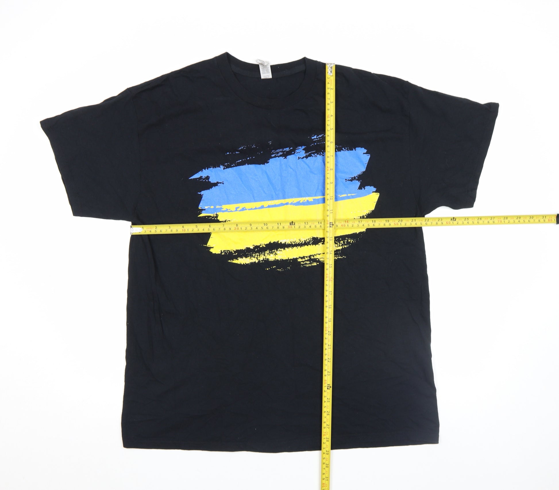 This Gildan Men's Heavy Cotton T-Shirt in size L is a comfortable and stylish choice for casual wear. Crafted from 100% cotton jersey, it offers breathable comfort ideal for use throughout the year. The classic black colour serves as a versatile base, while the bold flag-inspired graphic print in blue and yellow adds a unique, patriotic touch to your outfit. Its regular fit and crew neck design ensure a relaxed yet well-proportioned silhouette that suits a variety of body types and styles. With lightweight and durable construction, this short-sleeve tee is perfect for layering under jackets or wearing on its own during warmer seasons. The high-quality cotton material makes it soft to the touch and easy to care for, being fully machine washable. The T-shirt maintains its shape and feel even with regular use, and its graphic detail retains vibrancy. Designed for everyday wear, it works equally well for men seeking an effortlessly cool wardrobe staple suitable for casual outings, leisure activities, or social events. Gildan is known for dependable, high-quality basics, and this piece reflects their well-regarded craftsmanship. The simple crew neck cut offers a classic appeal, pairing effortlessly with jeans, shorts, or joggers. Conditioned in very good pre-owned state, this T-shirt has minor signs of gentle wear with no significant flaws, ensuring plenty of life left in it. Ideal for those who enjoy expressive printed tees, this Gildan design balances boldness with comfort for versatile daily use. Whether showing support for a cause, enjoying casual weekends, or simply adding to a collection of well-made cotton essentials, this shirt makes a smart, affordable choice for any modern man’s wardrobe.