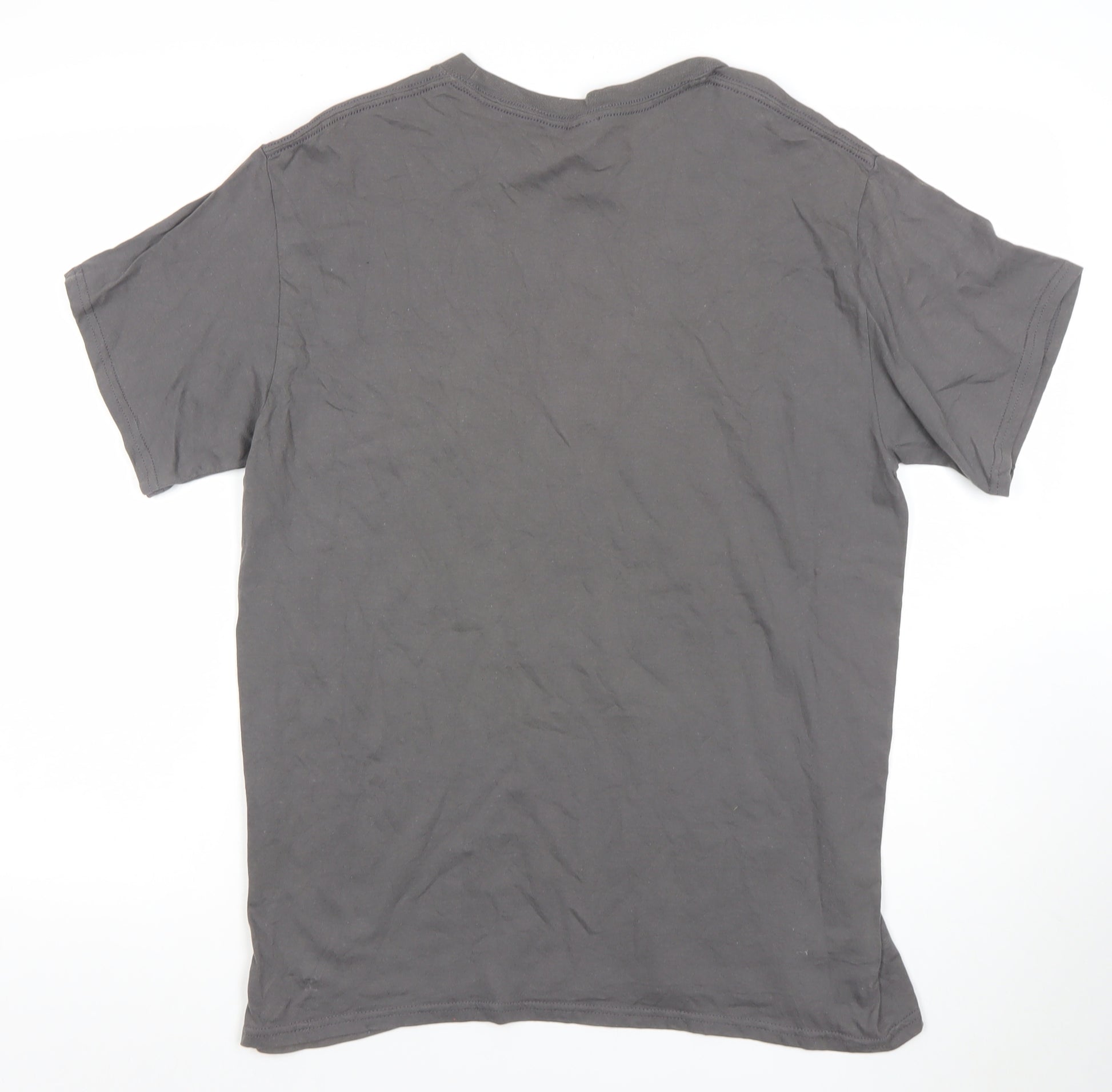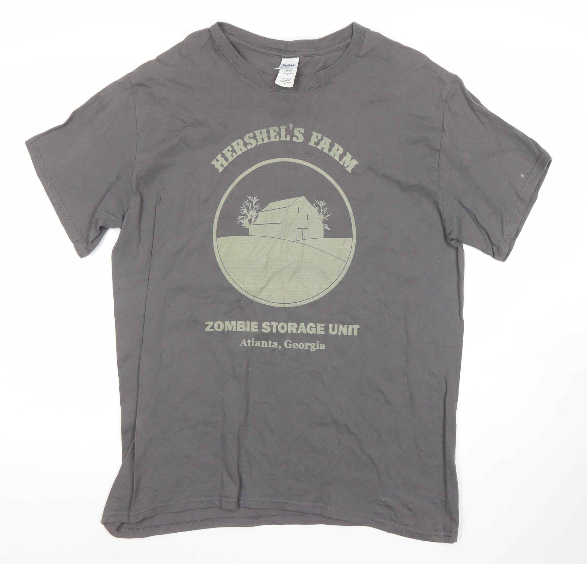 This Gildan men's grey T‑shirt is the ultimate casual statement piece for fans of post-apocalyptic and zombie culture. Featuring the humorous and instantly recognisable 'Hershel's Farm – Zombie Storage Unit, Atlanta, Georgia' graphic on the chest, it captures a vintage horror aesthetic while keeping everyday comfort at the forefront. Made from 100% soft ring spun cotton, this preshrunk jersey fabric ensures durability and shape retention wash after wash. Designed in a classic crew neck and short sleeve cut, this tee offers a regular fit that suits any relaxed outfit. The medium-weight cotton provides breathable comfort ideal for summer wear or layering under hoodies and jackets in cooler weather. Perfect for fans of shows like The Walking Dead, collectors of pop culture apparel, or anyone with a dark sense of humour, this graphic tee pairs effortlessly with jeans, cargo shorts, or joggers. Though pre-owned, it remains in very good condition with only light overall wear and minor creasing, showing excellent care from previous use. Its durable quality and high‑contrast print make it a timeless addition to any casual wardrobe. Machine washable for easy care, this T‑shirt embodies Gildan’s trusted comfort and everyday versatility. Whether you’re relaxing at home, heading out to meet friends, or upgrading your themed wardrobe, this cotton T‑shirt delivers dependable softness and personality in one. A brilliant choice for collectors or anyone who loves unique graphic wear, it provides outstanding value and lasting quality. Add this zombie farm tee to your rotation and enjoy the easy styling, iconic print, and comfortable fit that makes it a favourite staple piece.