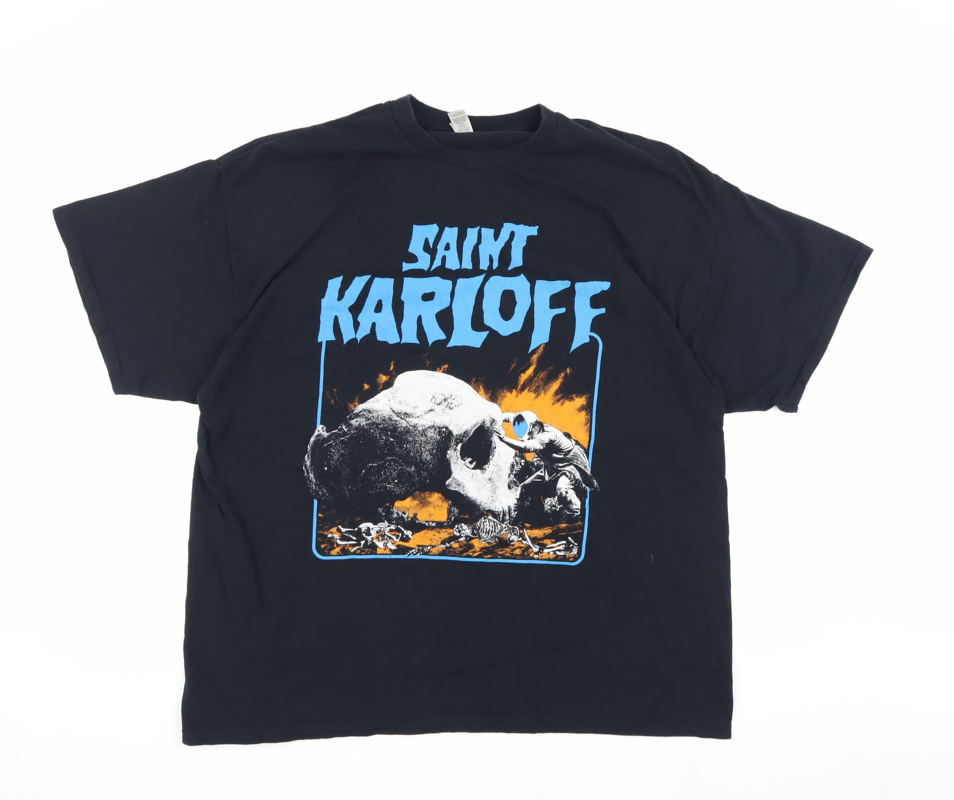 This Gildan T-shirt is an essential piece for music lovers and fans of gothic themes, featuring a striking graphic print that adds a bold statement to your wardrobe. Crafted from 100% cotton, this shirt guarantees comfort and durability, making it ideal for everyday wear. With its regular fit and heavyweight design, it assures a robust yet comfortable feel. Black in colour, this T-shirt is as versatile as it is stylish, easily pairing with a variety of outfits. Its crew neck and short sleeves provide a classic T-shirt look, suitable for all seasons. Perfect for unisex adults, the 2XL size ensures a relaxed and easy fit. Machine washable for effortless care, it's a practical choice for anyone. Add a touch of gothic flair to your casual style with this eye-catching Gildan piece.