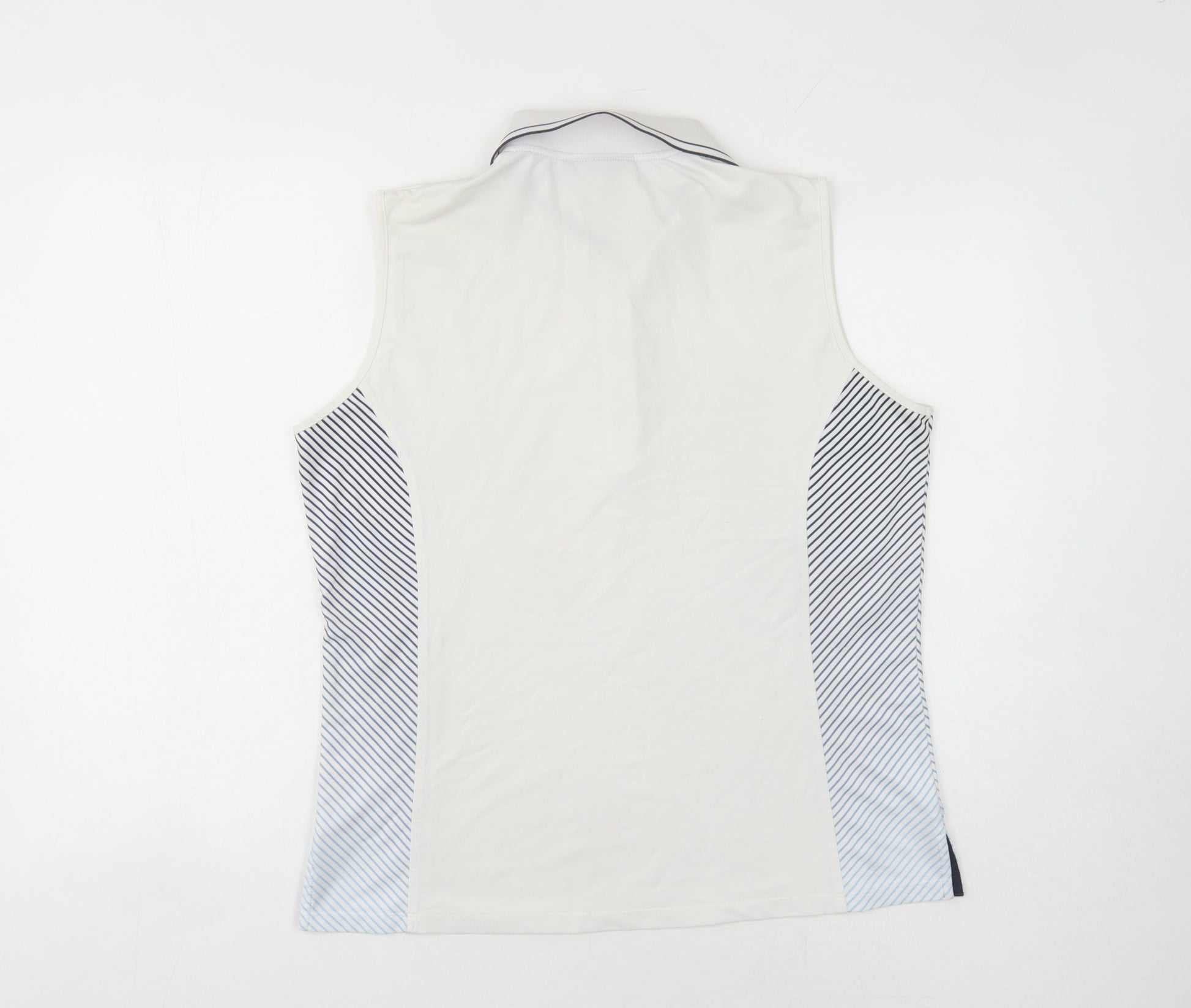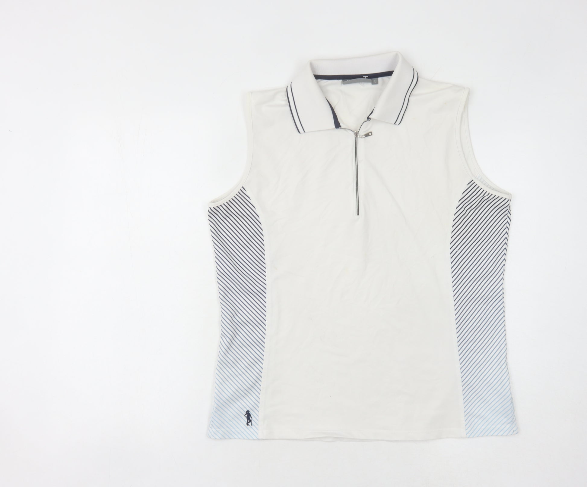 Step up your style with this Glenmuir sleeveless polo shirt, perfect for both men and women. Offering a blend of comfort and fashion, this white polo is designed with contrasting striped side panels that add a sporty touch. Ideal for spring and summer, the breathable polyester and elastane fabric ensure you stay cool during warmer days. Featuring a practical zip accent, the collared neckline adds an additional classic touch. Whether you're hitting the golf course or heading to a casual gathering, this versatile piece suits various occasions. Despite being pre-loved, its condition is very good with only a minor mark on the side that’s barely noticeable. Enjoy a regular fit designed for your comfort and easily maintain it with machine washing. Embrace this stylish, easy-to-wear piece that effortlessly combines practicality with chic design.