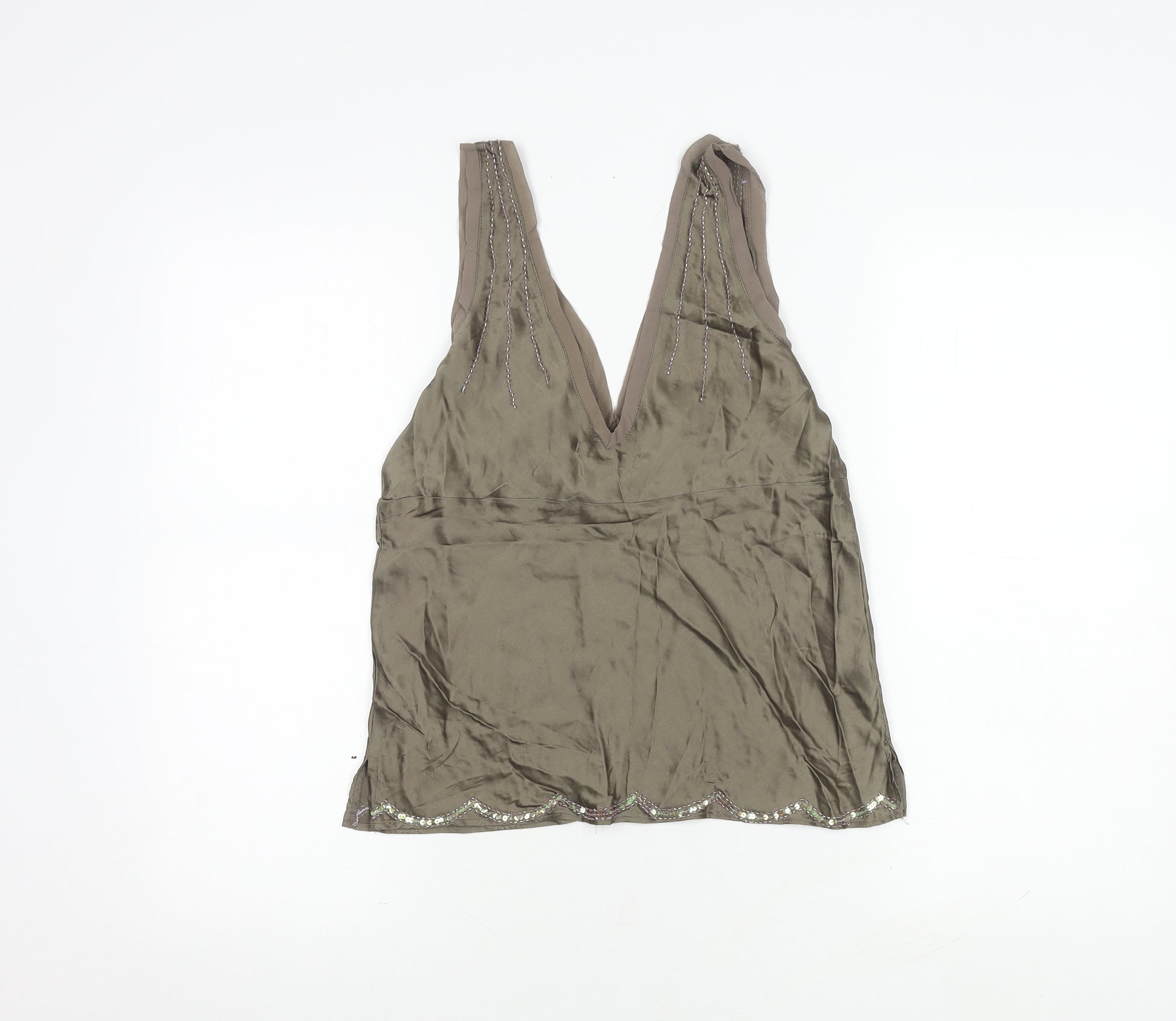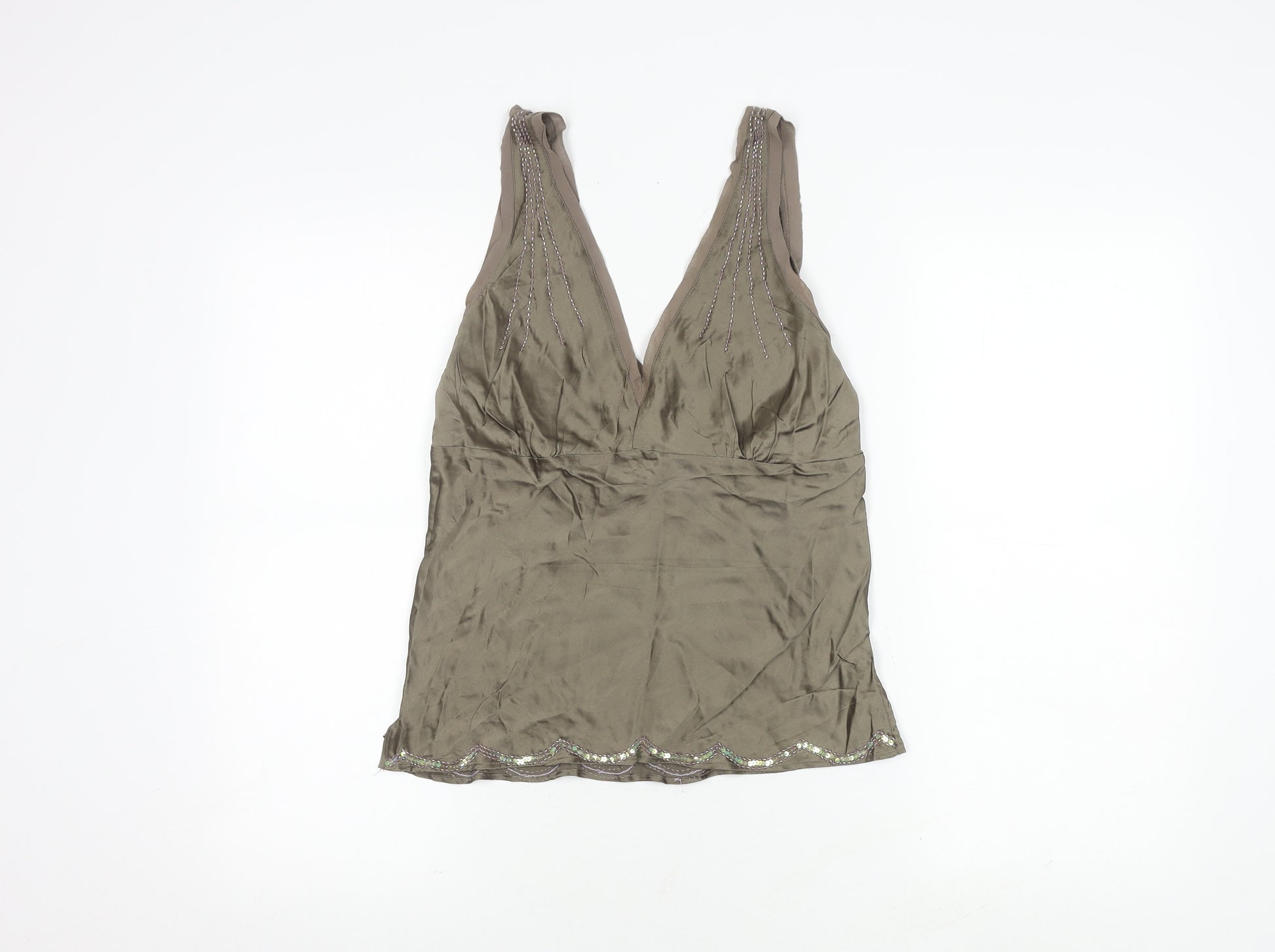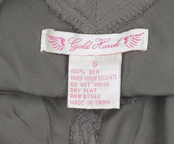 Elevate your style with this elegant Gold Hawk camisole top. Featuring a lightweight 100% silk fabric, this sleeveless camisole is perfect for the warm spring and summer seasons. Its rich brown hue and beaded accents add a touch of sophistication, making it ideal for both casual gatherings and cocktail parties. Designed for a regular fit, this top complements a variety of outfits, especially when paired with jeans or skirts. The V-neckline adds a modern flair, ensuring you stand out effortlessly. Although gently worn, the camisole remains in excellent condition, promising both comfort and style. Embrace the luxurious feel of silk and make this versatile piece a staple in your wardrobe.