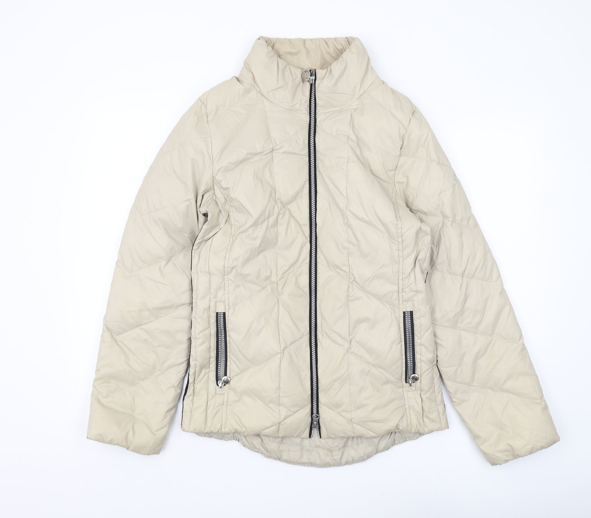 Explore comfort and style with this Golfino Women's Beige Puffer Jacket, ideally crafted for the fashion-conscious yet practical dresser. The jacket, tailored in a regular fit, promises not only warmth but an enviable chic look. Made entirely of polyamide, it ensures durability while the luscious down insulation ambitiously shields against chilly winds. Its classic puffer style and short length make a timeless statement, while the elegant beige hue adds a touch of subtlety, ensuring this jacket stands out wherever you go.The jacket features a convenient full zip closure along with zipped pockets, merging fashion with functionality. It's machine washable, guaranteeing ease of care while maintaining its pristine condition. Designed for both casual and chic occasions, this jacket is perfect for any woman's wardrobe who prioritizes both style and functionality during the colder months.Even though it wears signs of minor wear with a light mark at the back, it remains a key staple for those who cherish quality outerwear. Fill your autumn and winter wardrobe with this stylish yet enduring puffer jacket. Buy now to experience the harmonious blend of style, comfort, and functionality!