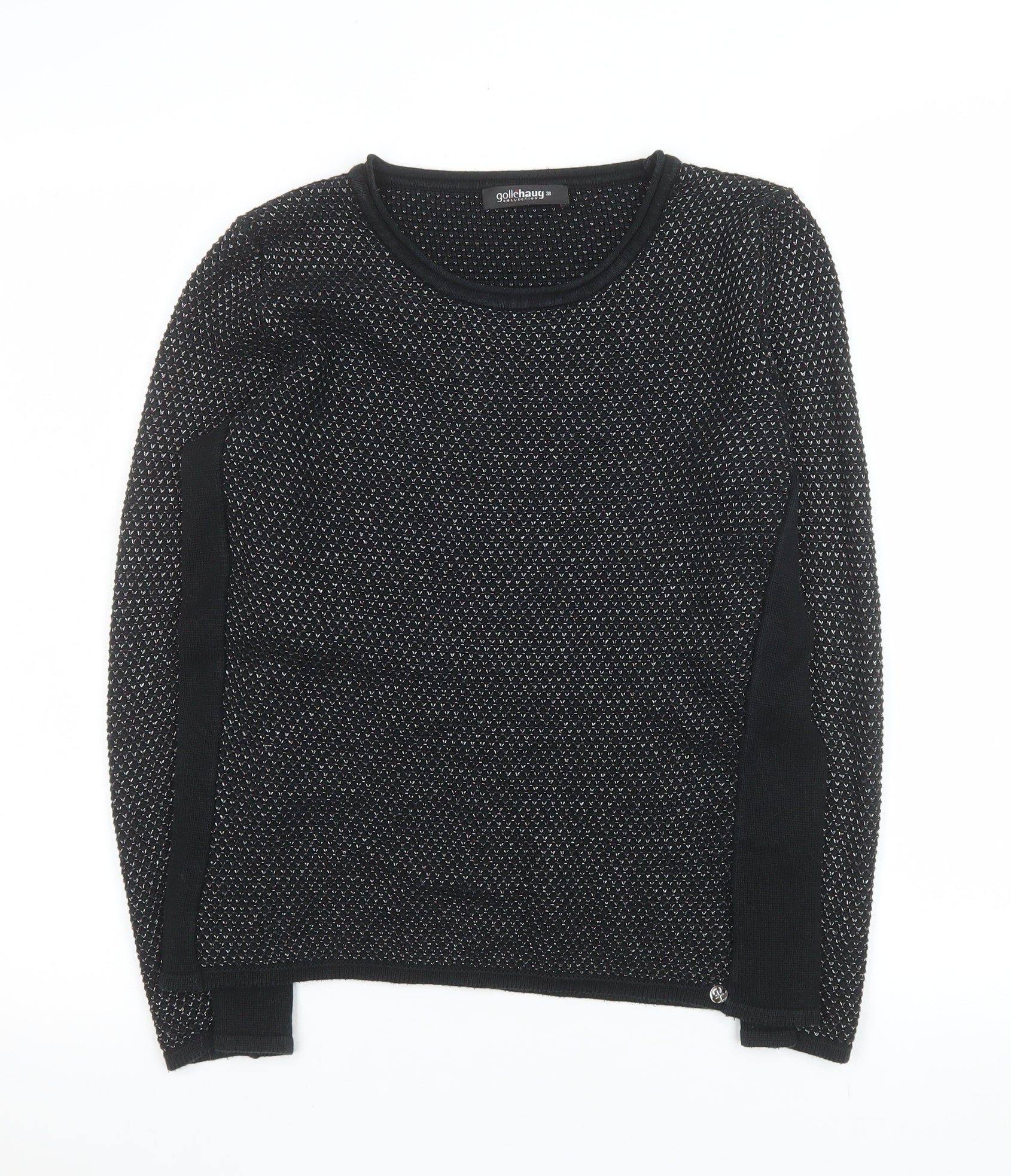 Add a touch of refined comfort to your wardrobe with this elegant black knit pullover by Gollehaug. Expertly designed for women, this beautifully textured jumper features a subtle geometric pattern in a tight-knit finish that ensures durability and style in equal measure. Its round neckline and long sleeves make it a versatile piece ideal for cooler seasons such as autumn and winter. Crafted from a premium blend of viscose, polyamide, acrylic, polyester, and elastane, the material offers just the right amount of stretch for a comfortable and flattering fit. The lightweight and breathable design ensures easy layering—perfect for pairing with jeans, tailored trousers, or skirts for both casual and smart-casual occasions. Tailored in a UK size 10 (EU 38), this Gollehaug jumper embodies the brand’s reputation for understated sophistication and top-quality knitwear. Its timeless silhouette ensures it remains a wardrobe staple, while the combination of materials offers durability and gentle softness against the skin. The minimalist design is accentuated by subtle tonal detailing down the sides, offering a flattering shape without sacrificing comfort. This beautifully made knit pullover is machine washable for easy care, making it a practical choice for everyday wear. In excellent pre-owned condition with very light signs of general wear, it retains its rich colour and refined feel. The jumper’s sleek aesthetic makes it perfect for dressing up or down—wear it alone or layered under a blazer for an elevated seasonal look. Whether for a casual outing, office wear, or a relaxed weekend ensemble, this Gollehaug jumper delivers style, comfort, and versatility in one thoughtful design. A must-have piece that brings both warmth and elegance to any woman’s knitwear collection.