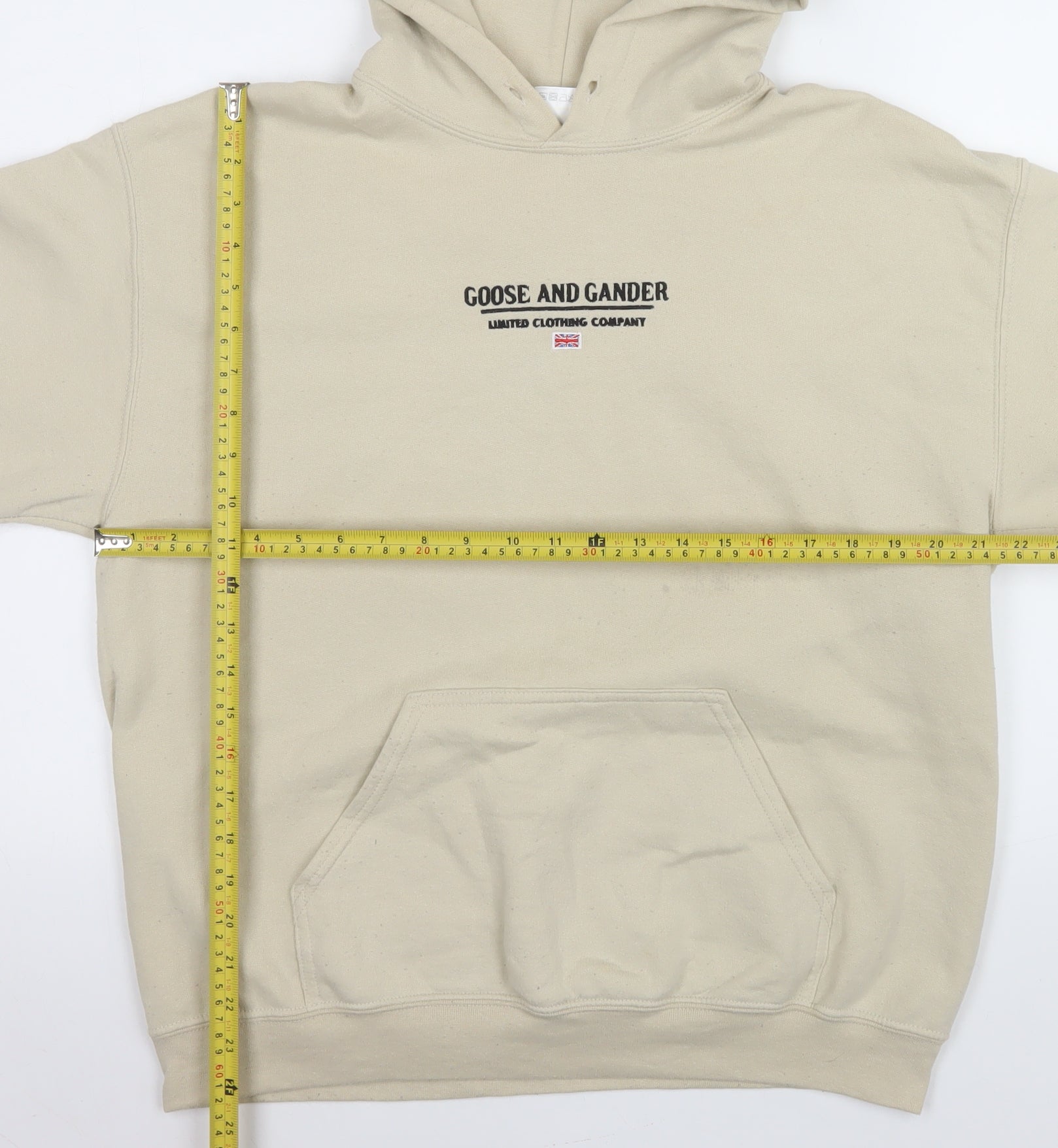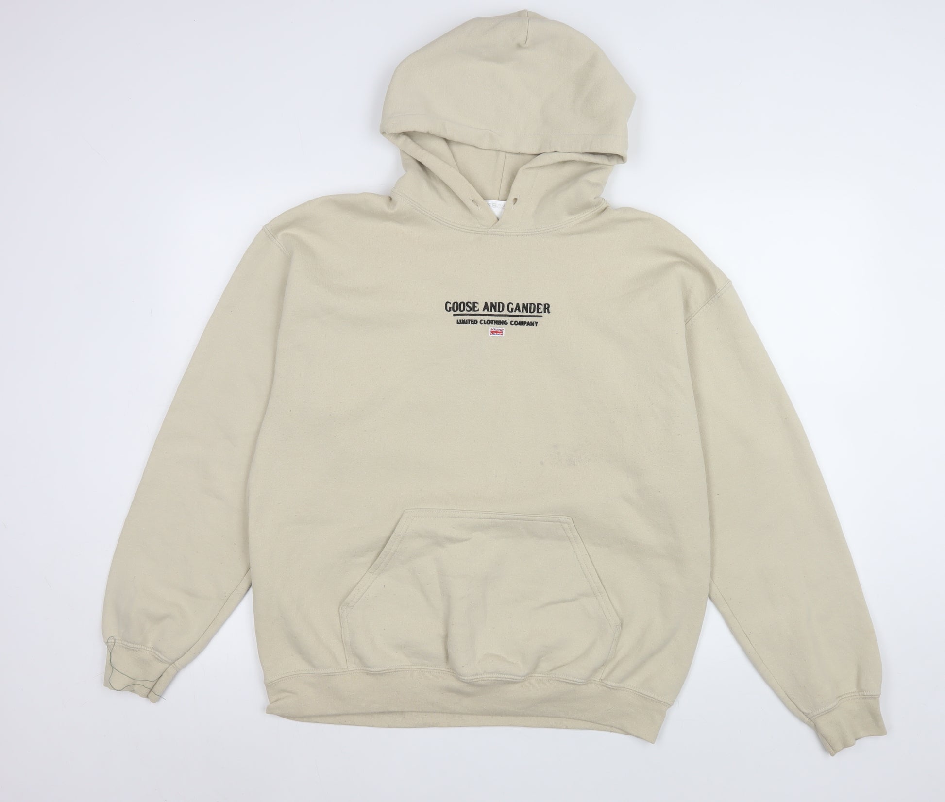 Show off your laid-back style with this Goose and Gander men’s pullover hoodie in soft beige. Designed for comfortable everyday wear, this fleece hoodie features a simple yet iconic embroidered logo across the chest, embodying the classic British casual aesthetic that Goose and Gander is known for. Made from a cosy cotton and polyester blend, it offers warmth and breathability for all seasons, particularly suited to cooler spring, autumn, and winter days. The relaxed regular fit makes it ideal for layering, while the hood with drawstring and kangaroo front pocket add functionality and streetwear appeal. The beige tone makes this hoodie easy to pair with jeans, joggers, or shorts, creating a versatile look for casual outings, university wear, or lounging at home. It has ribbed cuffs and a waistband to help keep its shape and retain warmth. The soft fleece interior provides a comfortable feel against the skin, adding extra insulation on cold days. Although gently worn, the hoodie remains in very good condition with only small signs of light wear and subtle marks on the front area that do not detract from its overall style or comfort. Compatible with machine washing, this durable piece maintains its quality even after multiple wears. The Goose and Gander brand represents authenticity and local craftsmanship, making this hoodie an excellent addition for individuals who appreciate timeless, minimalist design. Whether you’re heading to classes, running errands, or relaxing on the weekend, it’s a staple piece that combines practicality and contemporary style. Add this neutral-toned hoodie to your wardrobe for effortless comfort and everyday layering potential.