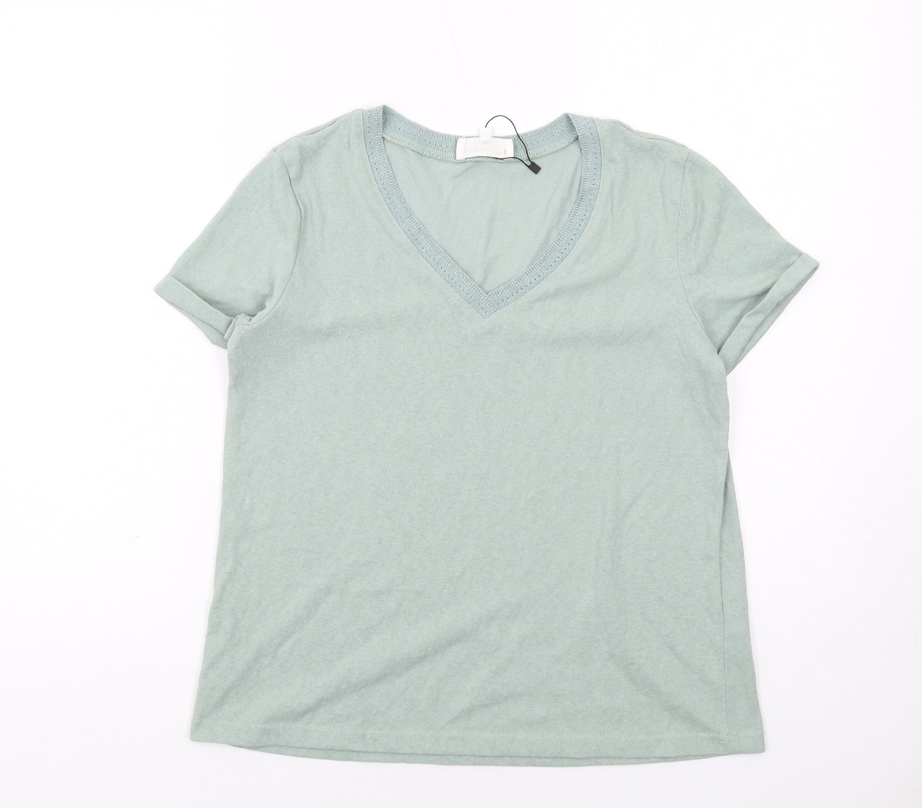 Womens Green Cotton Basic T-Shirt Size M V-Neck