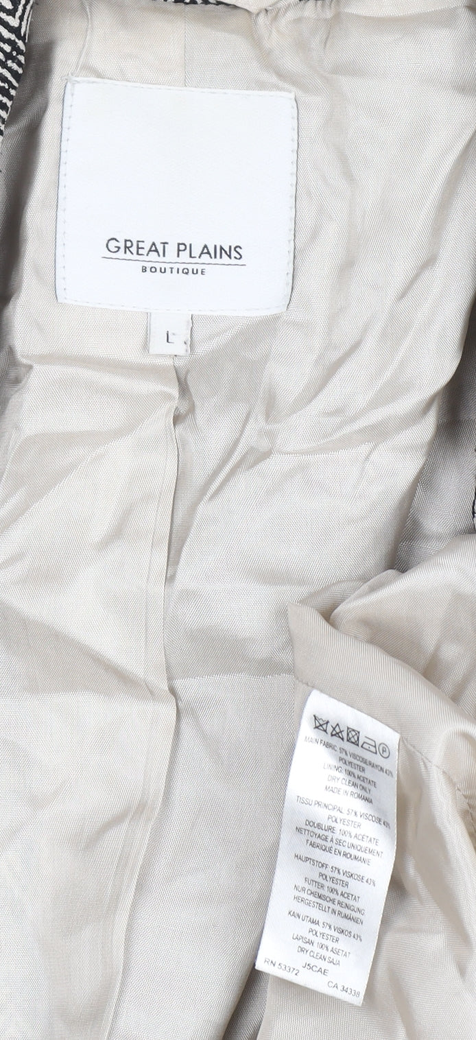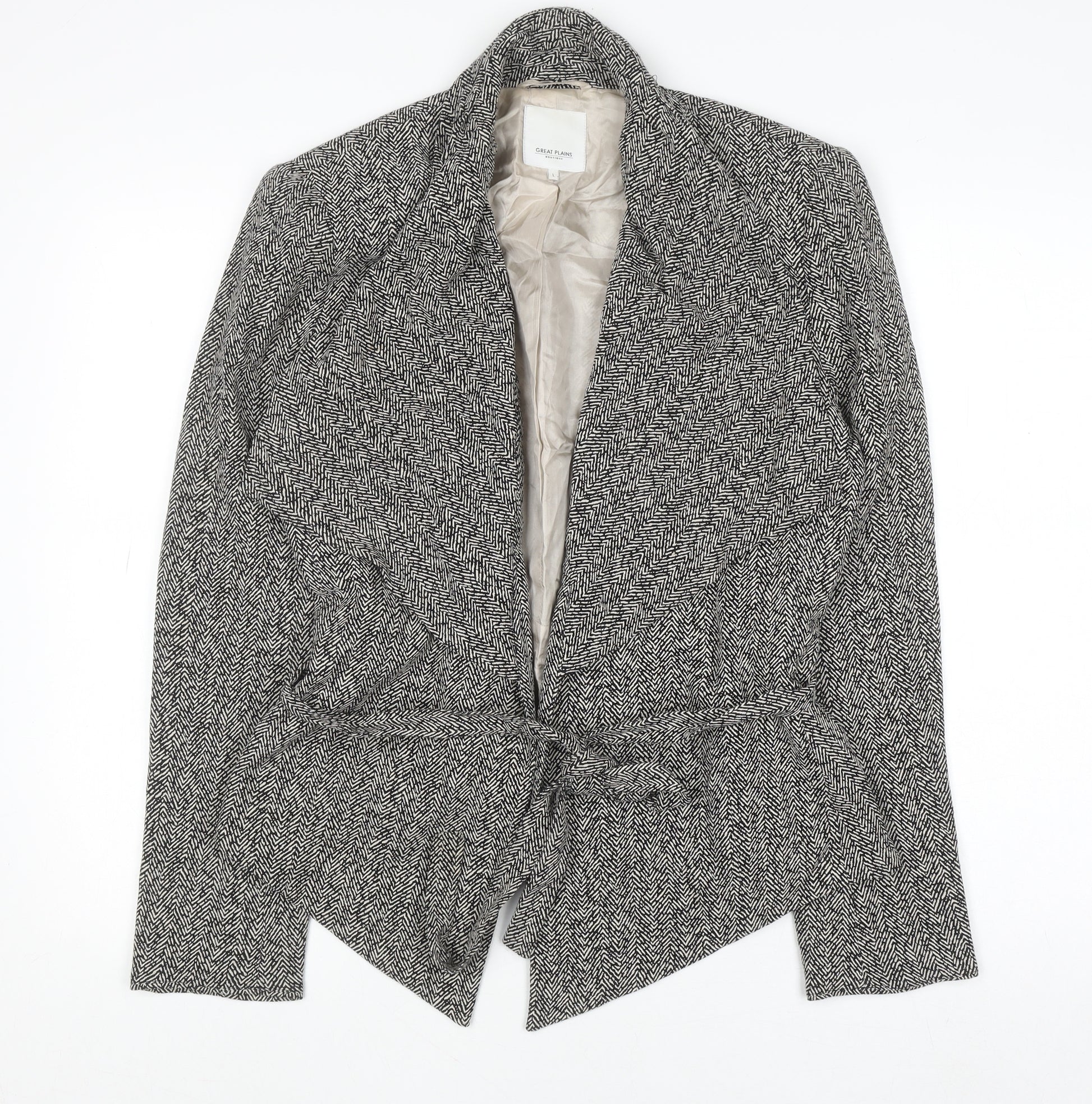 This sophisticated grey herringbone blazer by Great Plains offers a timeless and versatile addition to any woman's wardrobe. Expertly tailored with a belted waist for a flattering fit, this jacket combines both style and practicality. Crafted from a soft blend of viscose and polyester, it provides comfort and a refined structure perfect for both smart and casual settings. The fully lined interior, made from smooth acetate, ensures a premium finish with added durability. The classic herringbone weave gives the blazer a subtle texture and an effortlessly elegant look, ideal for business meetings, formal gatherings, or weekend outings. Designed with a collared neckline and a tie-front closure, it allows adjustable styling while maintaining a polished silhouette. Its mid-length cut offers a contemporary appeal, balancing professionalism with relaxed charm. Suitable for autumn and winter wear, the blazer pairs well with trousers, skirts, or tailored jeans for a complete ensemble. In excellent pre-owned condition with minimal signs of wear, this Great Plains piece exemplifies understated sophistication. A must-have for those who value refinement, comfort, and enduring style, the blazer will seamlessly complement both office attire and casual layers. For those seeking a classic wardrobe staple that exudes femininity and confidence, this Great Plains herringbone belted blazer is the ideal choice, bringing together quality materials, fine British design, and timeless appeal.