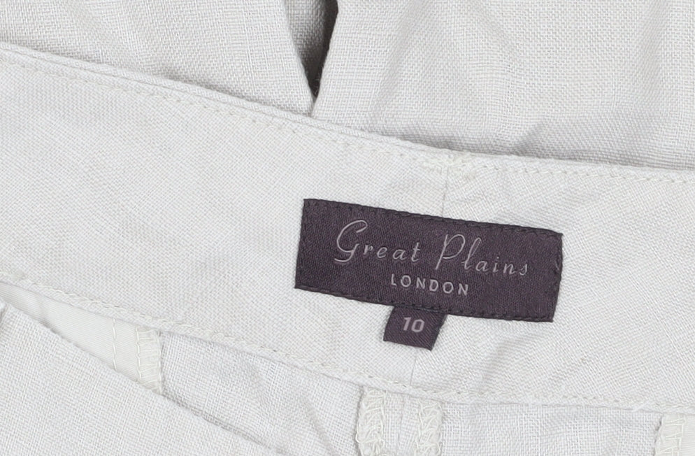 Discover the relaxed elegance of these Great Plains Women's Beige Trousers, size 10. Crafted from 100% linen, these trousers offer exceptional comfort and breathability, making them a perfect choice for spring and summer. The classic beige hue adds a versatile and sophisticated touch to your wardrobe, allowing you to pair these trousers with a variety of tops and accessories. These trousers feature a button and zip closure, providing a secure and comfortable fit. With a no-pattern design, they exude a minimalist charm that embraces simplicity and style. Whether you're heading out for a casual day trip or enjoying a relaxed evening, these trousers are your ideal companion. Despite being slightly wrinkled, these trousers are in very good condition and have been gently used, ensuring a quality addition to your collection. Embrace the essence of casual chic with this timeless piece from Great Plains and elevate your everyday fashion effortlessly.