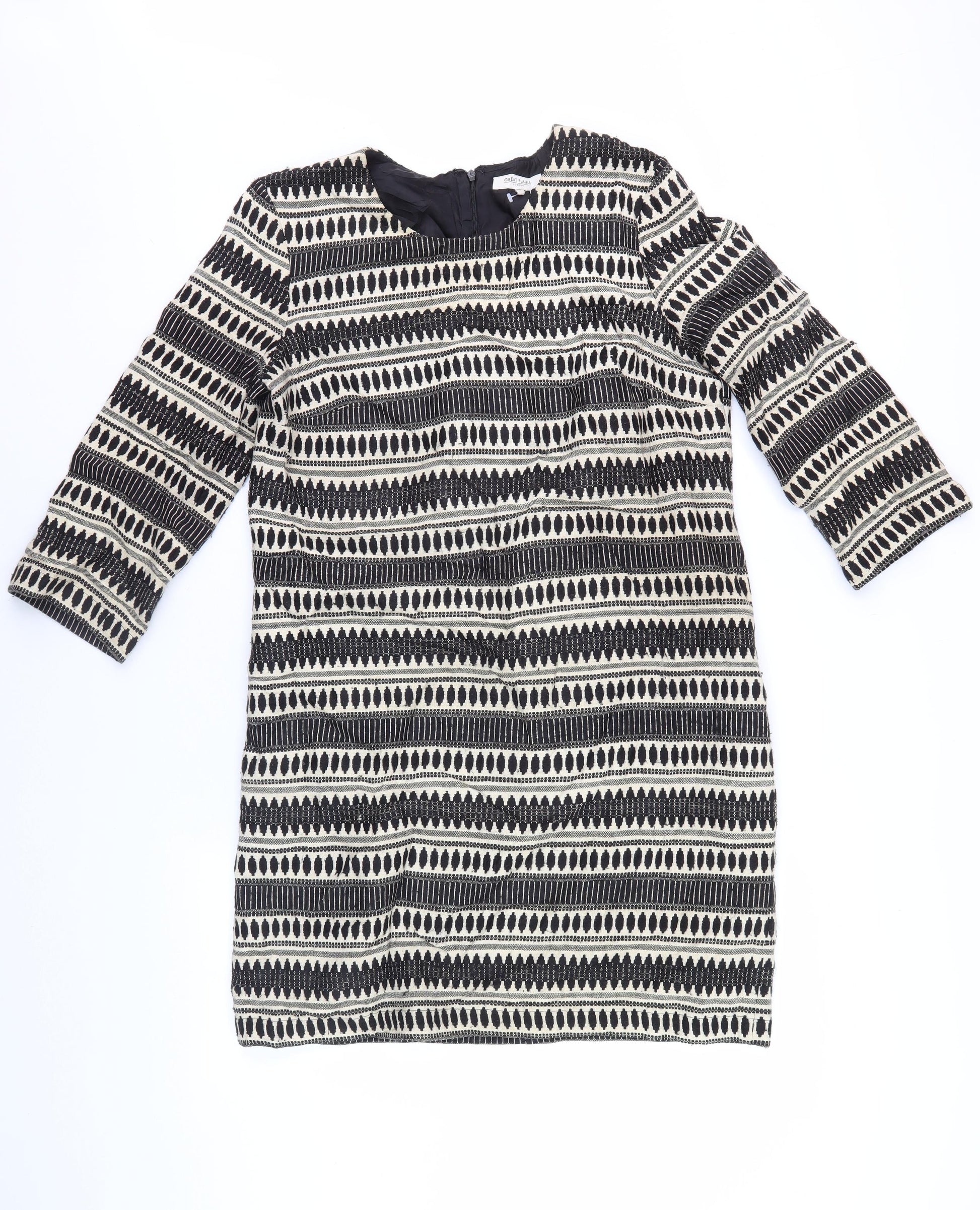 Discover elegance with this Great Plains sheath dress in size M, perfect for any stylish wardrobe. Featuring a captivating black geometric pattern, this dress is tailored for women who appreciate classic sophistication. The round neck and 3/4 sleeves ensure a versatile and comfortable fit, making it ideal for various occasions from casual gatherings to formal settings. Crafted from a blend of cotton and acrylic, the fabric offers a luxurious feel while ensuring durability. The dress is fully lined for added comfort and a polished look. Its zip closure at the back adds a touch of practicality without compromising style. With excellent condition and no visible wear, this exquisite piece is ready to enhance your collection. Pair it with your favourite heels or flats for a chic ensemble that transitions seamlessly from day to night.